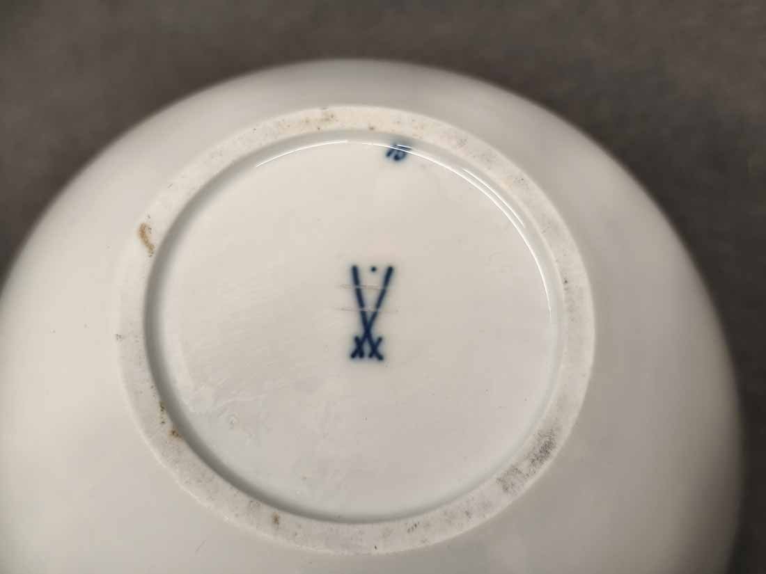 Meissen, Teekanne, Dekor Weinlaub. Um 1920-30, Schwertermarke mit Punkt. Kanne ohne Beschädigungen, ein Blatt der Deckelrose am Rand etwas bestoßen. Schwertermarke der Manufaktur Meissen zwei x gestrichen. L. (Tülle-Henkel) 23 cm, H. ca 12,5 cm, ca 1 l.