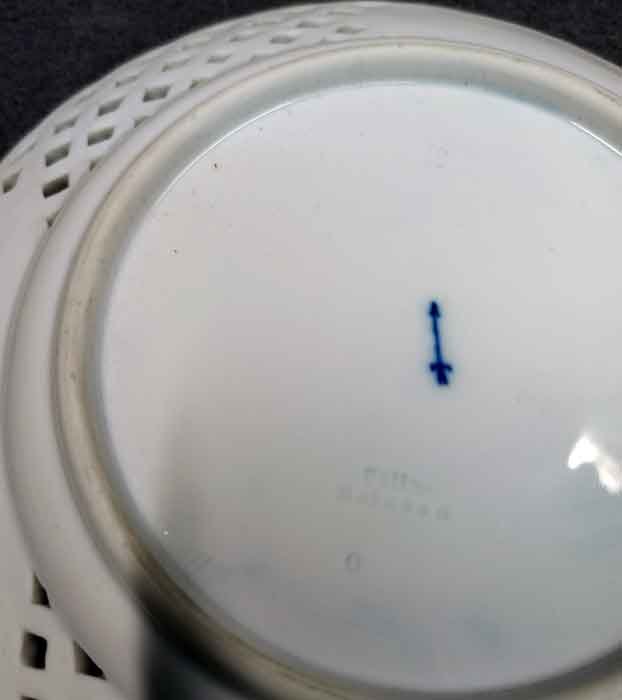 Gemarkt mit Teichermarke Pfeilkreuz in Blau und geprägt "Cölln Meissen" unter Glasur.