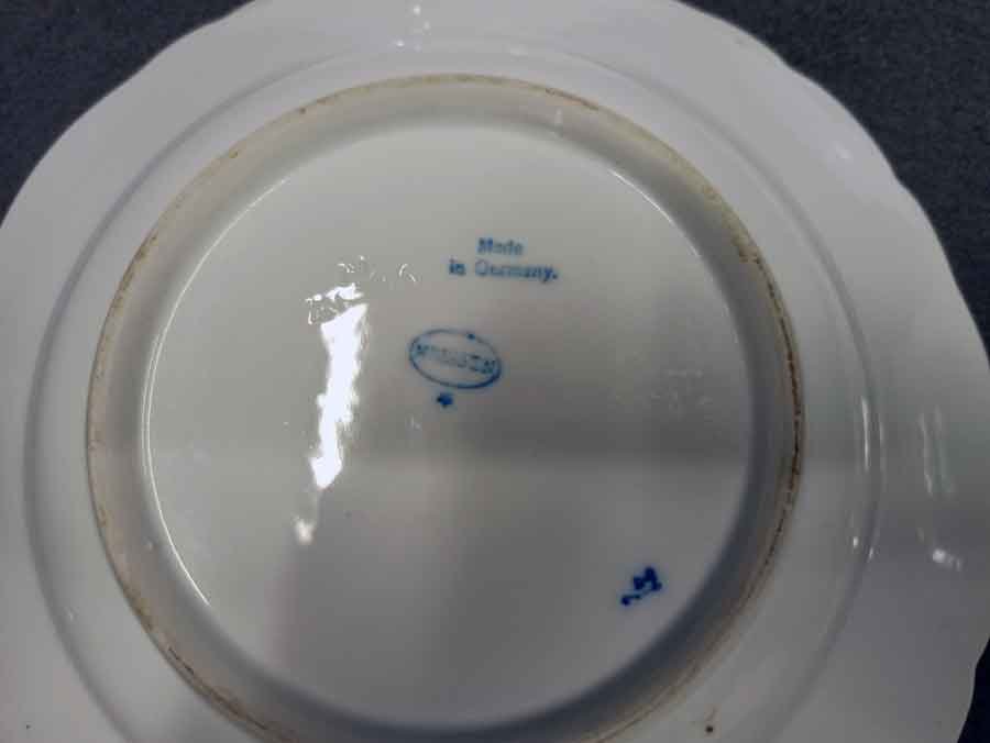 Ovale Teichermarke mit Schriftzug "Meissen" in Blau, teilw. mit Pressmarke "Meissen" u.a. Beizeichen
