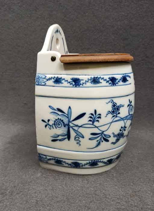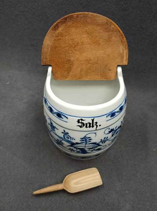 Meissen Teichert, Zwiebelmuster; Salz Vorratsgefäß Metze für die Wand. Leicht ovoider Gefäßkörper mit Holzdeckel. Sehr guter Zustand. Gemarkt, blaue Teichertmarke Schriftzug "Meissen" im Oval. H. 20/16 cm, B. 15 cm, T. 12 cm.