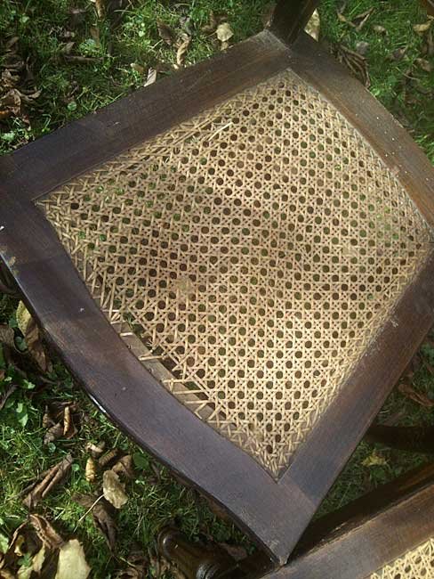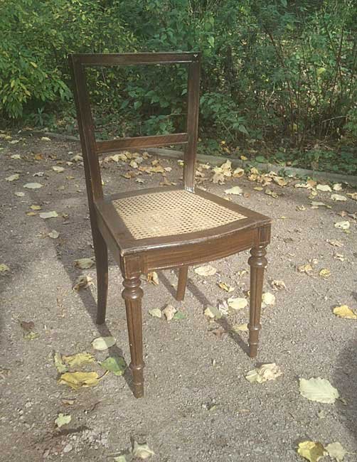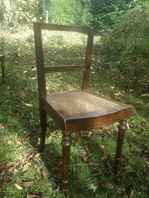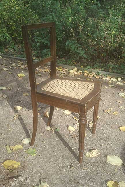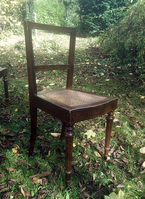 Schöne Stühle, mit kleinen, aufwändigen Details; kannelierte Beine, Eckverzierungen, gebogene Vorderzarge. Guter Zustand mit Gebrauchsspuren, benutzbar. Die Stühle sind um 1900 farblich neu gefasst und mit der damals üblichen Holzmalerei versehen worden.  An einem Stuhl ist das Geflecht vor etwas eingerissen. Abgabe auch als 2er oder 4er Satz. Je 75,- Euro. Der defekte preiswerter.