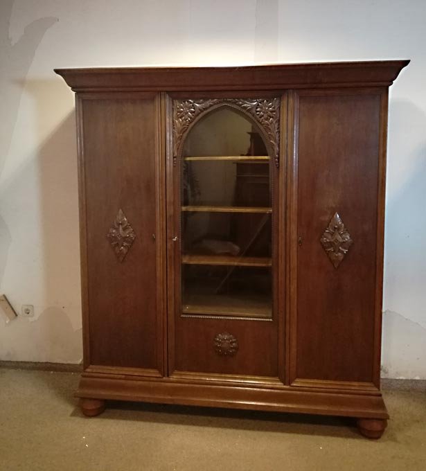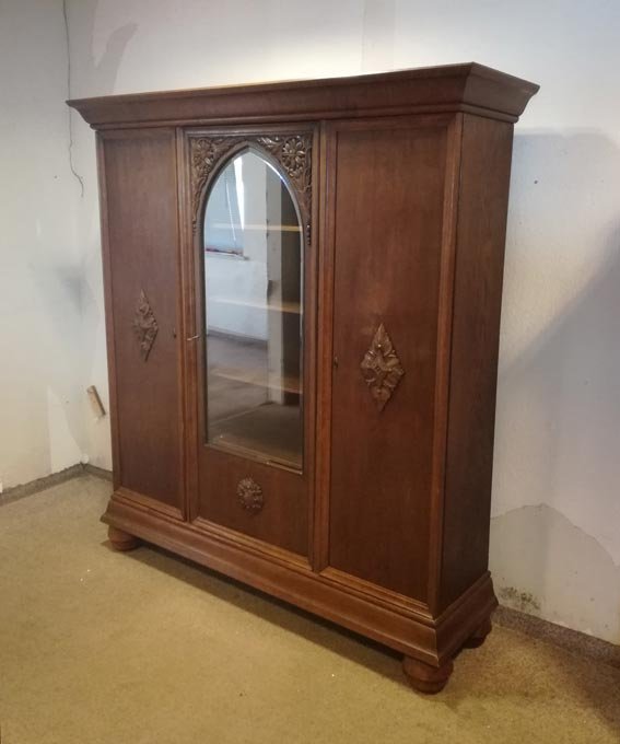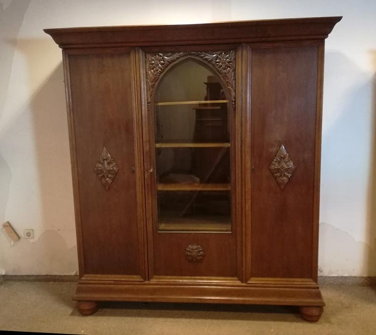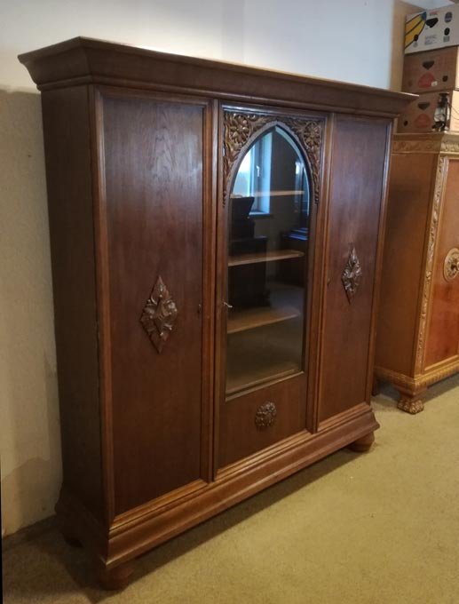 Bücherschrank um 1910, Eiche. Bücherschrank mit Schnitzereien und facettierter Scheibe. Guter Zustand, sofort nutzbar mit normalen Nutzungsspuren. Hinter den Türen je 5 Einlegebretter, höhenverstellbar. H. 192 cm, B. 169 cm, T. 45 cm.