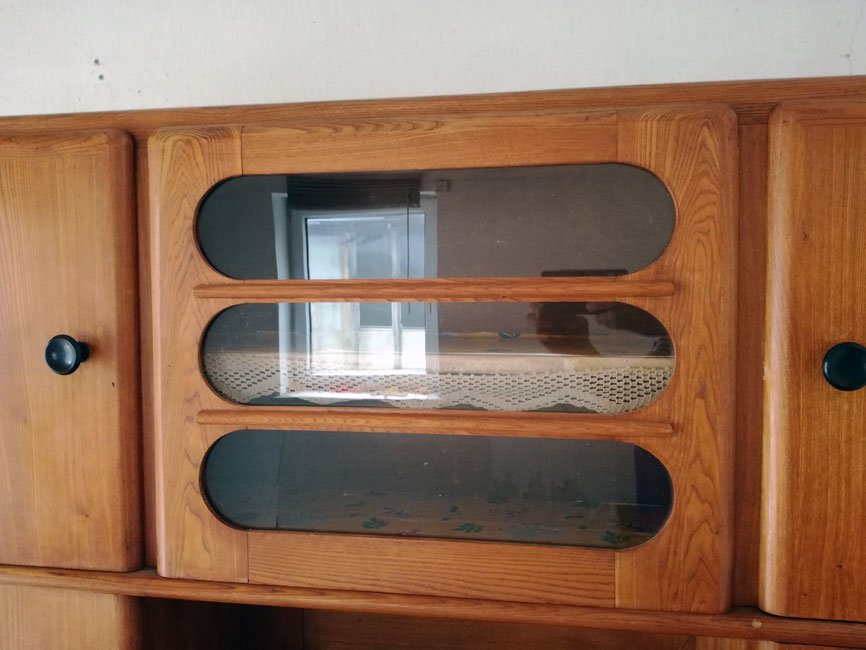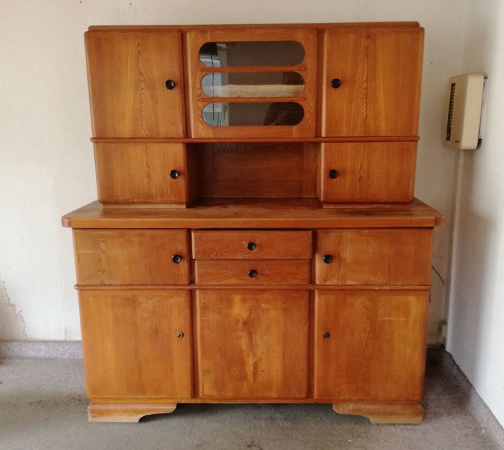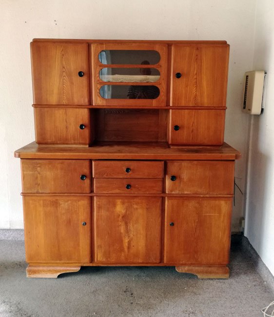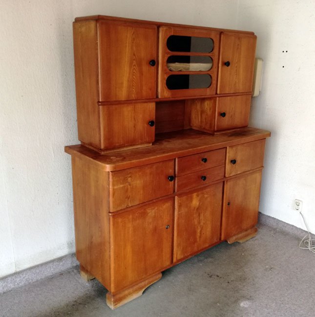 Küchenbuffet ca 1930 in gutem Zustand. Unrestauriert, aber i.O. H. 177cm, B. 160 cm, T. 50cm, (Oberteil T. 32 cm, H. nur Unterteil 98 cm).