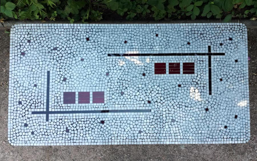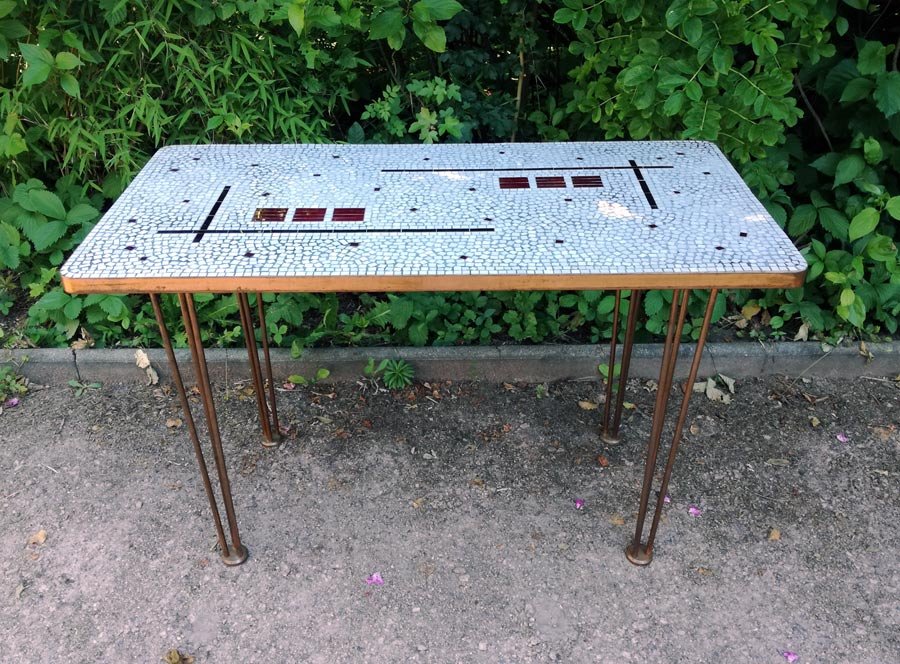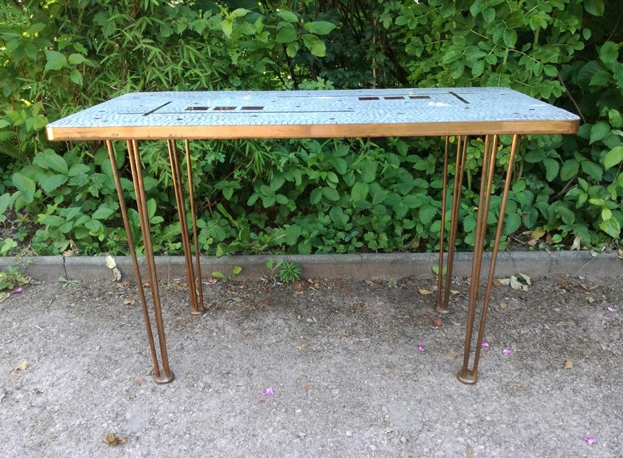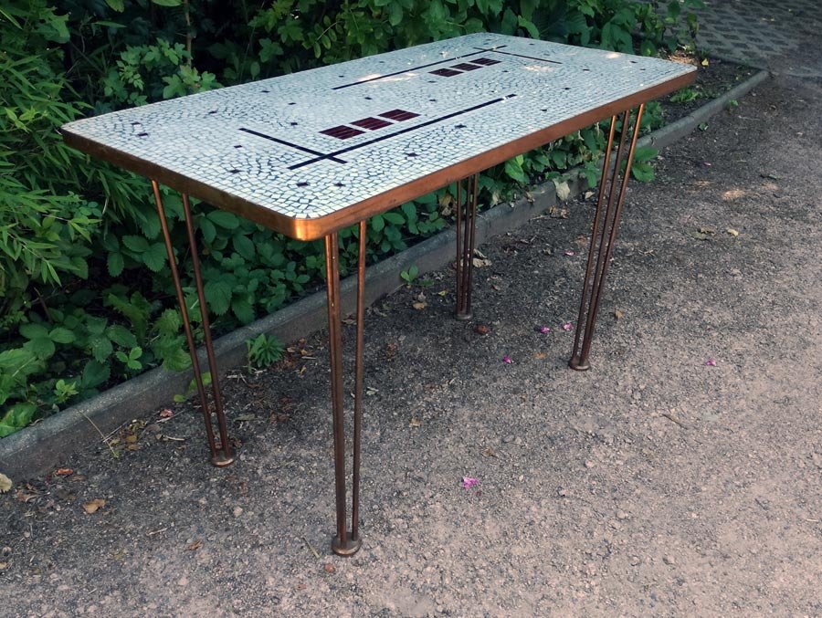 Mosaikkachel-Tisch aus den 70er Jahren. Guter Zustand. H. 64 cm, B. 102 cm, T, 51 cm.