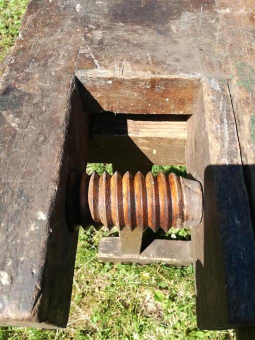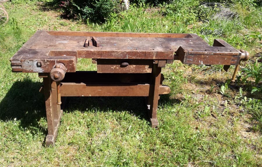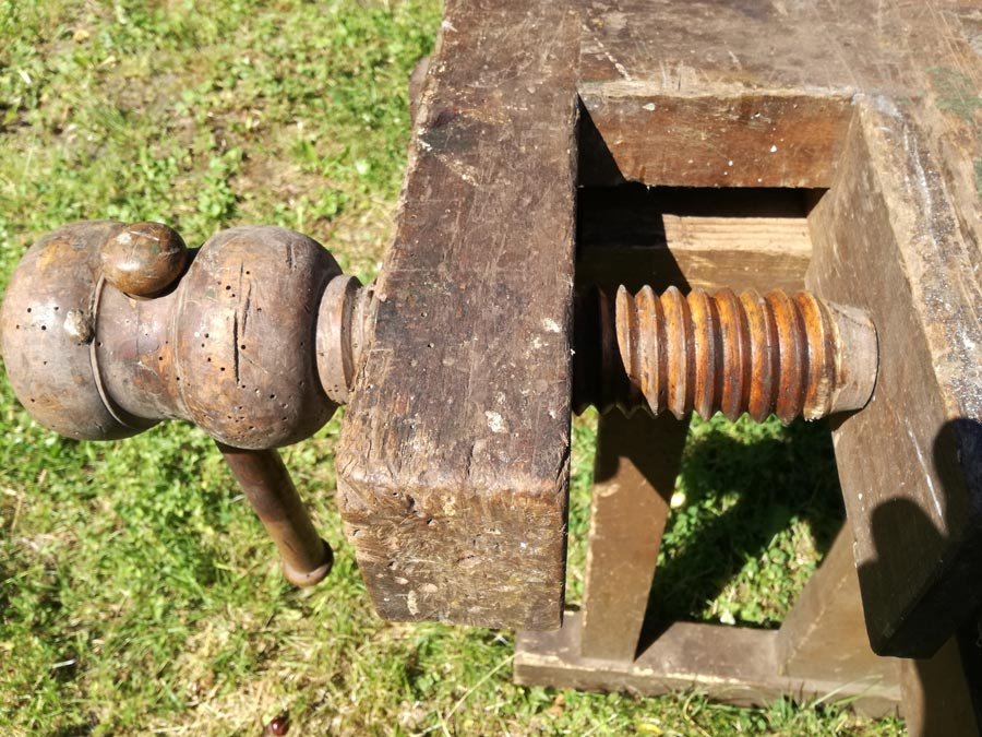obelbank, Tischlerbank, massiv und schwer. Alte Hobelbank mit Holzspindeln. H. 80 cm, B. 180, T. 55/90 cm. Guter Zustand, mit Gebrauchsspuren etc. partiell Anobienspuren.