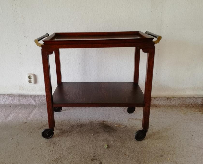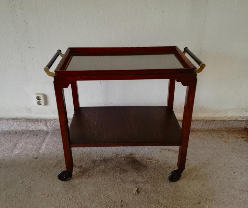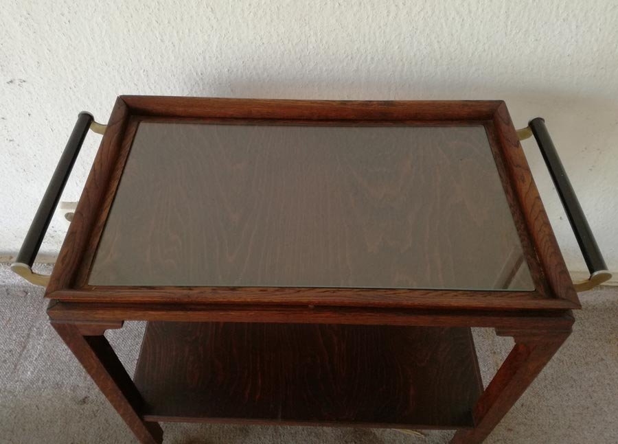 Servierwagen oder Teewagen um 1930. Eiche Gestell auf Rädern, oben mit Glasplatte, beidseitig zeitgen. Griffe. Sehr guter Zustand. H. 70 cm, B. 72 cm (mit Griffen) , T. 40 cm