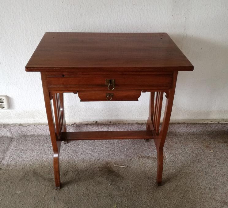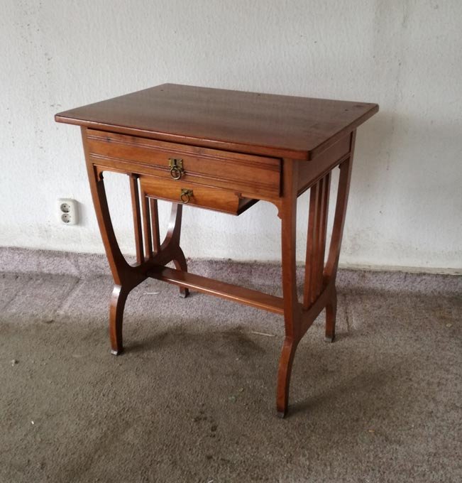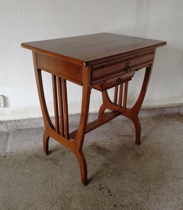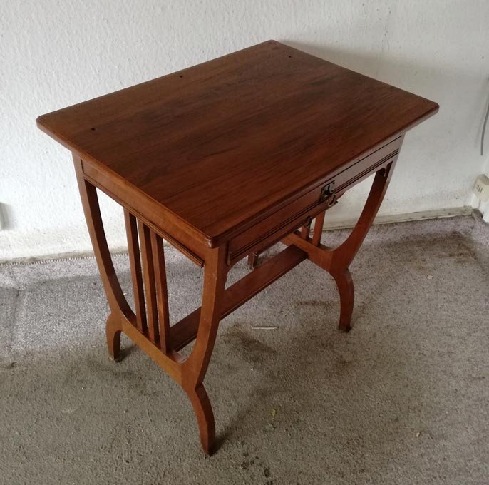 Jugendstil Tischchen, Nussbaum um 1900. Kleiner Nähtisch H. 77 cm, B. 70 cm, T. 50 cm. Sehr guter, Zustand, dem Alter entsprechend mit geringen Gebrauchsspuren. Auf der Platte 3 kl. Löcher verm. einer ehemaligen Applikation.