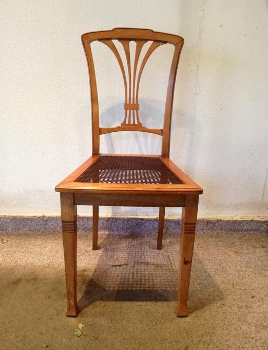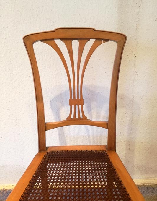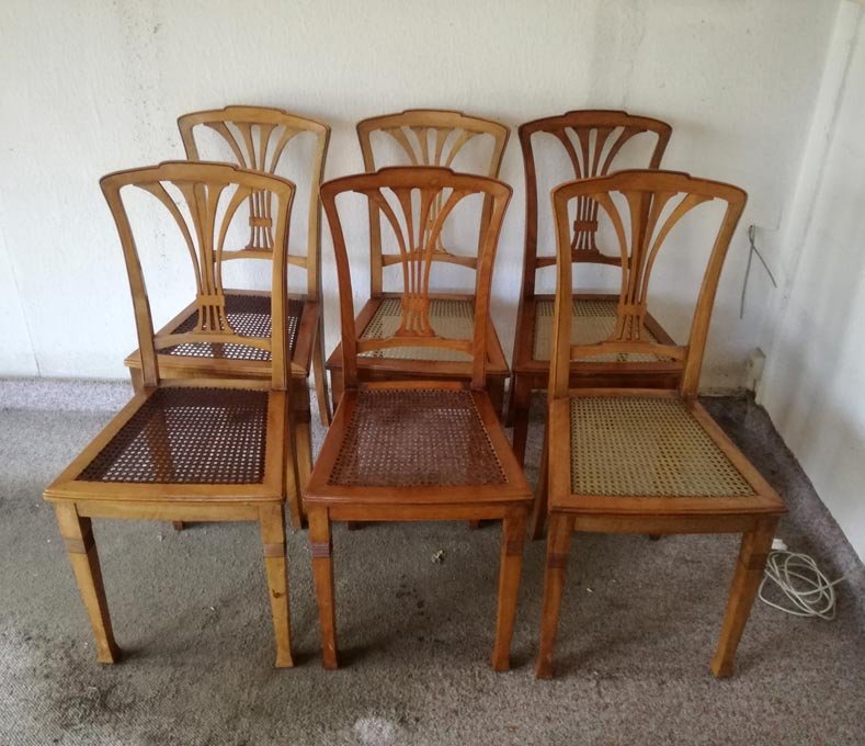 Ausziehtisch mit sechs Stüheln Jugendstil, Nussbaum um 1910. Die Möbel gehören original zusammen. Guter Zustand, unrestauriert mit normalen Gebrauchsspuren, sofort nutzbar. Geflechte der Stühle i.O., die Auszugmechanik des Tisches funktioniert problemlos. Tisch: H. 79 cm, B.87 cm, L. 128 / max 245 cm. Stühle; Sitz H. 47,5 cm, B. 43, T. 42; Lehnenhöhe 94 cm.