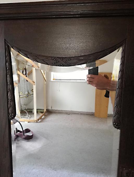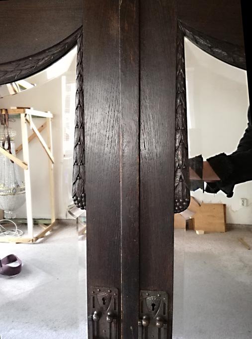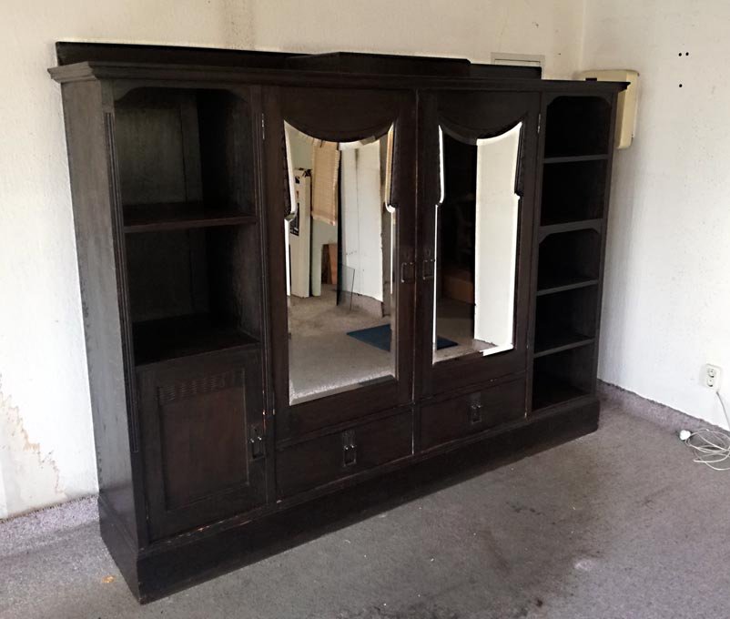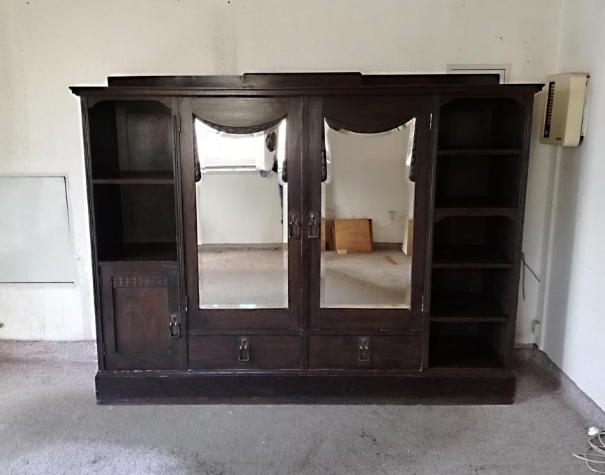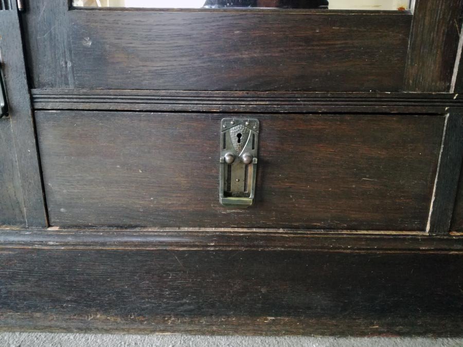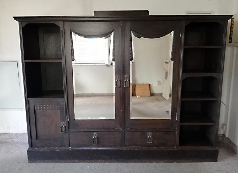 Bücherschrank oder Regal, Eiche um 1910. Eine sehr schöne, unsymetrische Aufteilung. In der Mitte zwei verspiegelte Türen, rechts Regal und links Regal, unten mit kleiner Tür. Zusätzlich unten zwei Schubkästen. Türen mit original Spiegeln, diese mit Facettschliff. Hinter den Türen 3 höhenverstellbare Regalbretter. Rel. niedriges Möbel. H. ca 155 cm, B. 205 cm, T. 44/47 cm. Guter Zustand mit kleineren Mängeln, sofort nutzbar.