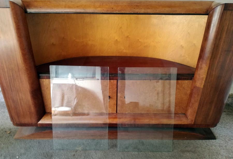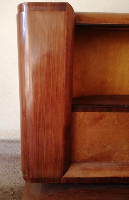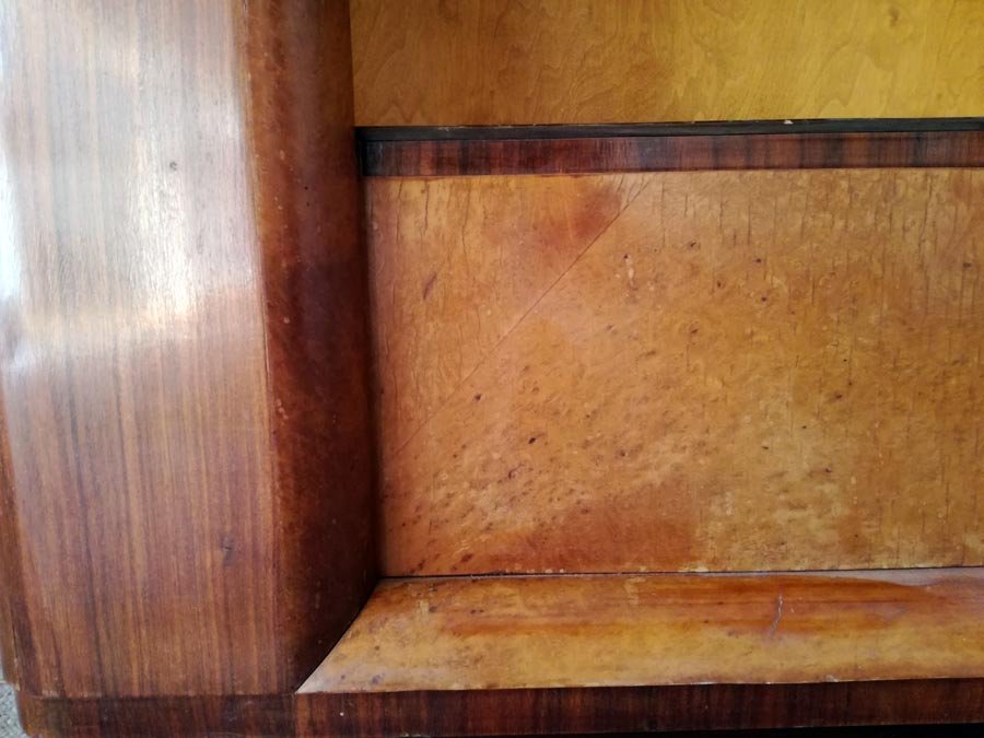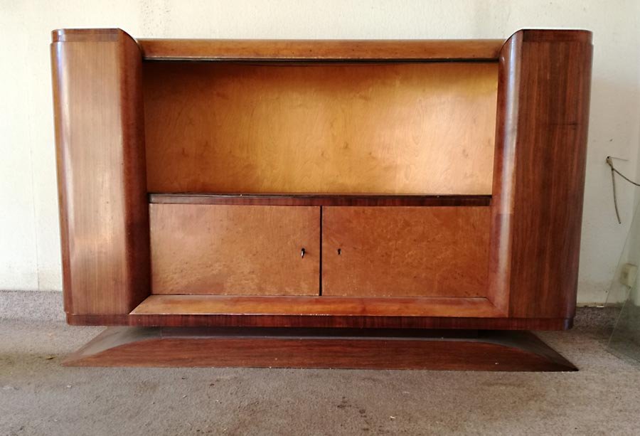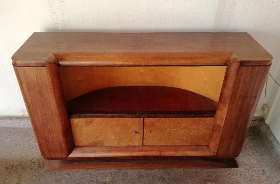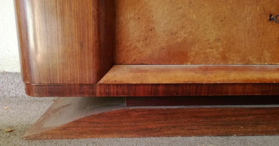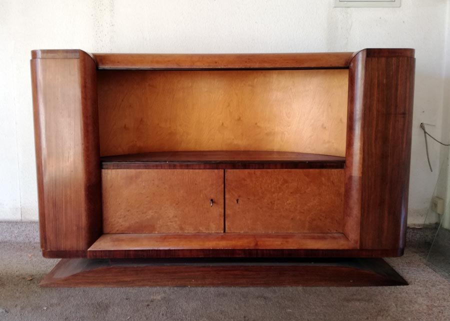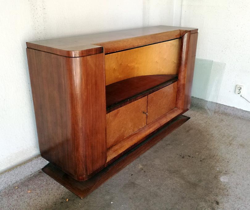 Art Deco Sideboard. kleines Buffet, um 1920-30 vermutl. Frankreich. Oben zwei Glasschiebetüren (auf den Fotos nicht eingesetzt aber vorhanden), unten zwei Türen. Nuß- Maserholz und Ahorn?- Wurzelholz.