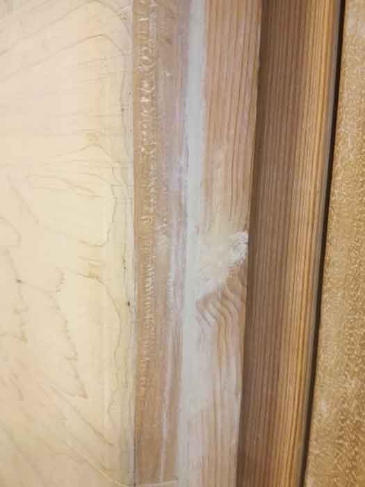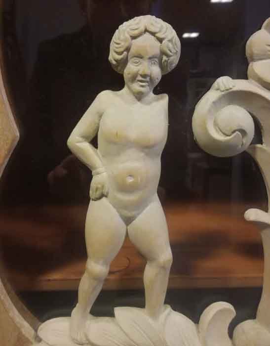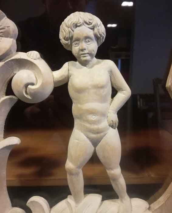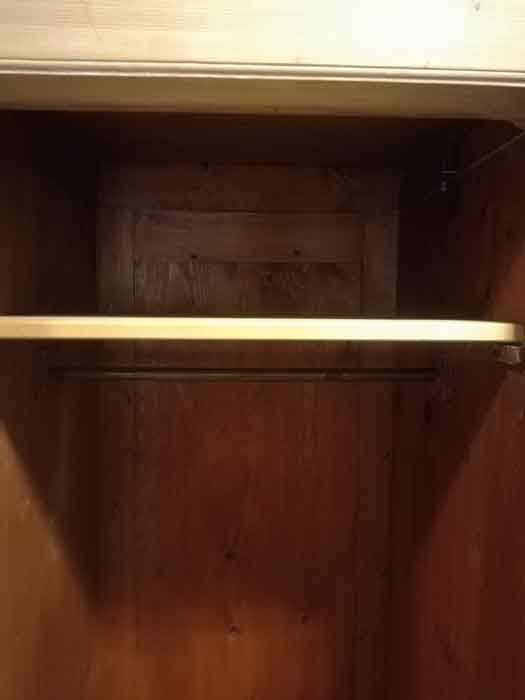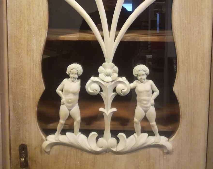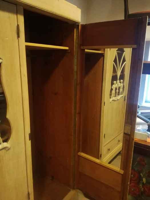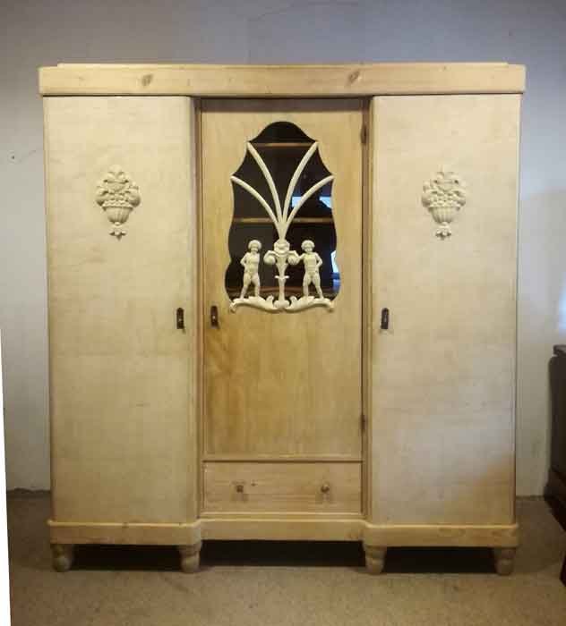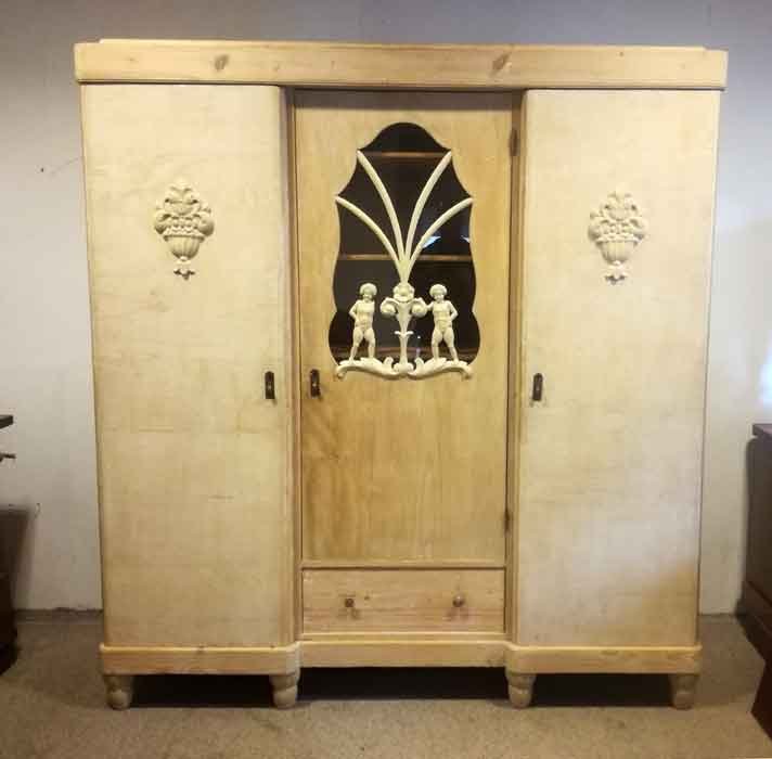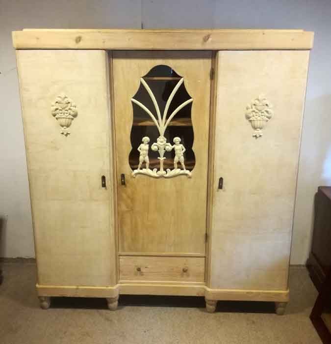 Schrank mit figürlichen Schnitzereien um 1910. Mittlere Tür mit Glas. Rechte und linke Seite mit Kleiderstange, in der Mitte Regalbretter, höhenverstellbar. Eine Tür mit Spiegel innen. Guter Zustand mit alteresentsprechenden Nutzungsspuren. Sehr geringer Rest Aufwand. Der Schrank wurde komplett abgeschliffen. Kleine Farbreste vorhanden. Demontierbar. H. 190 cm, B 180 cm, T. 60 cm