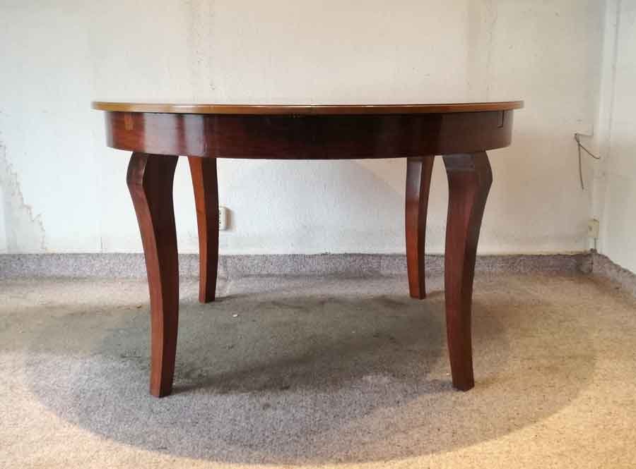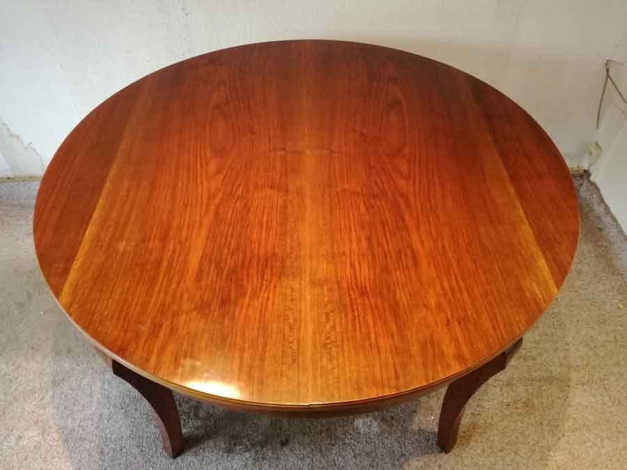 Großer Ausziehtisch, doppelt ausziehbar um 1920. Runder Tisch stufenweise um zwei ein-/ausklappbare Platten erweiterbar. Sehr guter Zustand sofort nutzbar. Tisch H. 79 cm, D. 129 cm, erweiterbar um 2x 45 cm, also 174 cm und 220 cm.