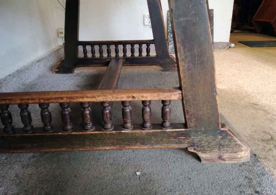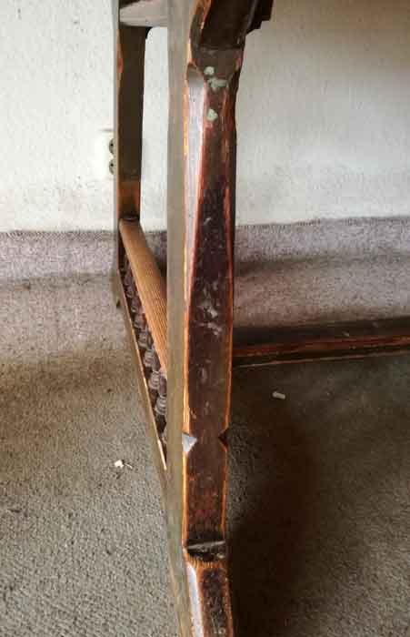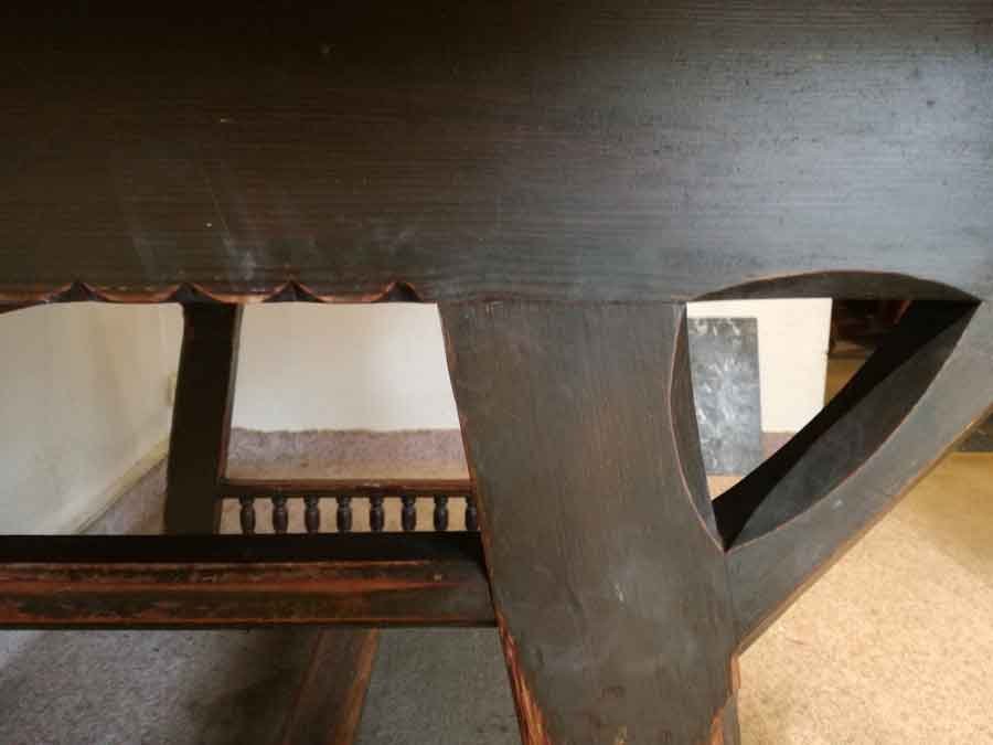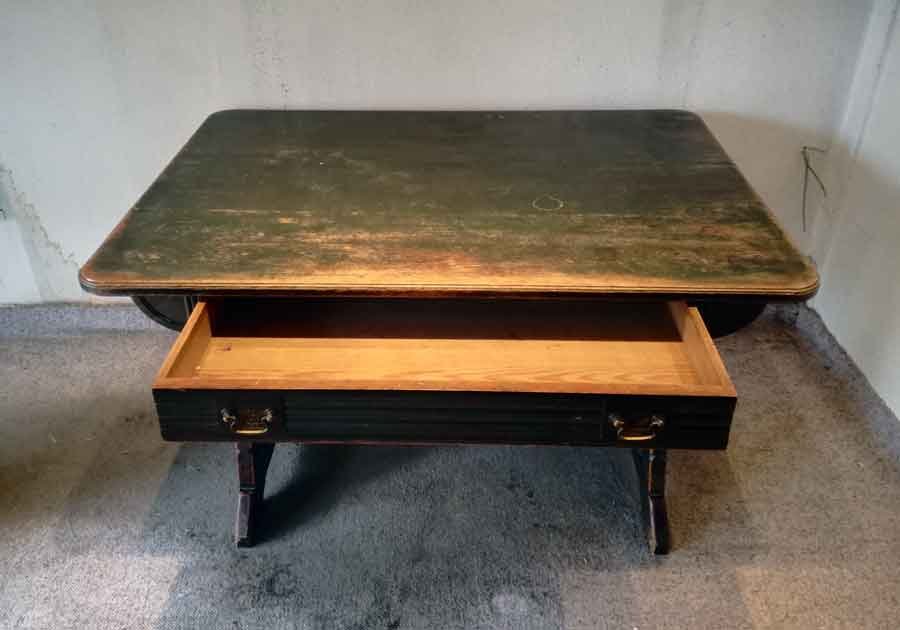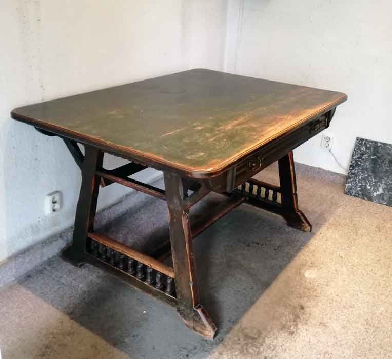 Interessanter Tisch, schönes Modell in seltener Ausführung. Großer Schubkasten. Grün lasierte Oberfläche, verm. original, mit Gebrauchsspuren und Farbabrieb, sehr charmant. Unrestaurierter, guter Zustand je nach Gusto sofort nutzbar.