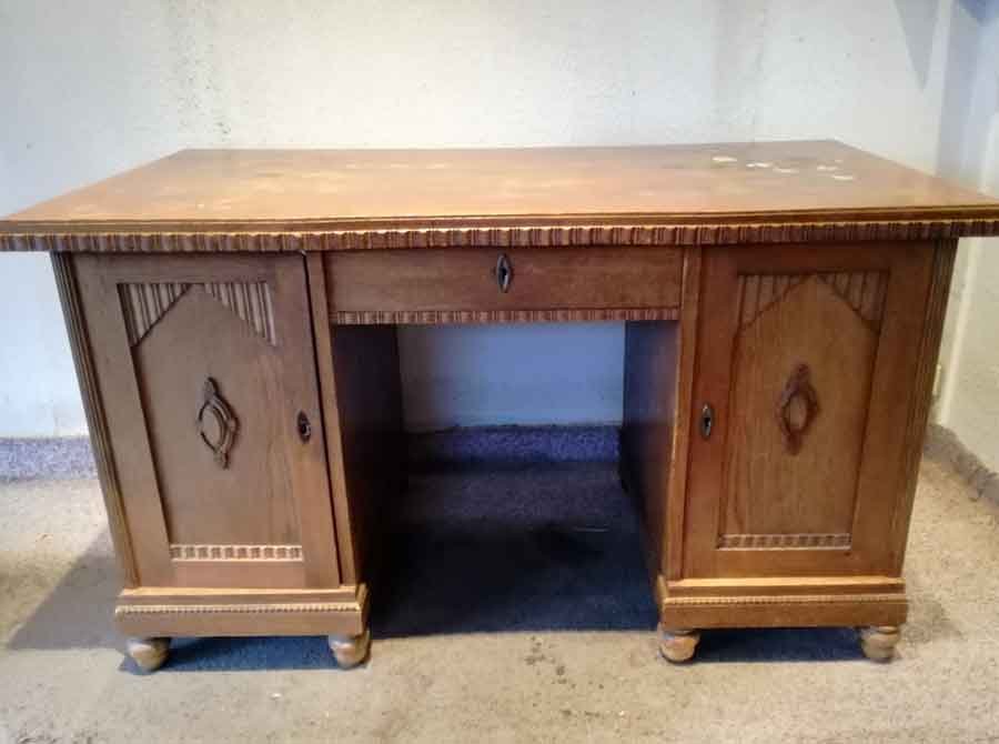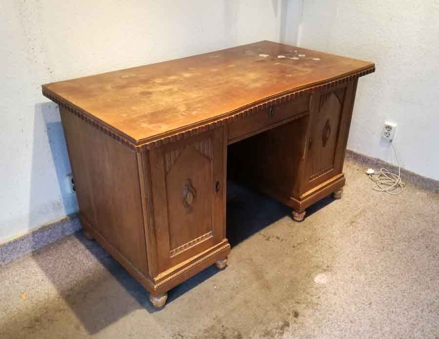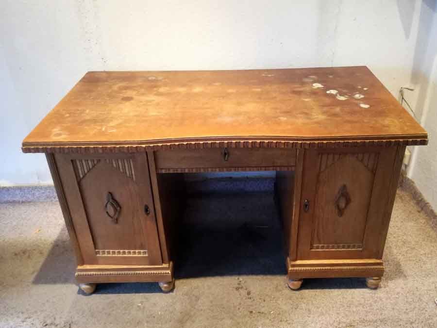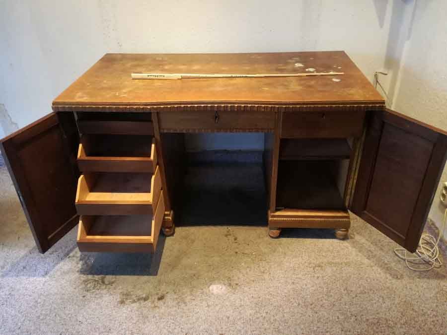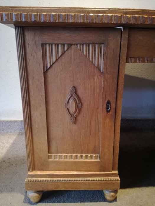 Schreibtisch um 1910, Eiche hell. Unrestaurierter Zustand, gute Substanz mit Mängeln, Platte m. Farbresten, ein Beschlag fehlt, etc. B. 137, H. 79, T.74 cm.