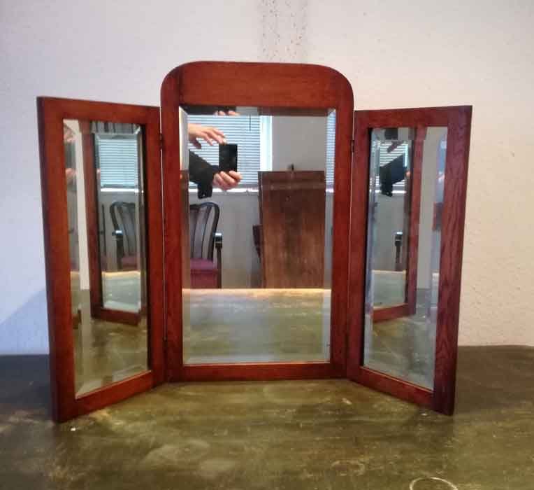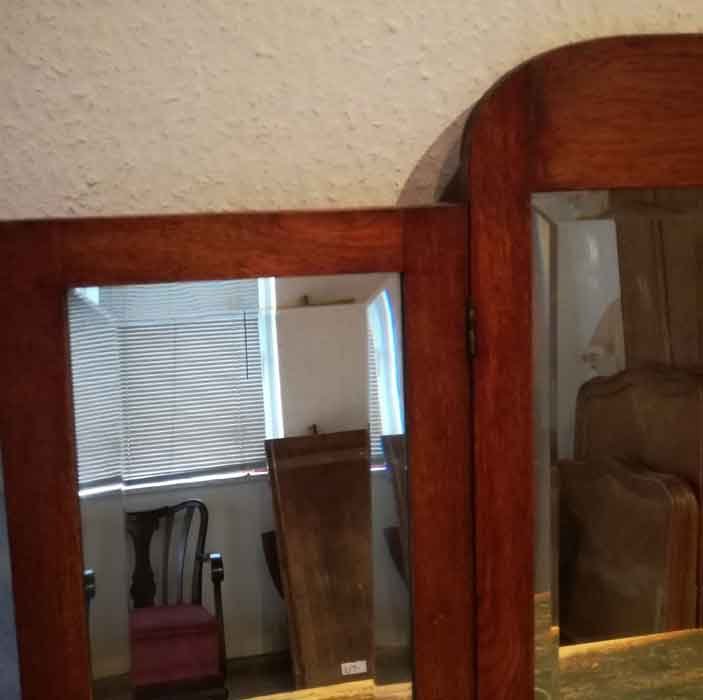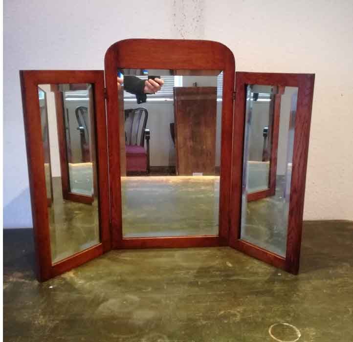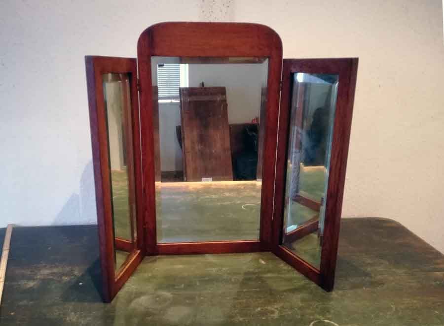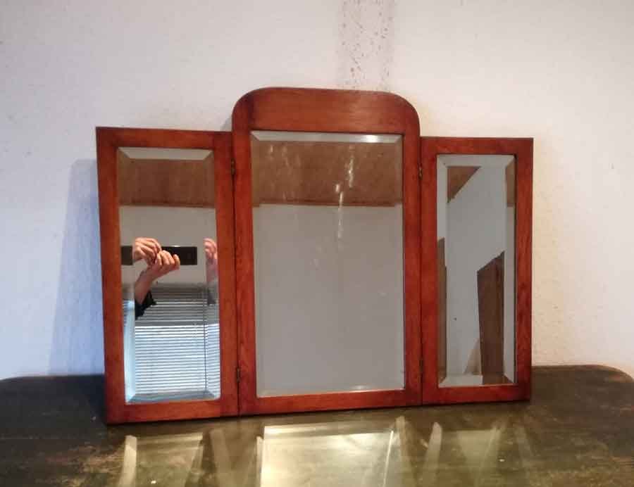 Spiegel, dreiteilig von ca 1900, die Seitenspiegel klappbar, Schminkspiegel. Originales Glas mit Facetten, sehr schönes Holz. Guter Zustand. B. ges 85 cm, H. 63 cm.