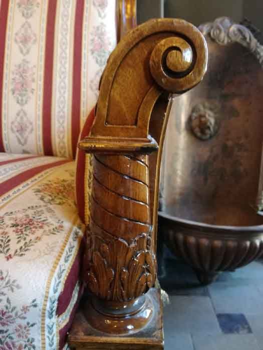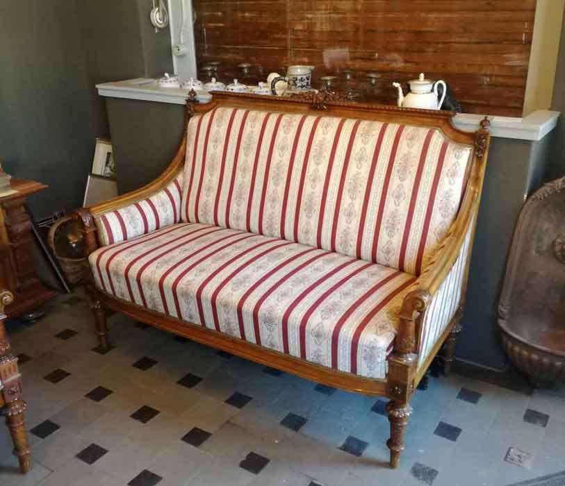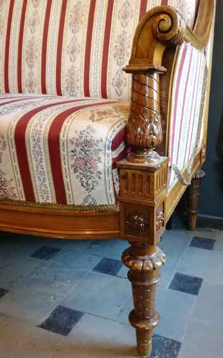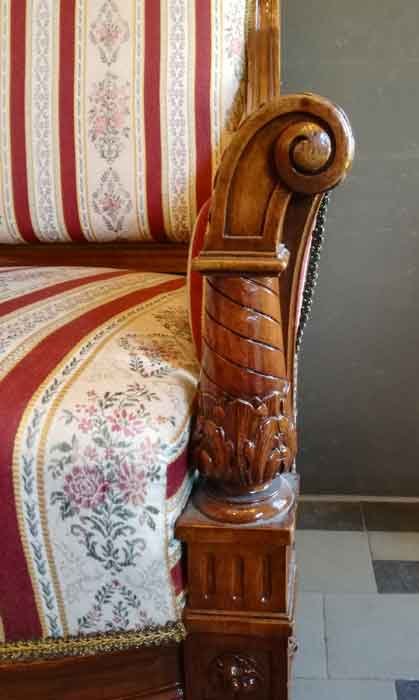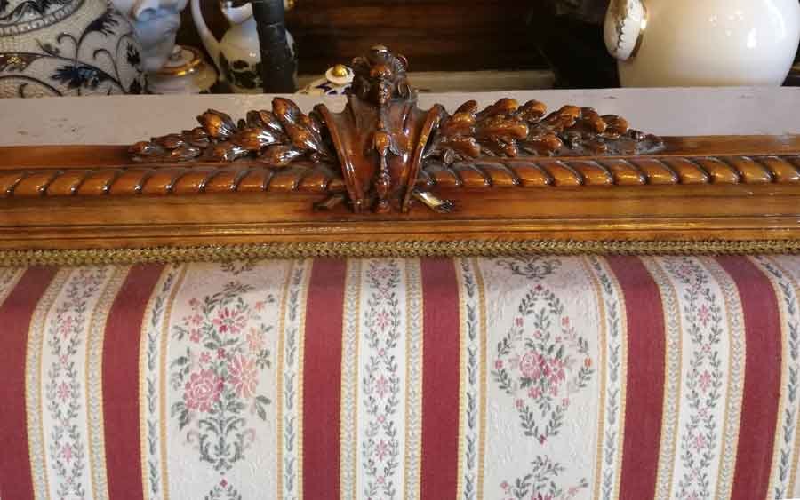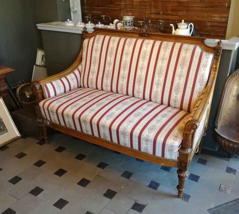 Fein gearbeitetes Salonmöbel mit filigraner, aufwändiger Schnitzerei. Allseitig alle Rahmenelemente durch Stege und Kanneluren gegliedert. Unter den Polstern mit aufwändig gewölbten Zargenbrettern, diese ebenfalls gegliedert. Jüngere Polsterung in sehr gutem Zustand.