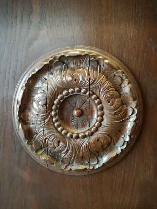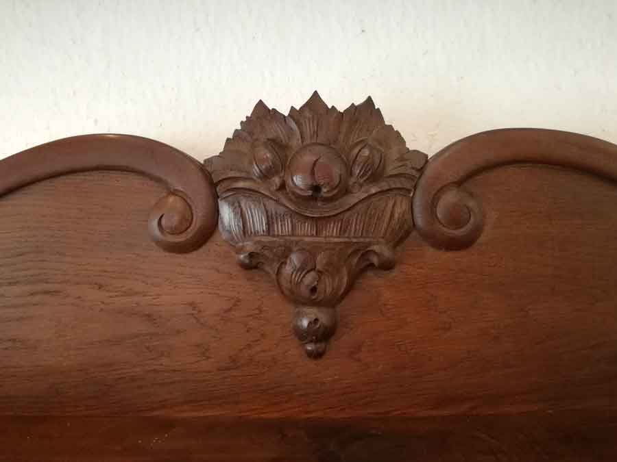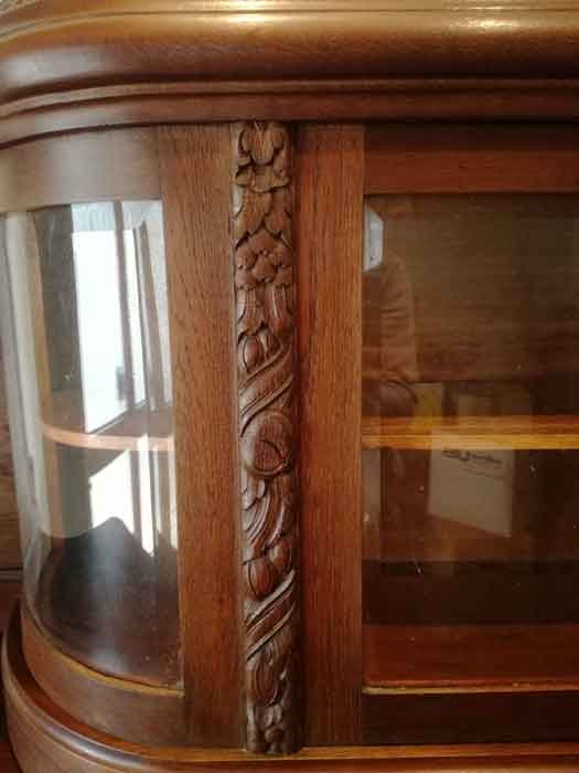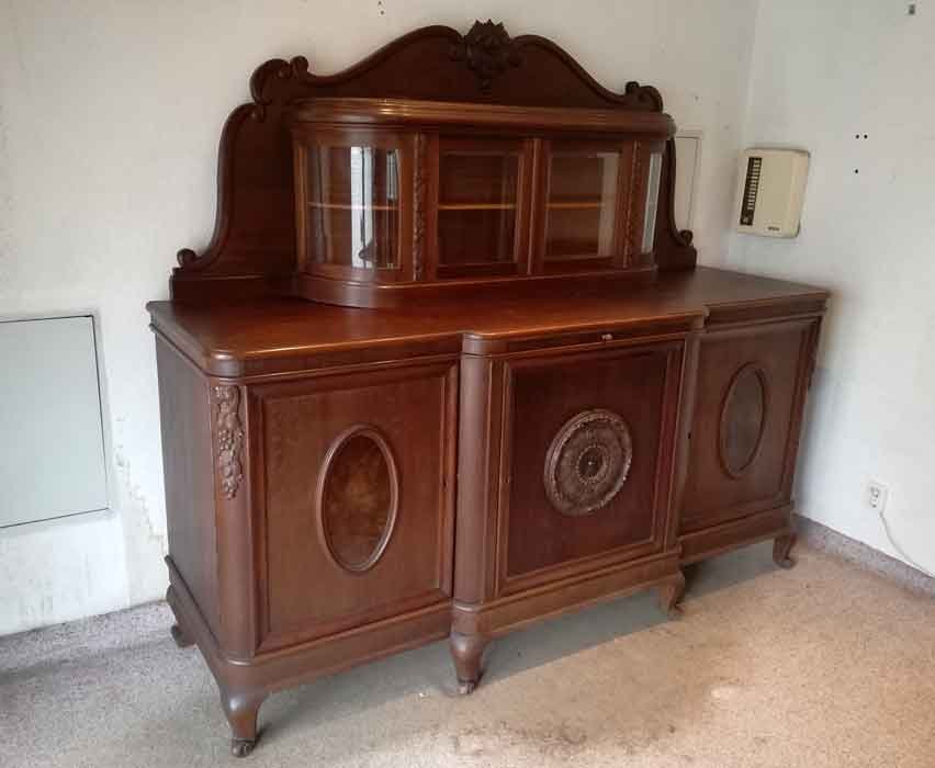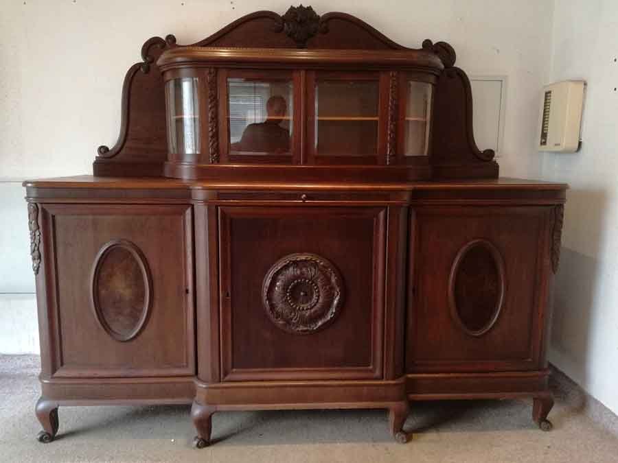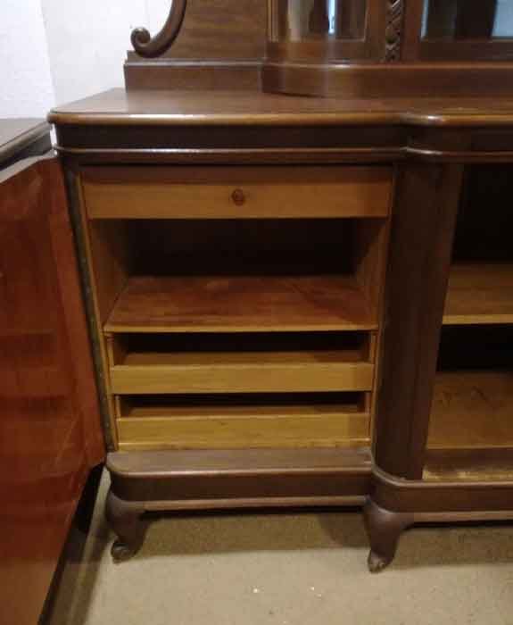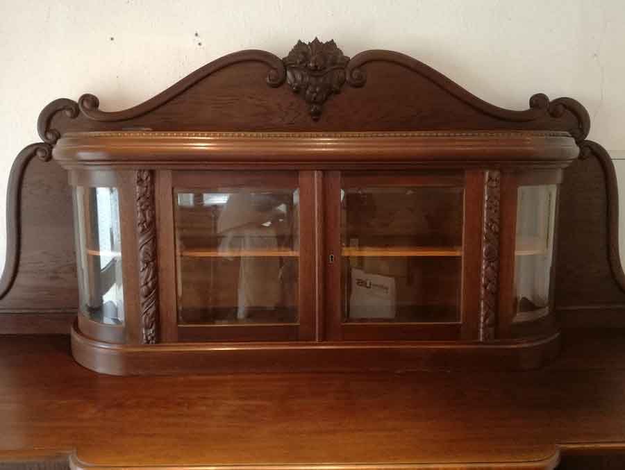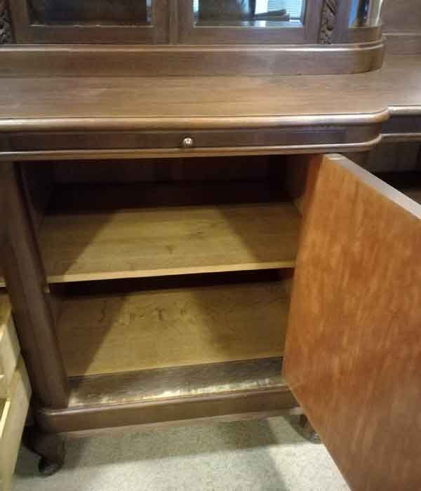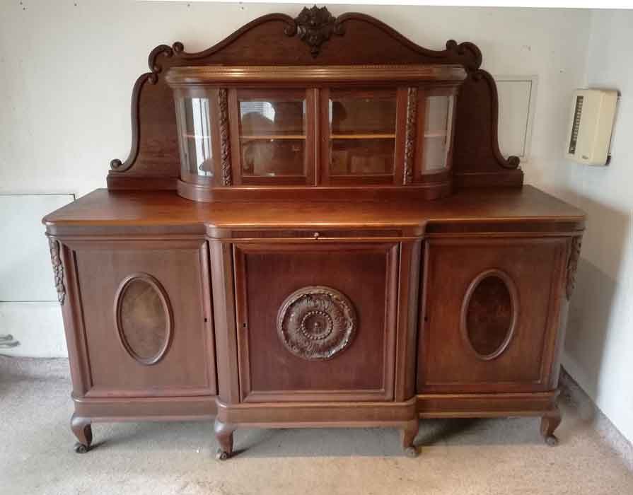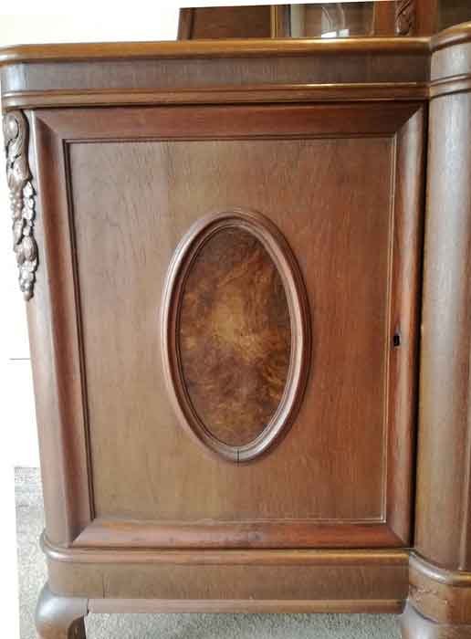 Großes Buffet um 1910. Oberteil zweitürig mit facettierten Scheiben, die seitlichen gewölbt. Unterteil dreitürig. Türen mit Medaillons in Nußbaum bzw. Schnitzerei. Links mit 3 Schubkästen Mitte und rechts je Einlegebrett.