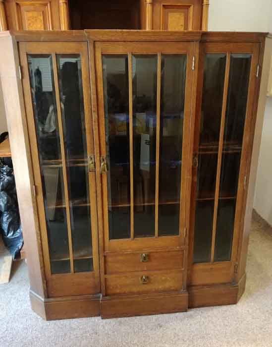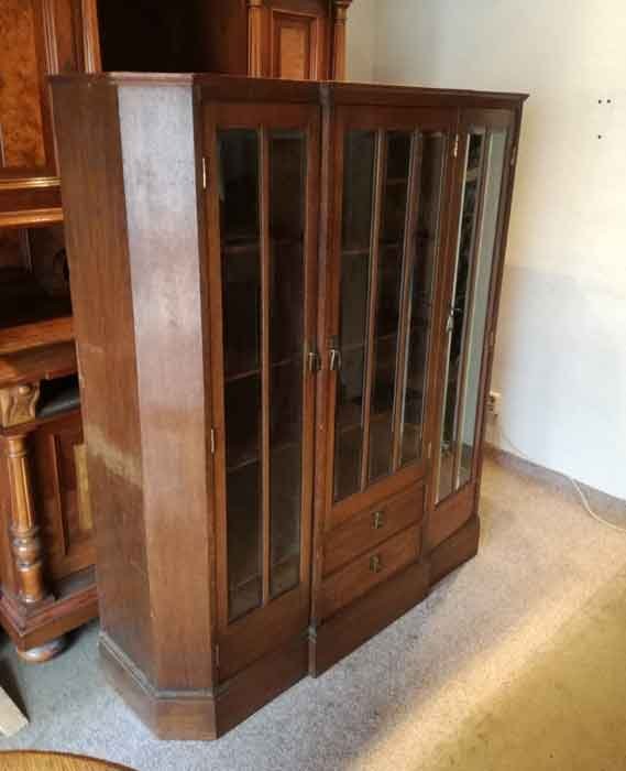 Schrank, Vitrine um 1910, Eiche. Dreitürig mit facettierten Gläsern.