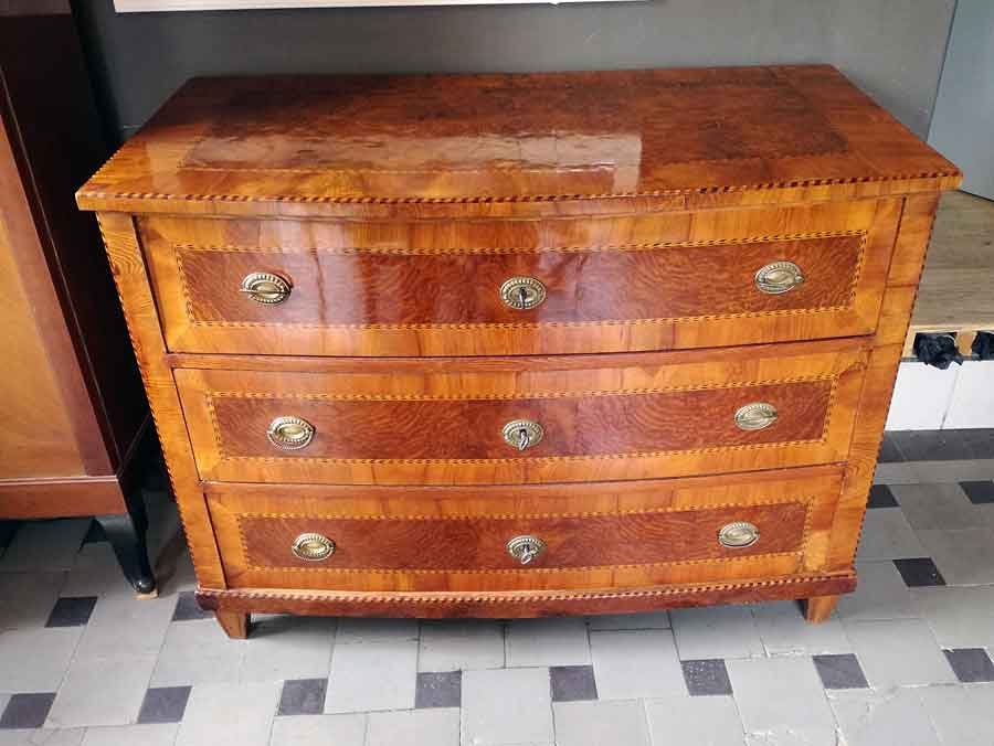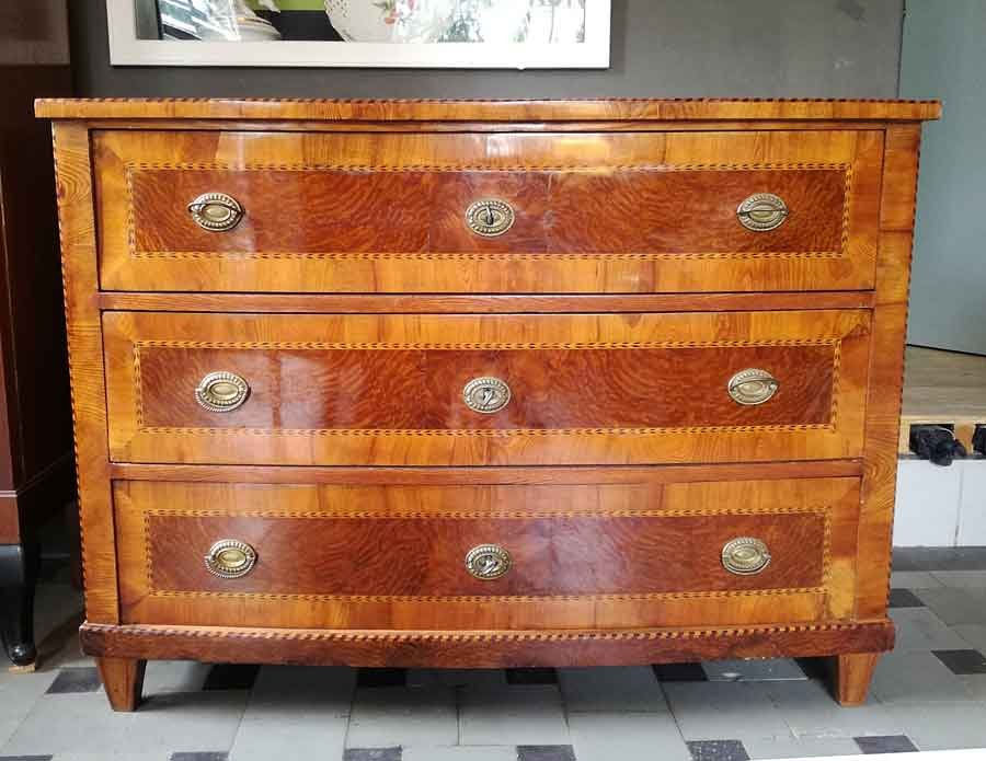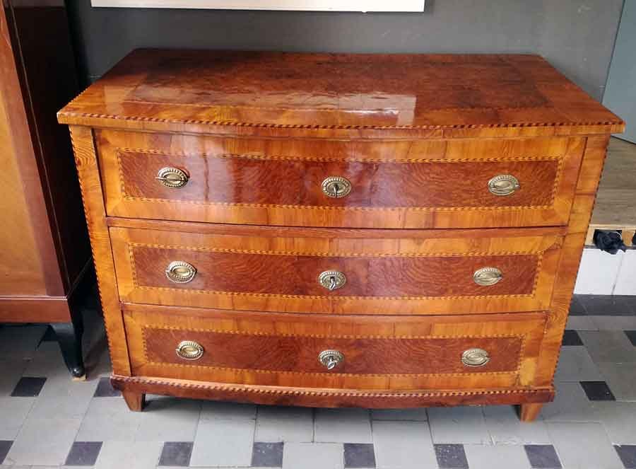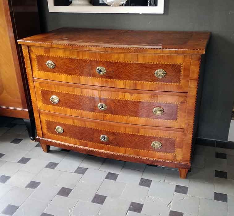 Klassizistische Kommode um 1780-1800. Esche Masserfurnier und Wurzel auf Nadelholz.