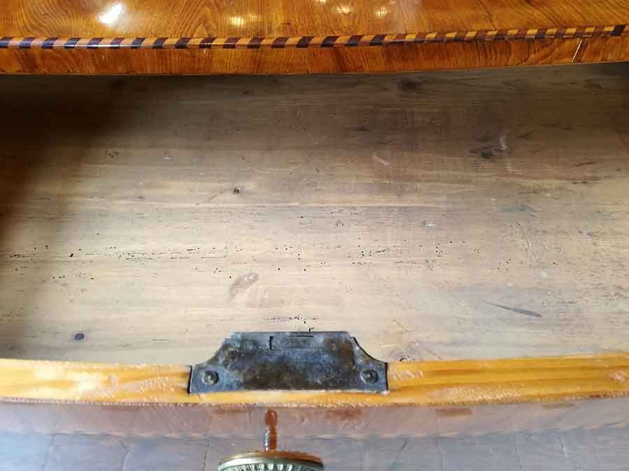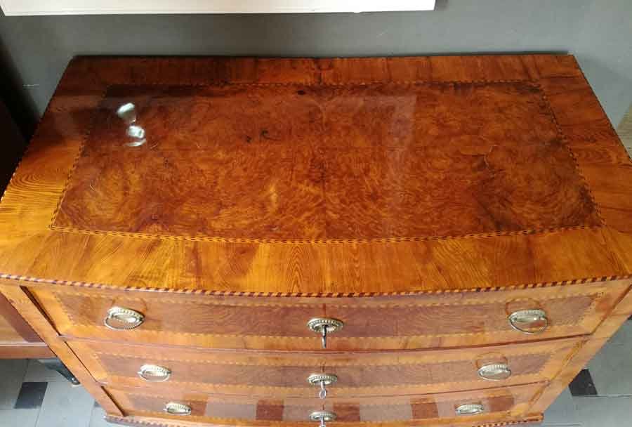 Allseitig sowie die Schubkästen mit Wurzelfurnier gefeldert, diese mit doppelten Filetband-Intarsien abgesetzt. Die Kanten ebenfalls mit Filetband akzentuiert.