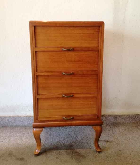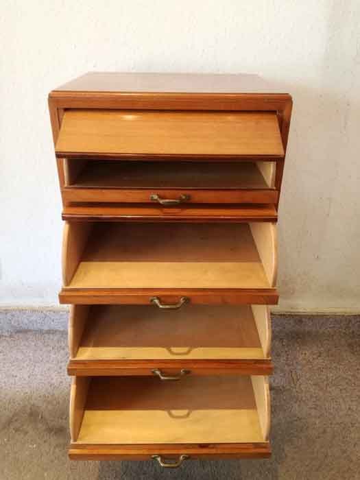 Kleiner Aktenschrank, Dokumentenschrank um 1930. Schränkchen mit 4 Auszügen. Besonderes Schubkastensystem, beim ausziehen des Schubes klappt die Vorderfront nach oben.