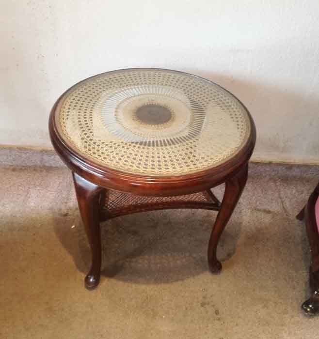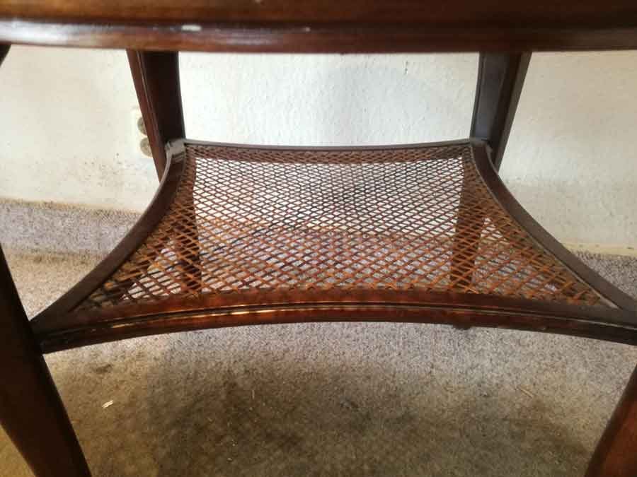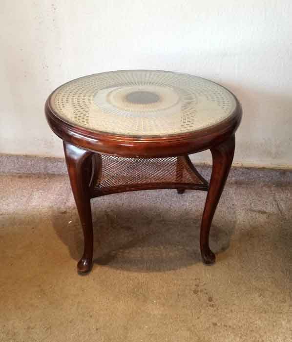 Runder Tisch um 1920. Tischfläche geflochten mit eingelegter Glasplatte. Sehr gut erhalten, stabil, die Geflechte sind i.O.