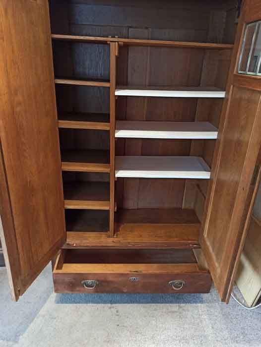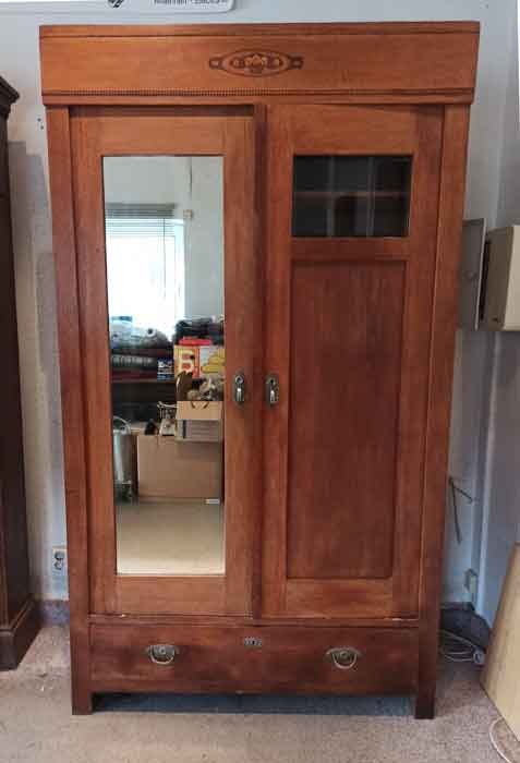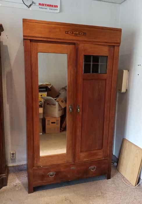 Kleiderschrank um 1910, zweitürig mit Schubkasten. Eine Tür mit Spiegel. Innen mit Einlegebrettern. Kann alles beliebig umgestaltet auch die Einteilung komplett entfernen etc.