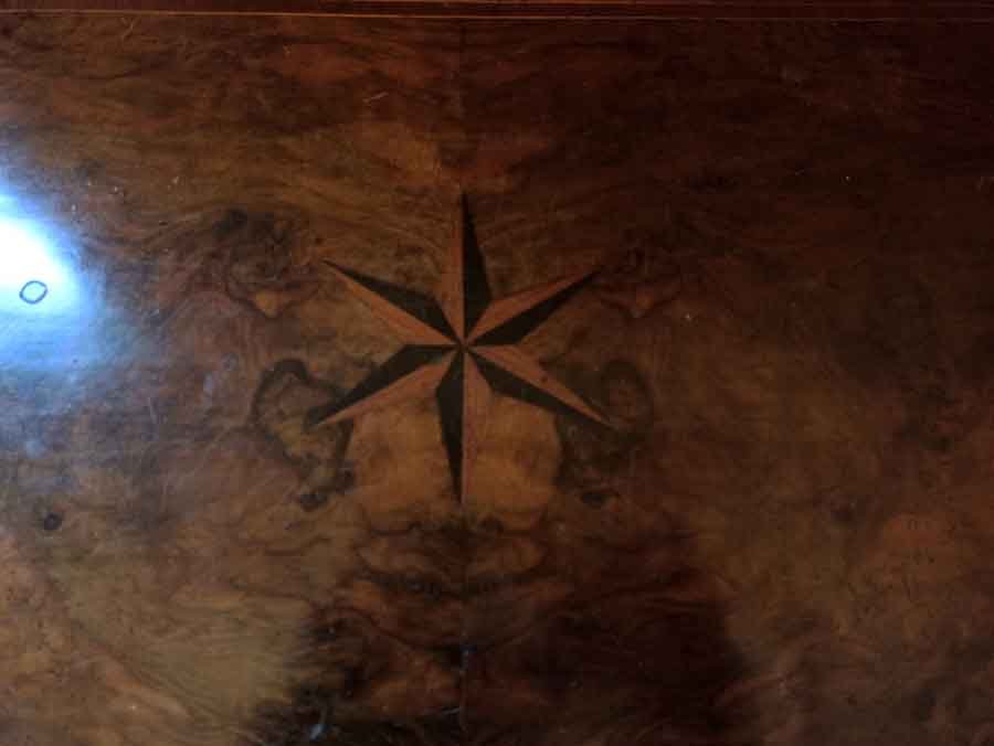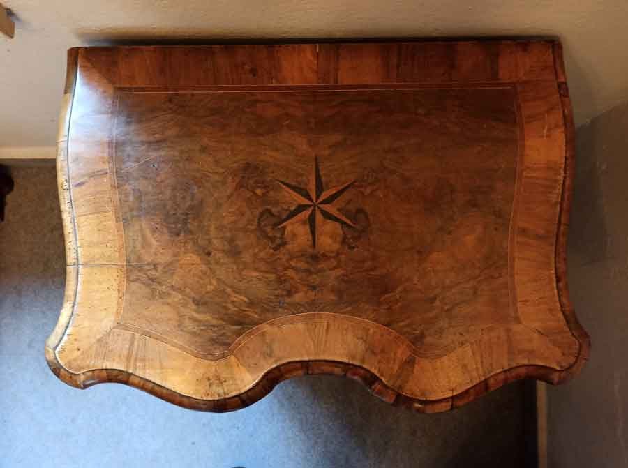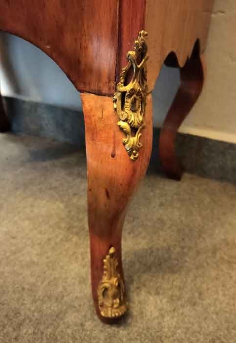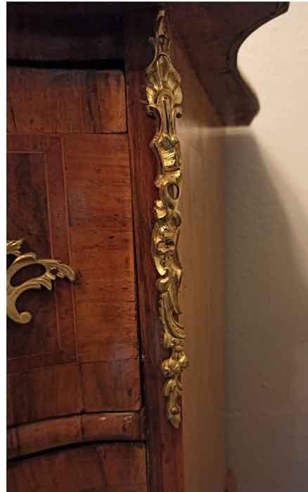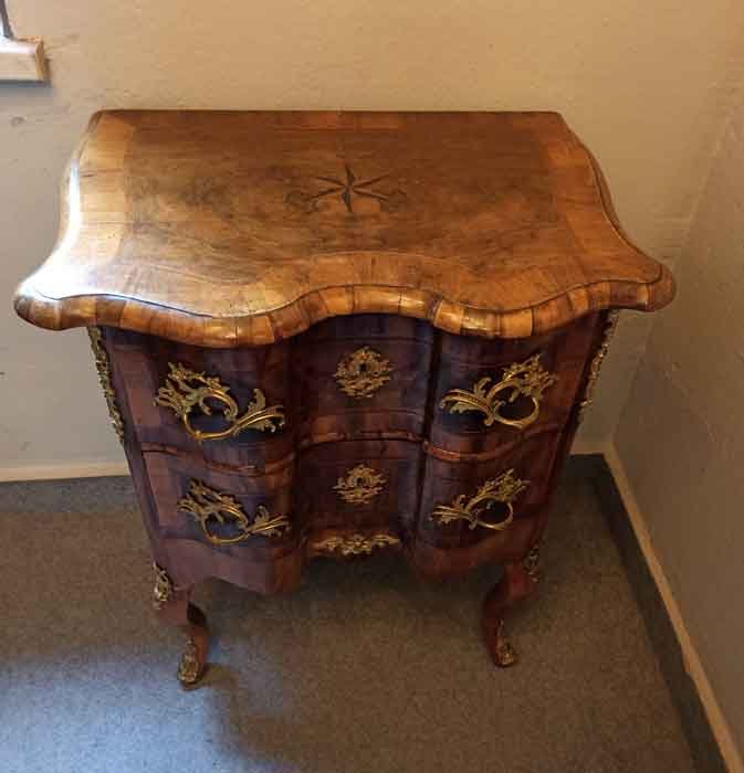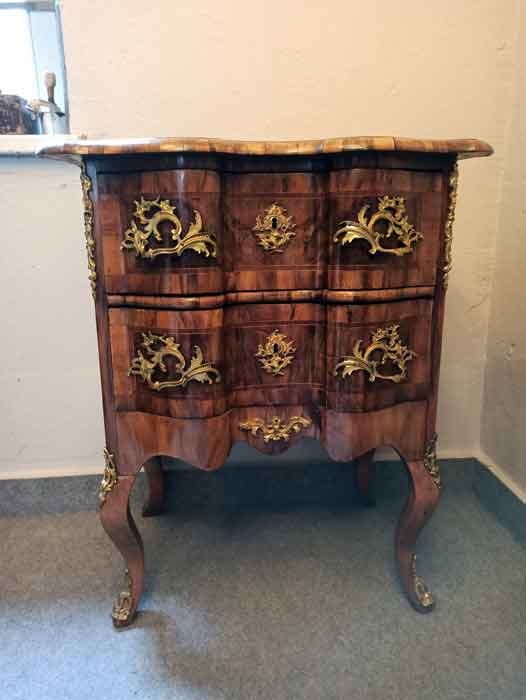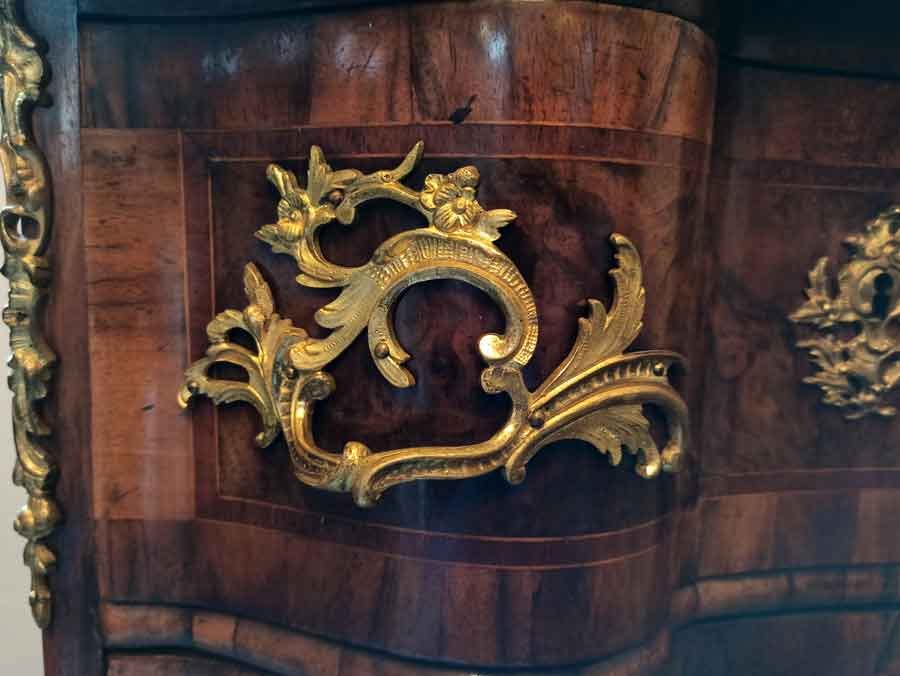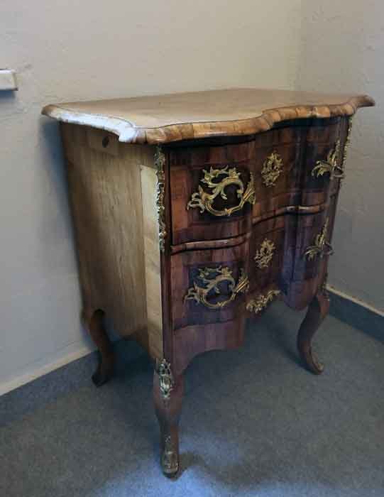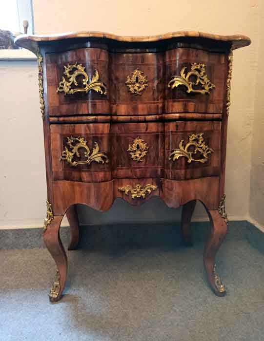 Kommode, kleines zierliches Möbel in Nussbaum furniert mit aufwändigen Beschlägen und Applikationen, diese fein ziseliert und vergoldet. Die Front doppelt geschwungen.