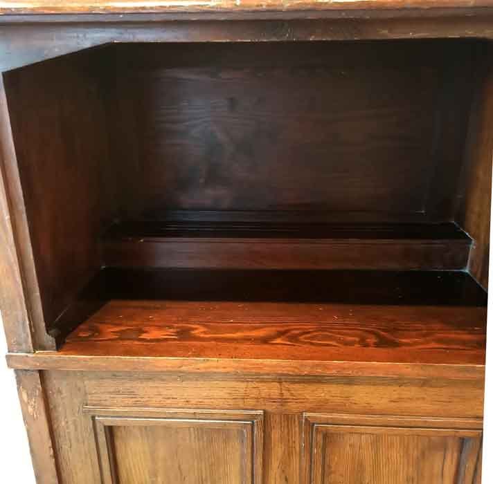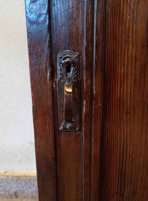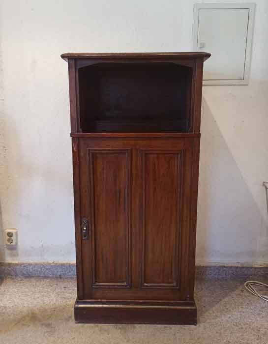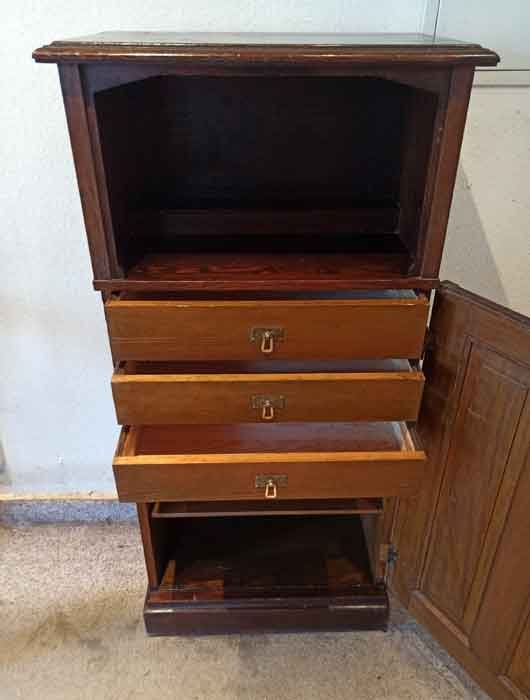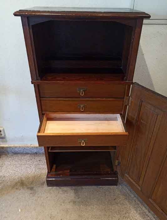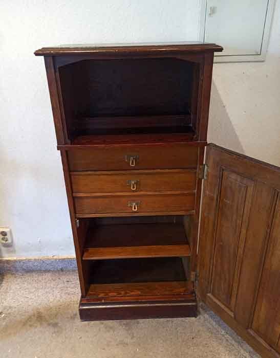 Kleiner Schrank um 1900 in seltener Ausführung. Oben ein offenes Fach mit Board, darunter eintürig mit drei Schubkästen und einem Einlegebrett. Schönes und praktisches Möbel in gutem Zustand, sofort nutzbar.