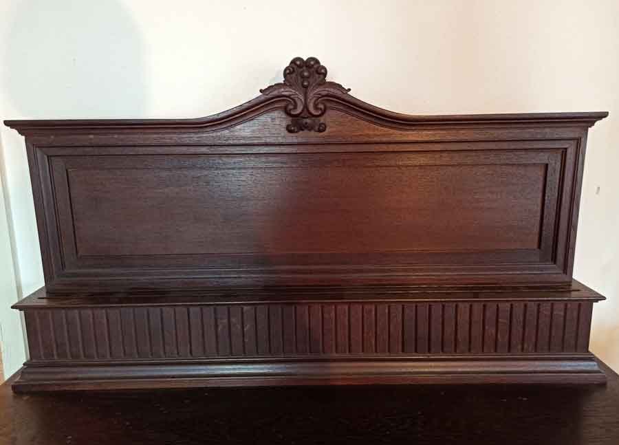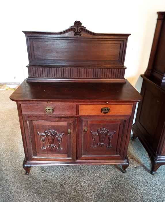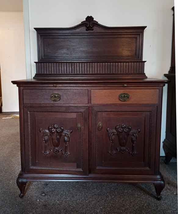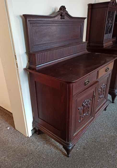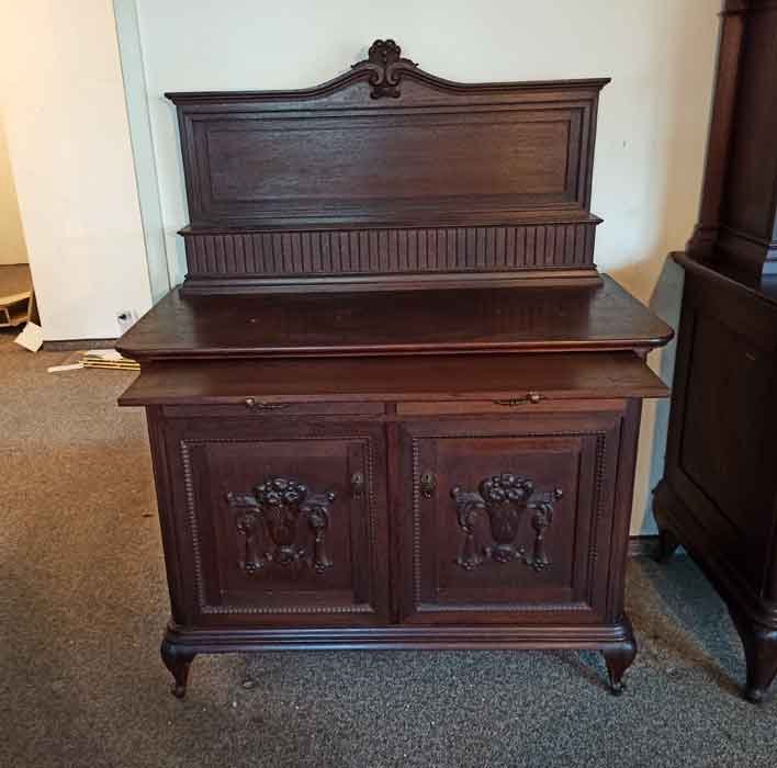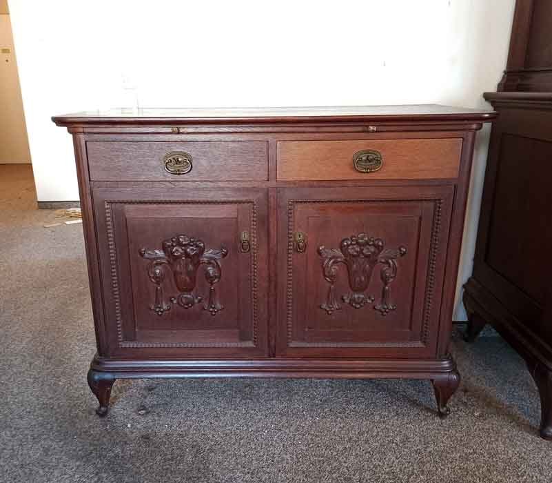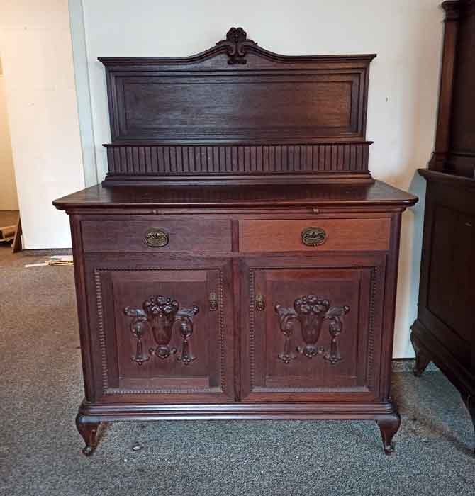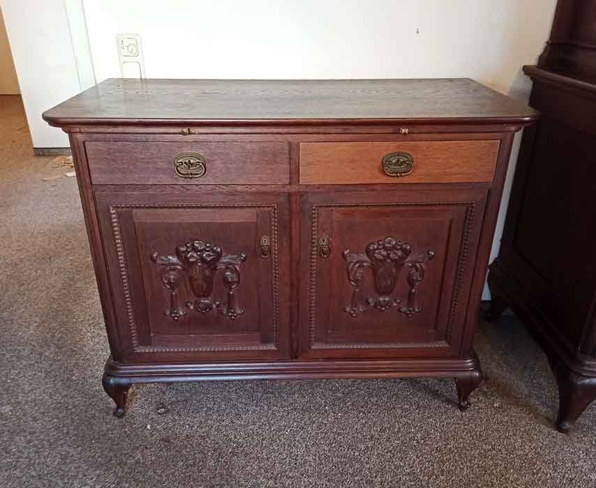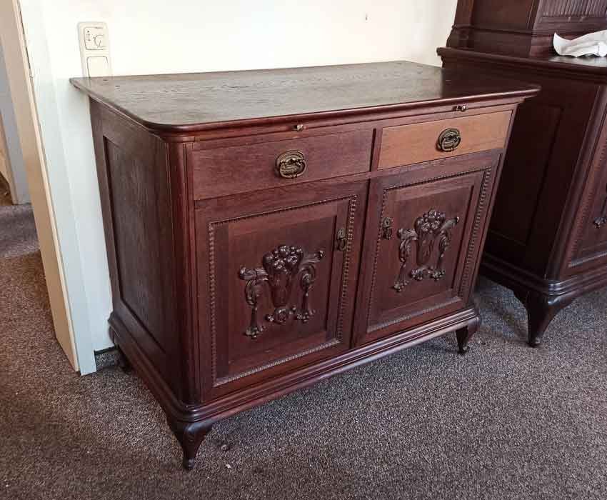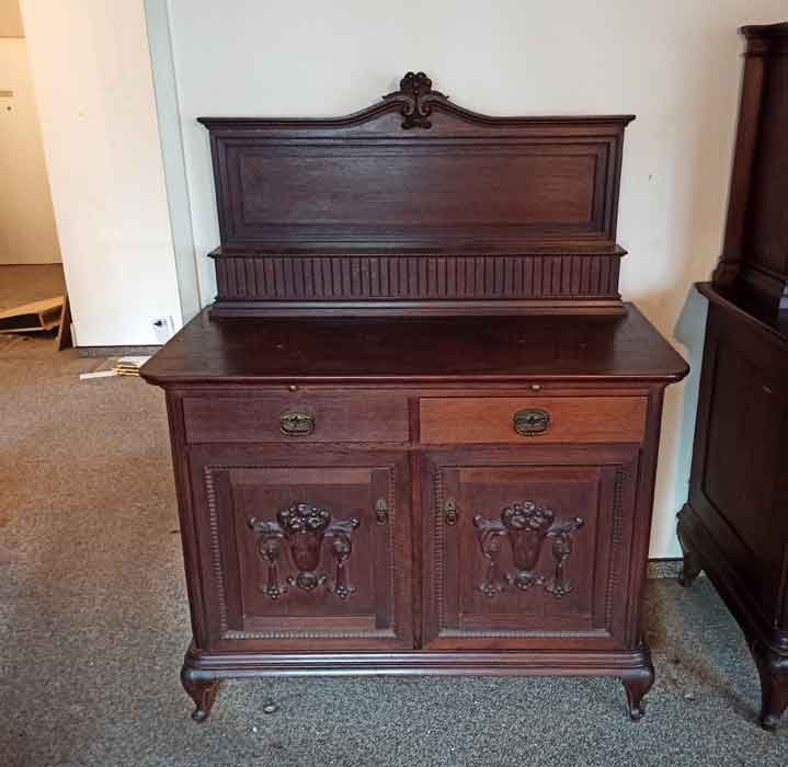 Anrichte um 1910. Zweitürig mit zwei Schubkästen. Der Aufsatz ist abnehmbar. Nutzung auch ohne Aufsatz möglich, siehe Foto.
