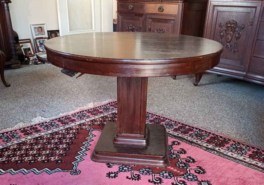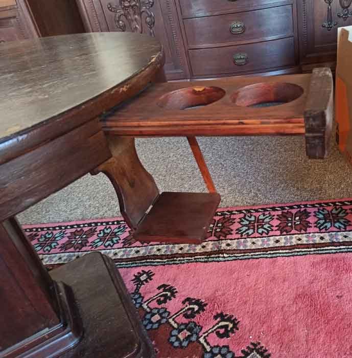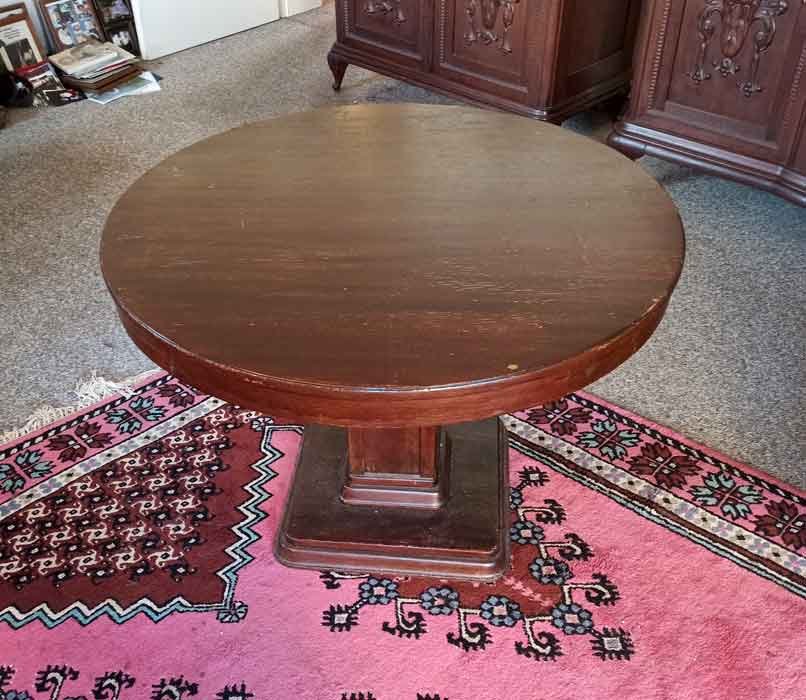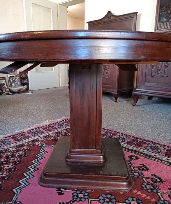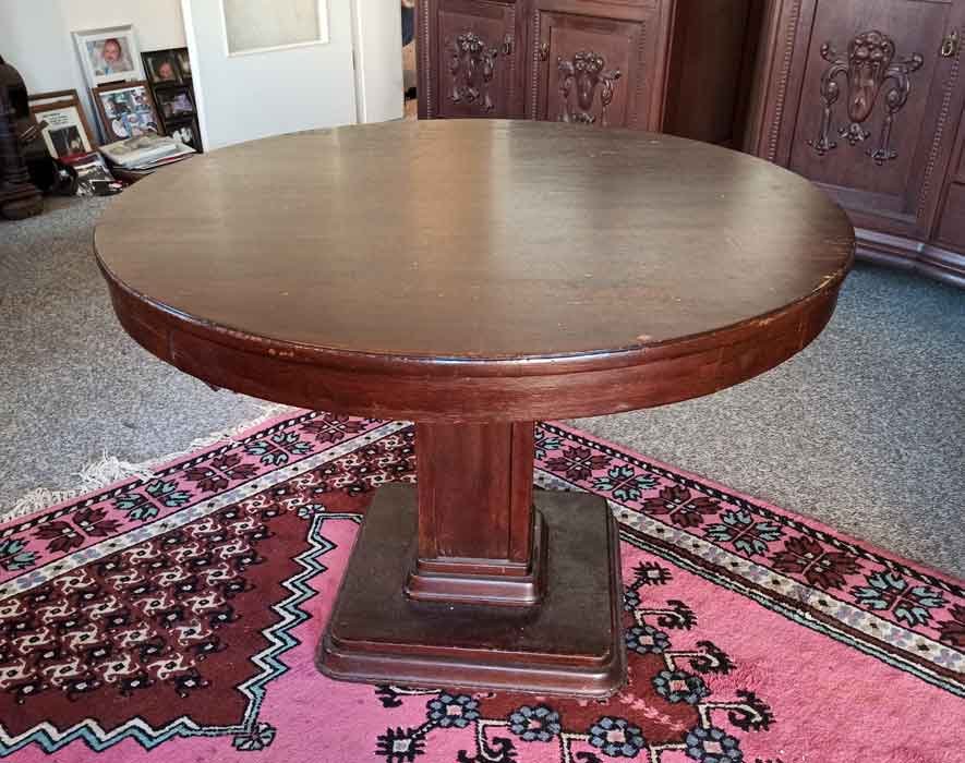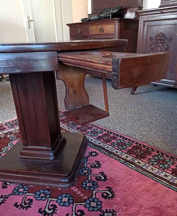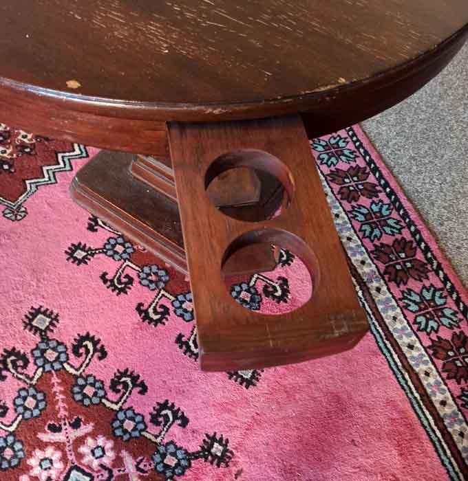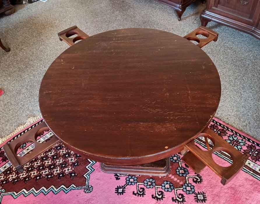 Tisch, rund D. 99 cm, Spieltisch oder Skattisch mit 4 ausklappbaren Ablagen für Gläser, Ascher o.ä. (aber auch als ganz normaler Tisch nutzbar). Guter Zustand, zwei Ablagen mit geringem Reparaturbedarf.