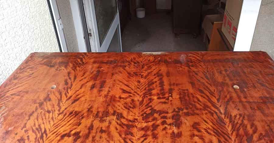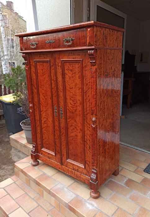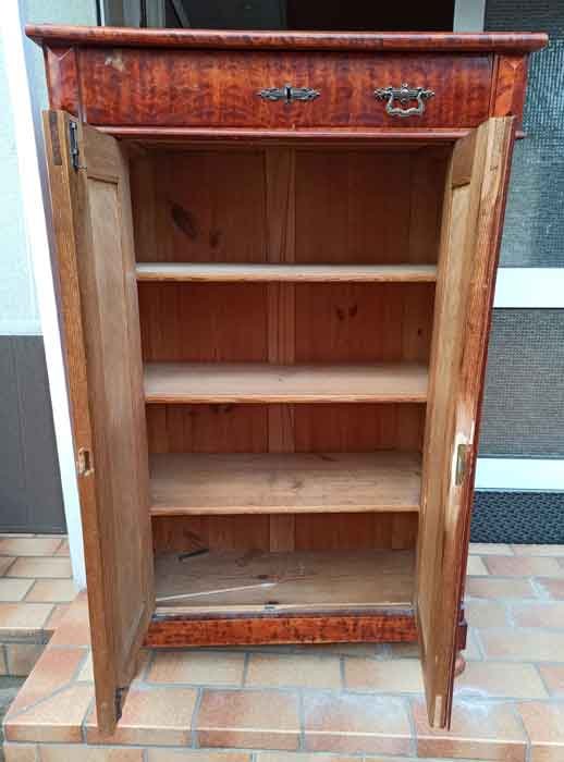 Kleiner Schrank sogen Vertiko. Gründerzeit um 1880, Birke. Zweitürig, oben ein Schubkasten, innen mit Einlegebrettern.