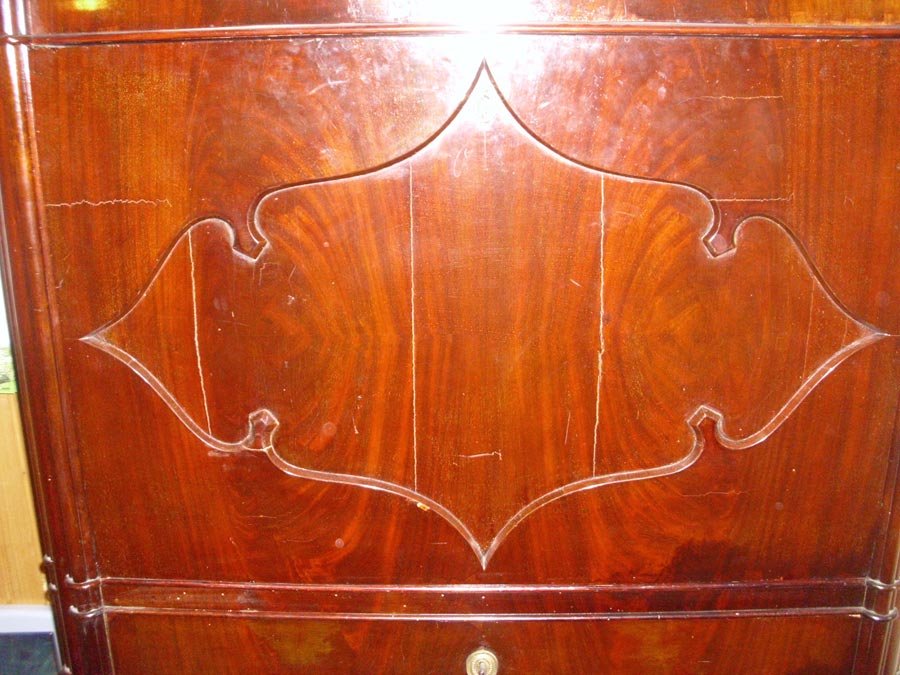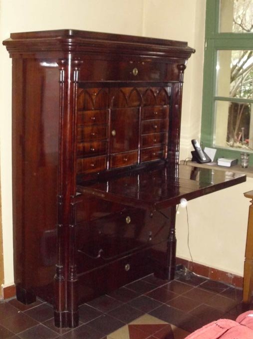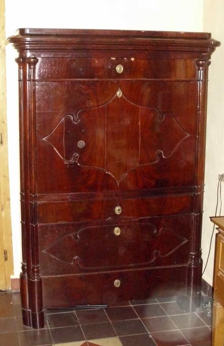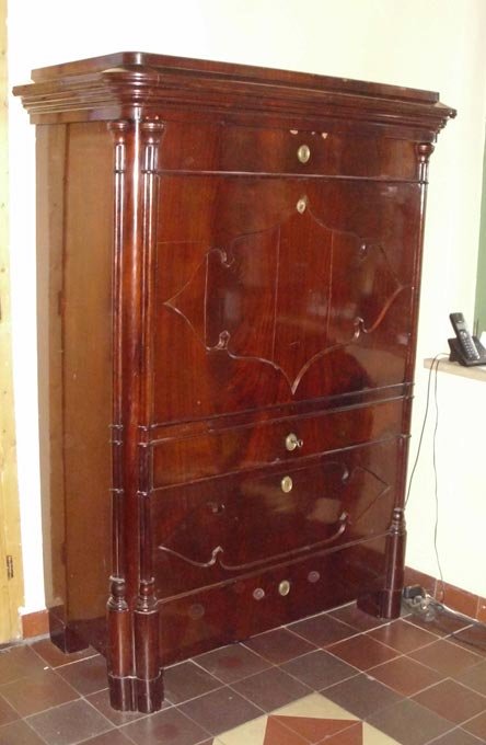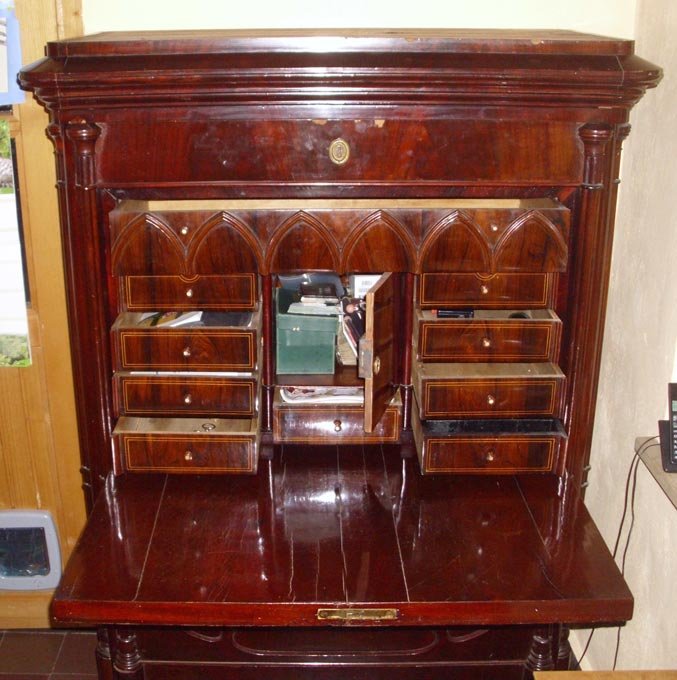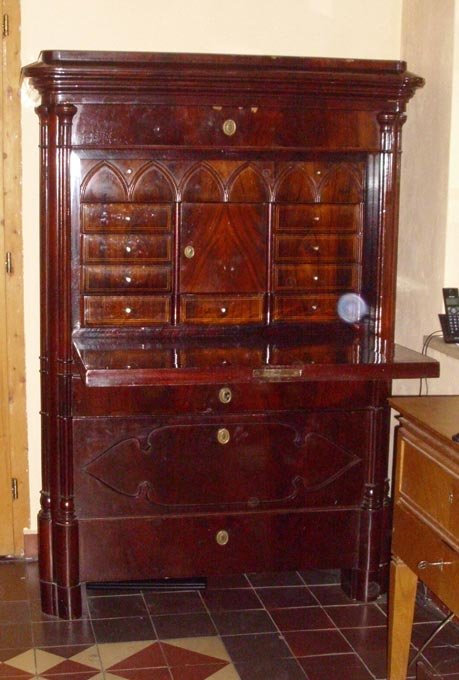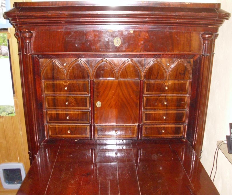 Schreibsekretär um 1840, spätere Biedermeierzeit. Mahagoni furniert. Seitlich je zwei aufgesetzten gewellten Säulen auf kräftigen Basen. Außen teilweise mit geschwungenen Füllungen. Inneneinrichtung mit 9 kleinen und einem breiten Schubkasten sowie einem Türfach, durch gotische Bögen gegliedert, die Schubkästen mit Fadenintarsien.