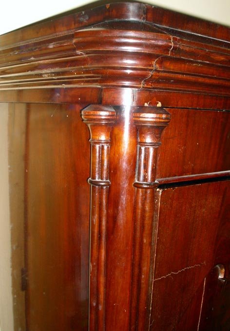 Der Zustand ist gut, und nutzbar mit alterstypischen Mängeln und Gebrauchsspuren. Einige Furnierfehlstellen (die fehlenden Stücke sind teilweise vorhanden), Trocknungsrisse, Beschläge vollständig, teilweise lose. Schlüssel sind vorhanden. Maße ca H. 160 cm, B. 105 cm, T. 50 cm.