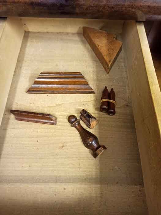 Inneneinrichtung mit Mittelfach umgeben von 8 Schubkästen. Der obere und untere Schub über die ganze Breite. Ein Geheimfach.