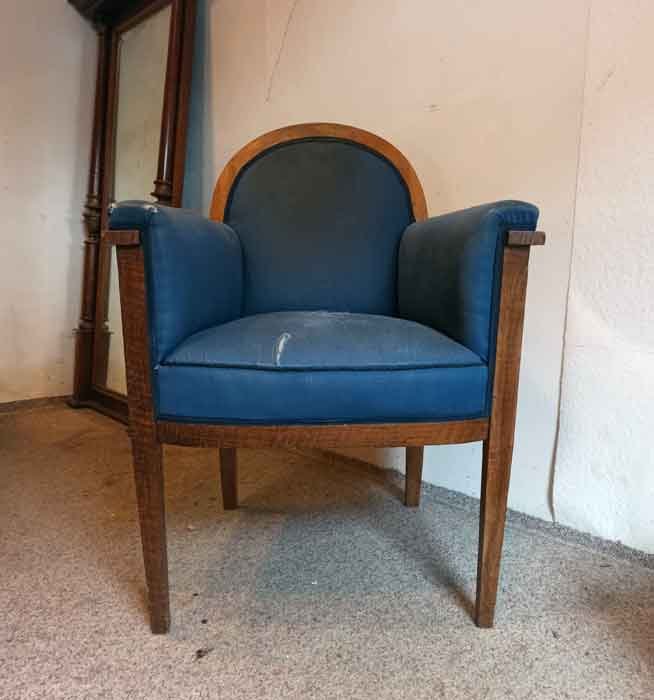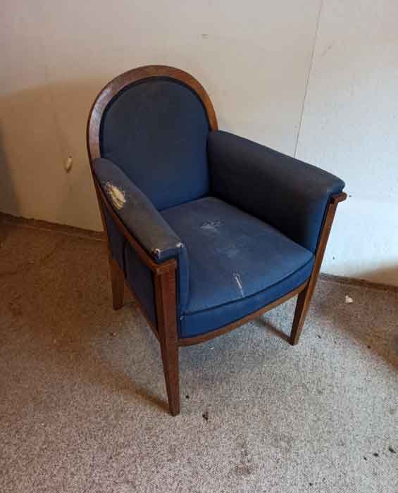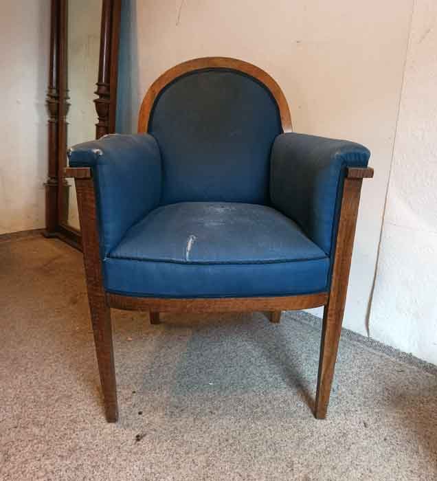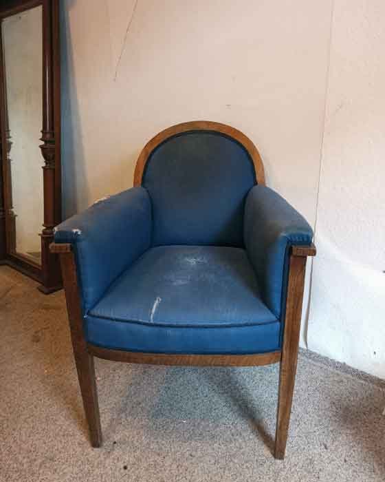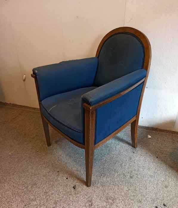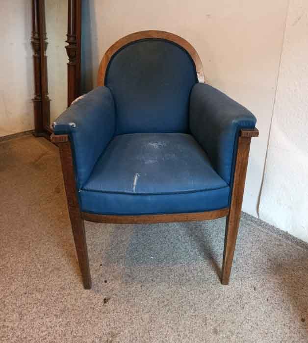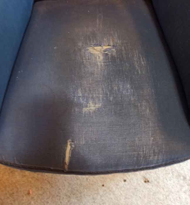Gestell und Polster in gutem Zustand. Der Bezugsstoff defekt und angeschmutzt. Das Polster ist sehr gut und kann verwendet werden. Als Bezug wurde ein ungeeigneter Stoff verwendet der nicht als Bezugsstoff geeignet ist. Dieser hat die Nutzung nur kurz bestanden. Es ist also lediglich ein Neubezug nötig, das Polster kann genutzt werden.