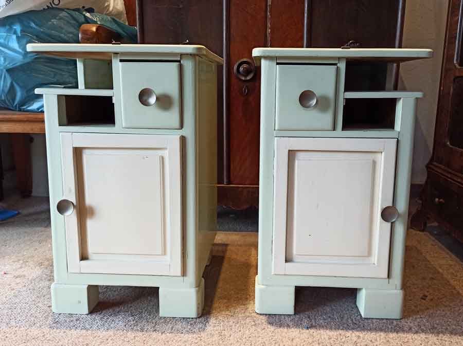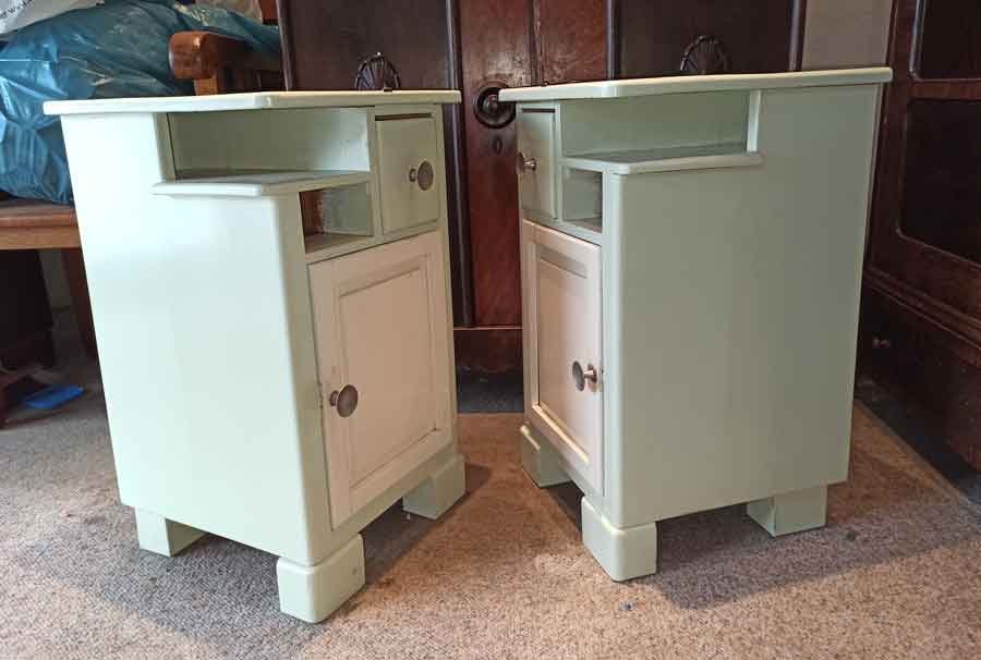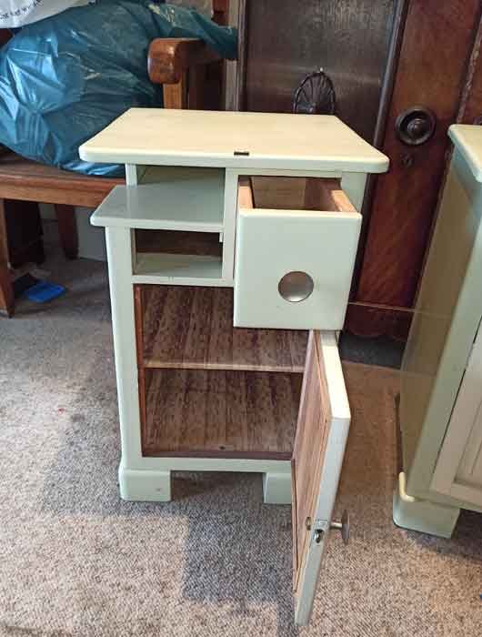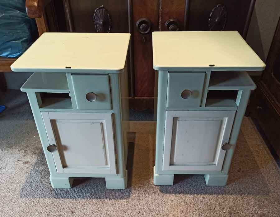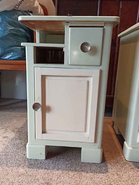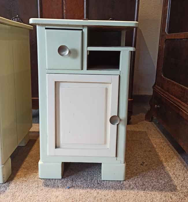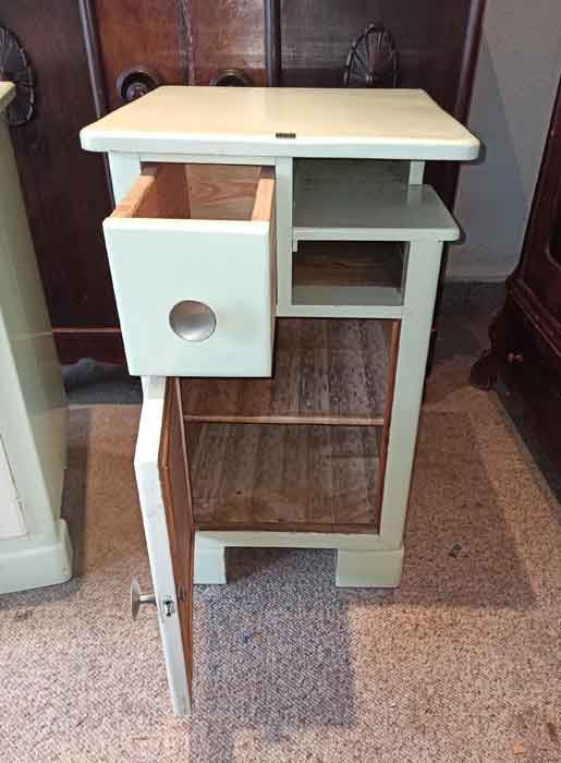 Kleines Schränkchen (nur noch einmal vorhanden). Nachtschränke mit ausgefallener Gestaltung/Aufteilung (offenes Regalfach, kleiner Schubkasten etc) um 1925, Art Deco. Später farblich neu gefasst. Guter Zustand. H. 70 cm, B. 42 cm, T. 41 cm.