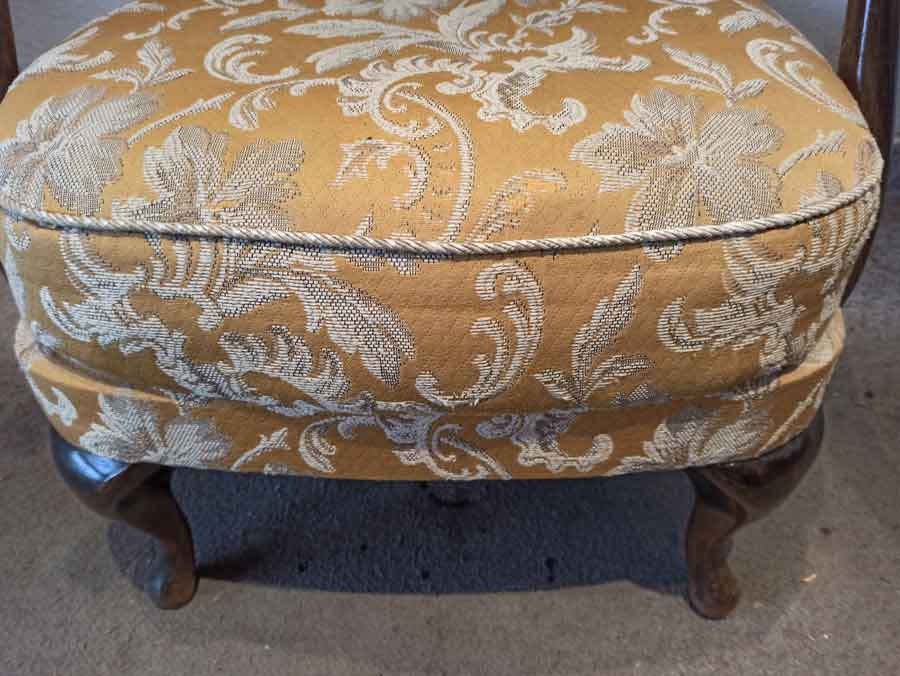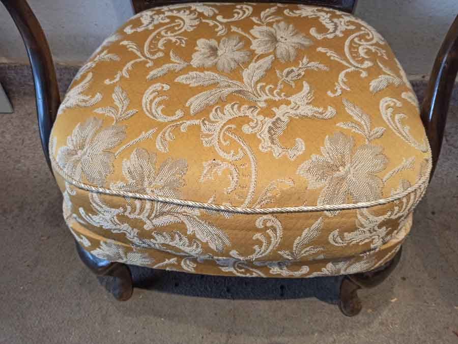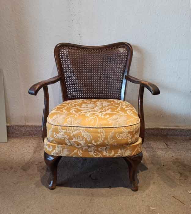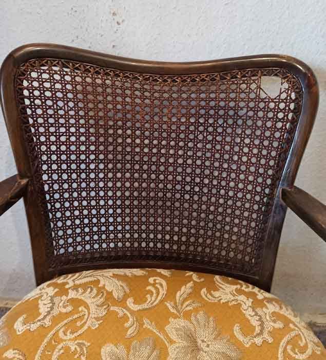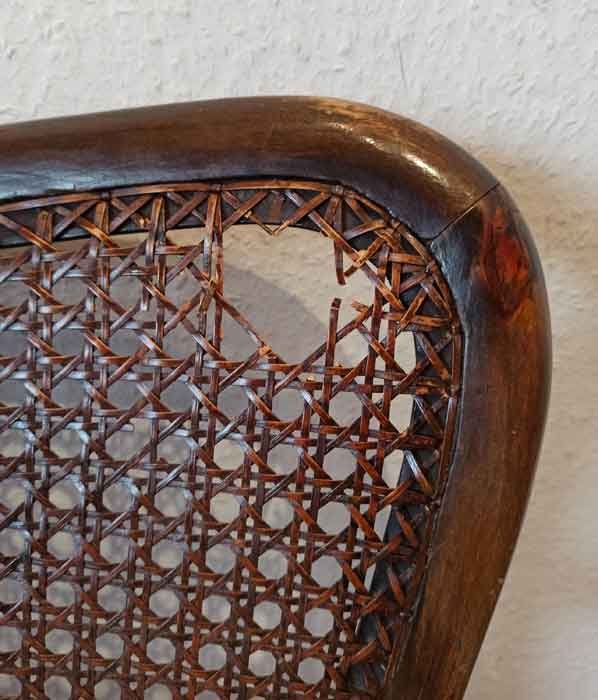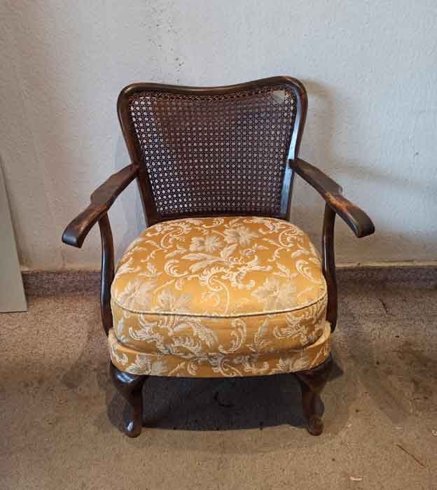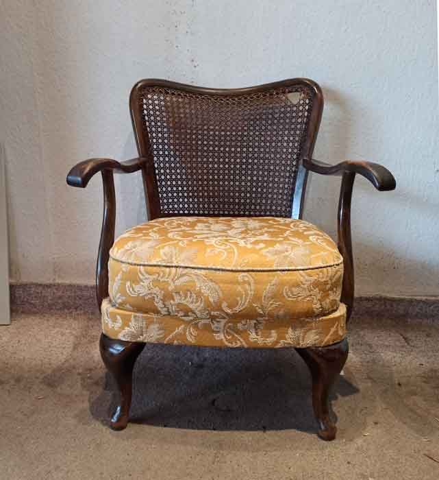 Sessel mit Polster (Sitz) und Geflecht (Lehne), sogen. Chippendale um 1920. Guter Zustand mit Gebrauchsspuren, nutzbar. Polster mit Nutzungsspuren aber i.O. Lehne mit einer Fehlstelle im Geflecht, stabil und problemlos verwendbar.