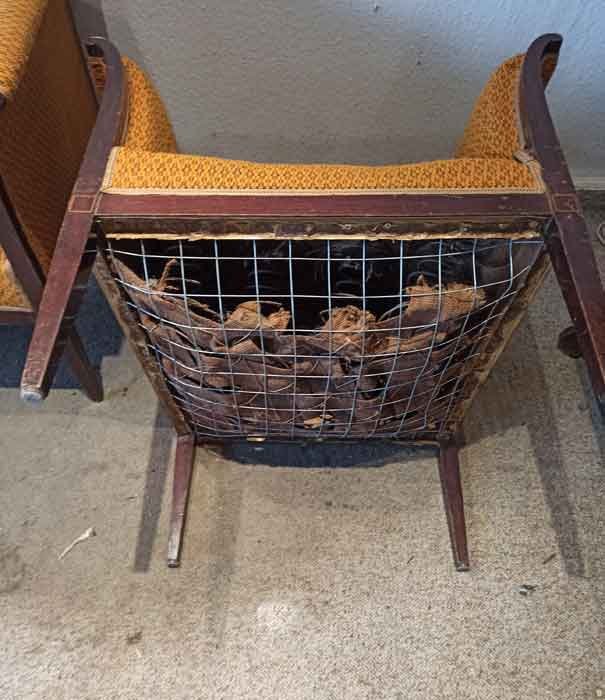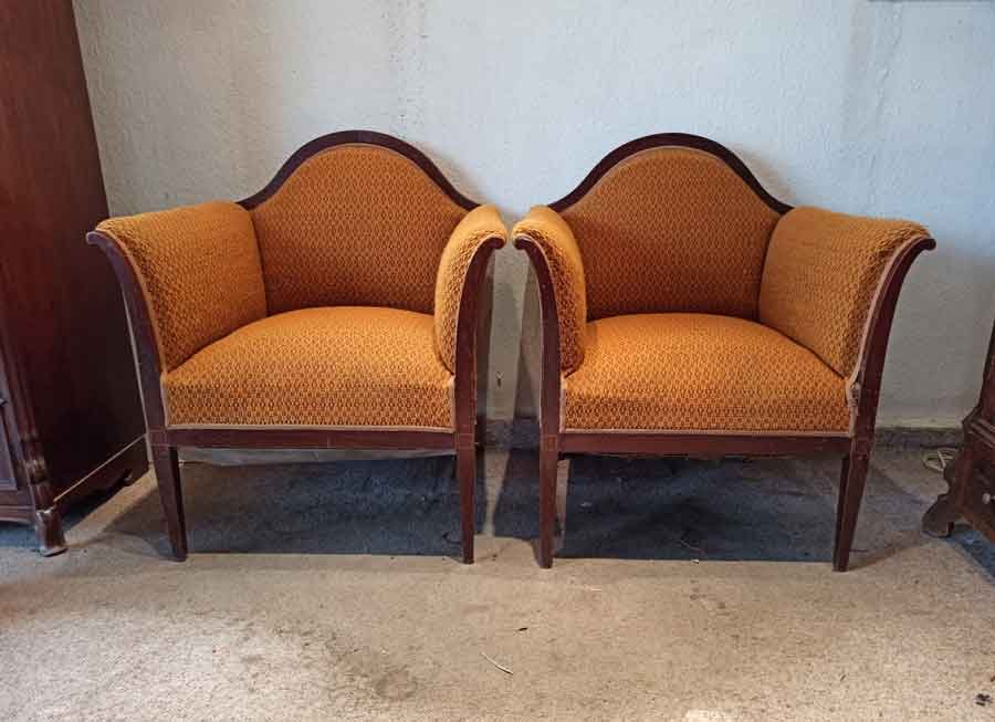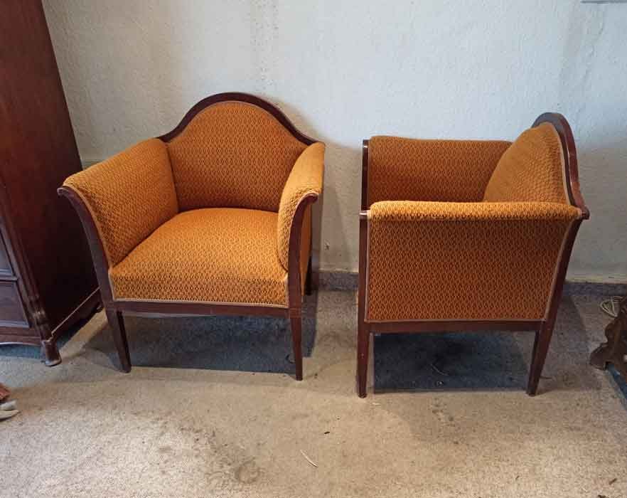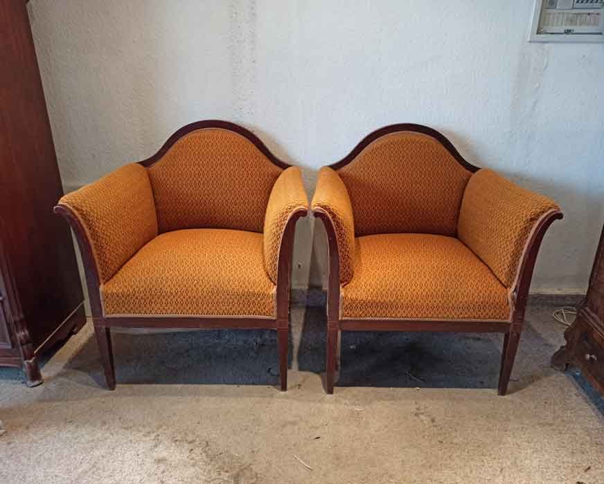 2 Sessel schöne, klassische Form. Die Gestelle stabil und i.O. Polster und Bezug defekt, reperaturbedürftig. Auch einzeln abzugeben.