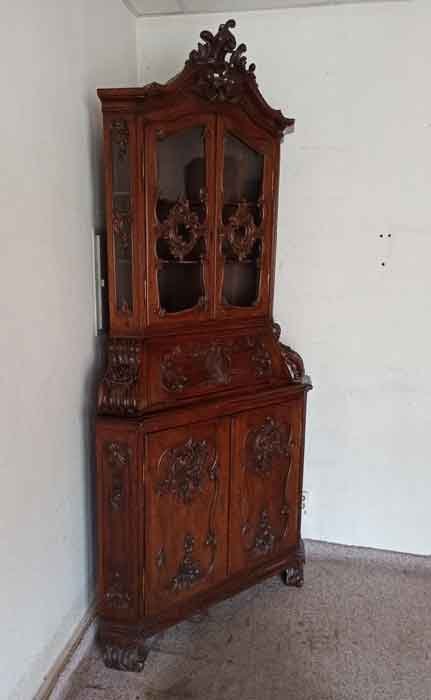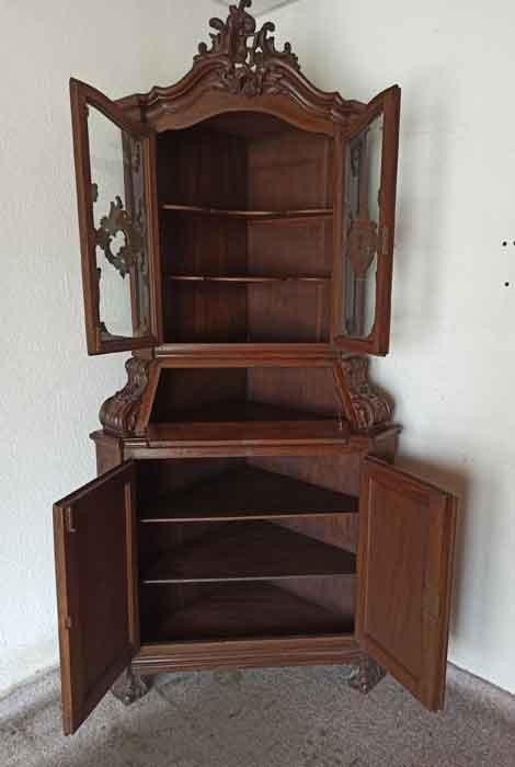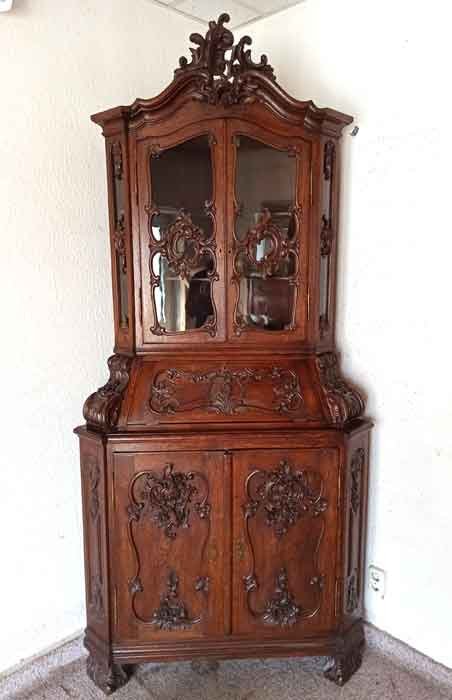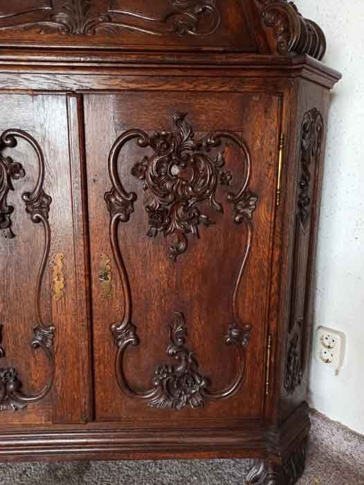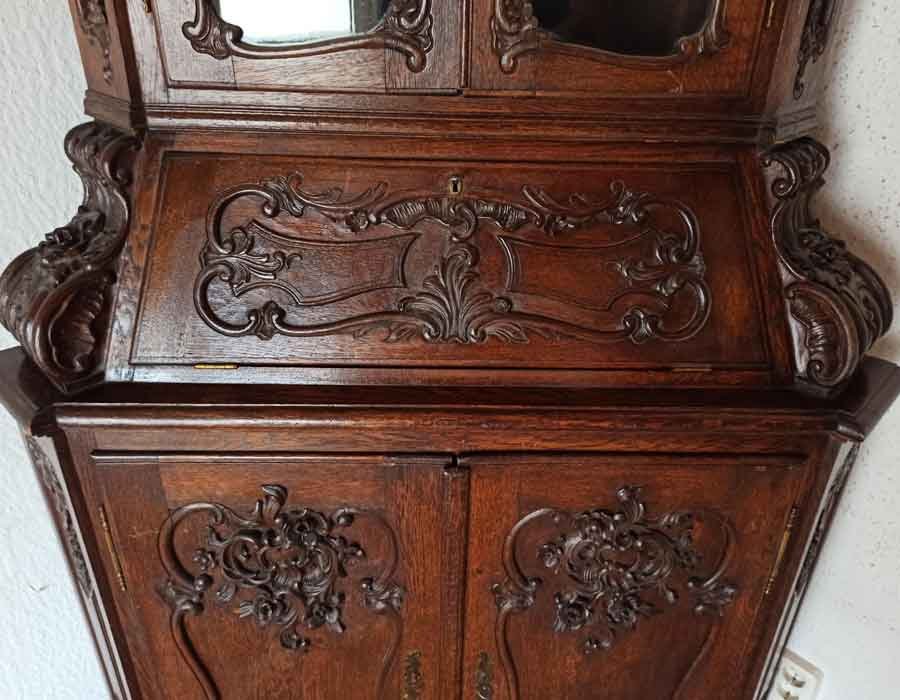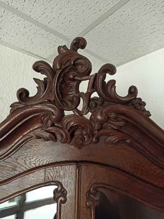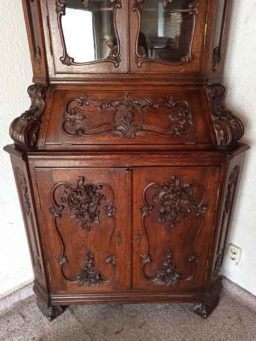Reserviert!!Eckschrank mit Vitrinenaufsatz um 1900, Gründerzeit im Barockstil. Eiche. Sehr schöne, aufwändige Schnitzereien. Innen mit Einlegeböden.