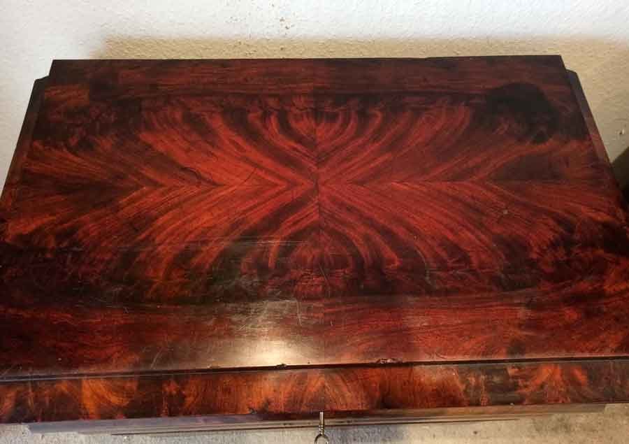 Gestufte Platte und gerundete Ecken, Schubkästen leicht geschwungen. Sehr schönes Mahagoni Furnier.