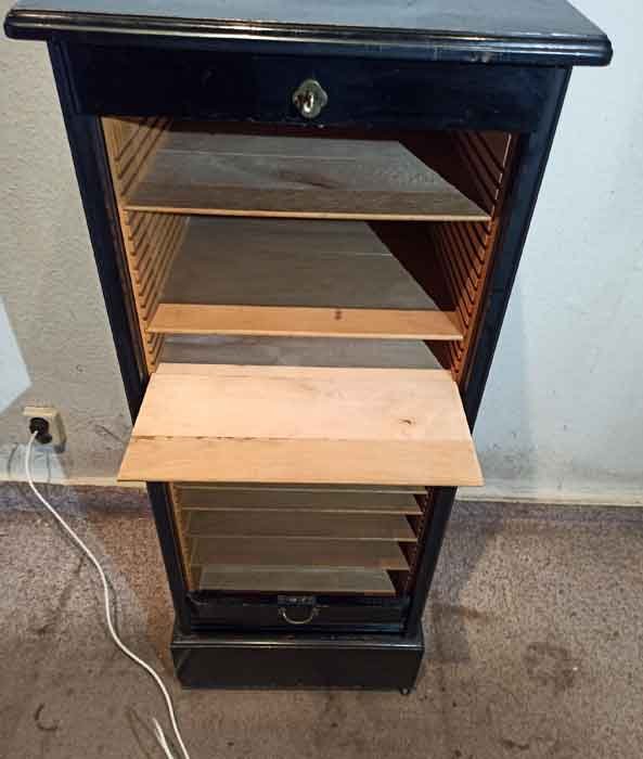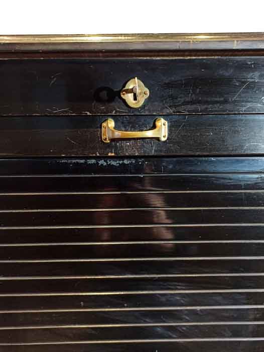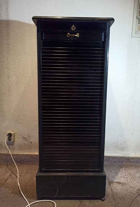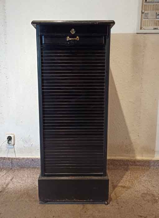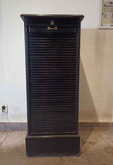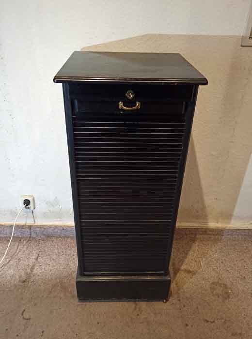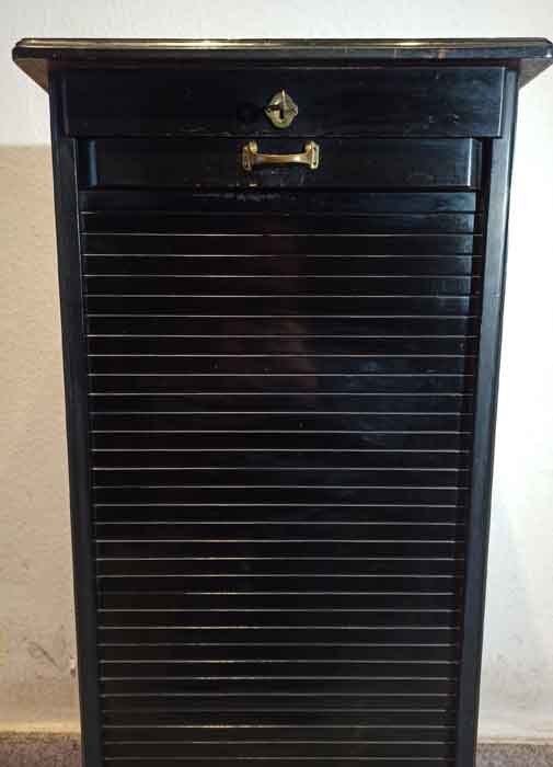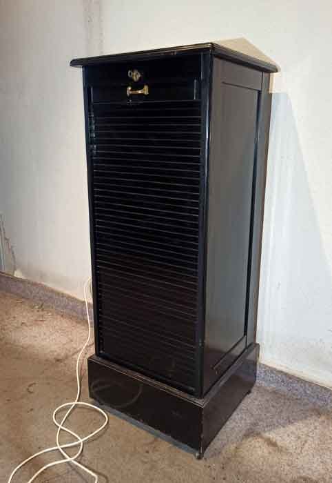 Aktenschrank, Rollladenschrank 1910-30. Guter original Zustand, original schwarze Politur mit Nutzungsspuren, Rollladen geht teilw. etwas sperrig, Schlüssel vorhanden. Innen mit 9x höheneverstellbaren Einschiebeböden.