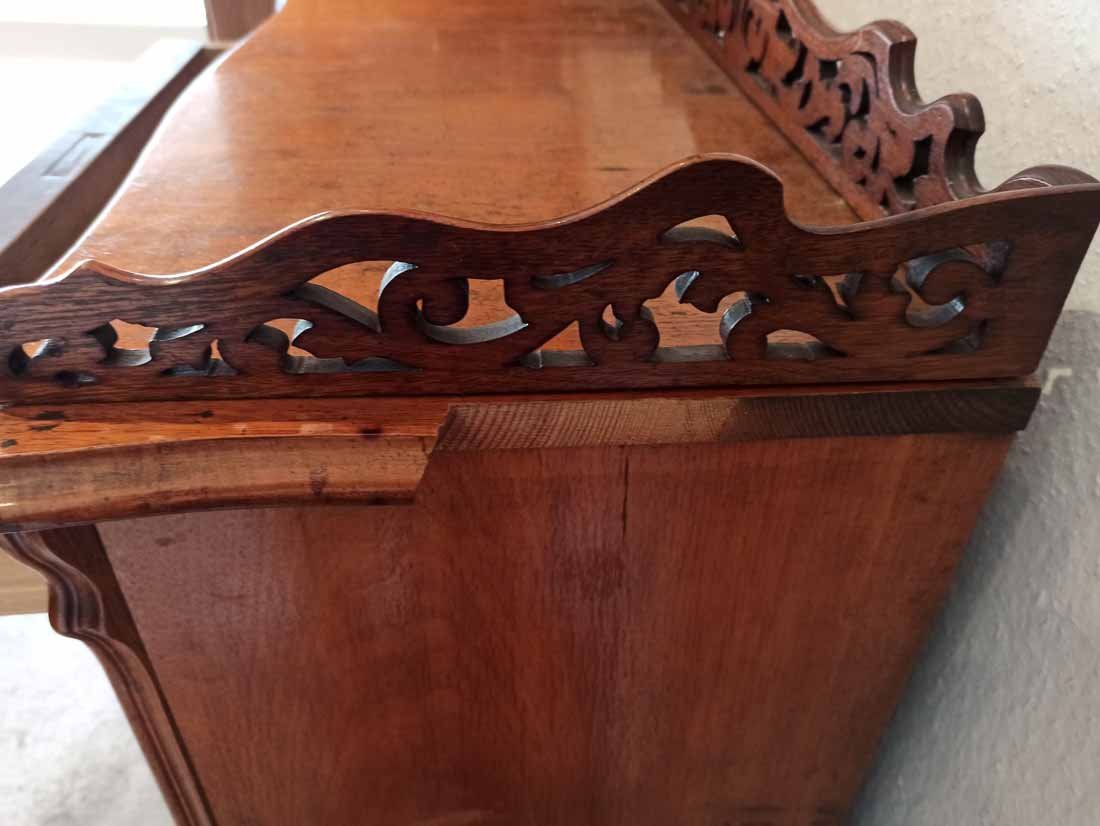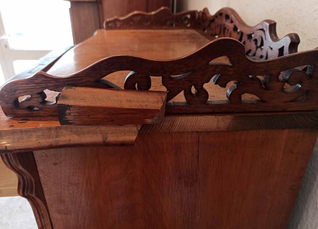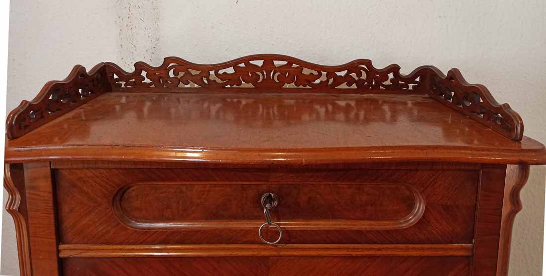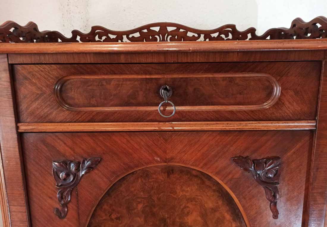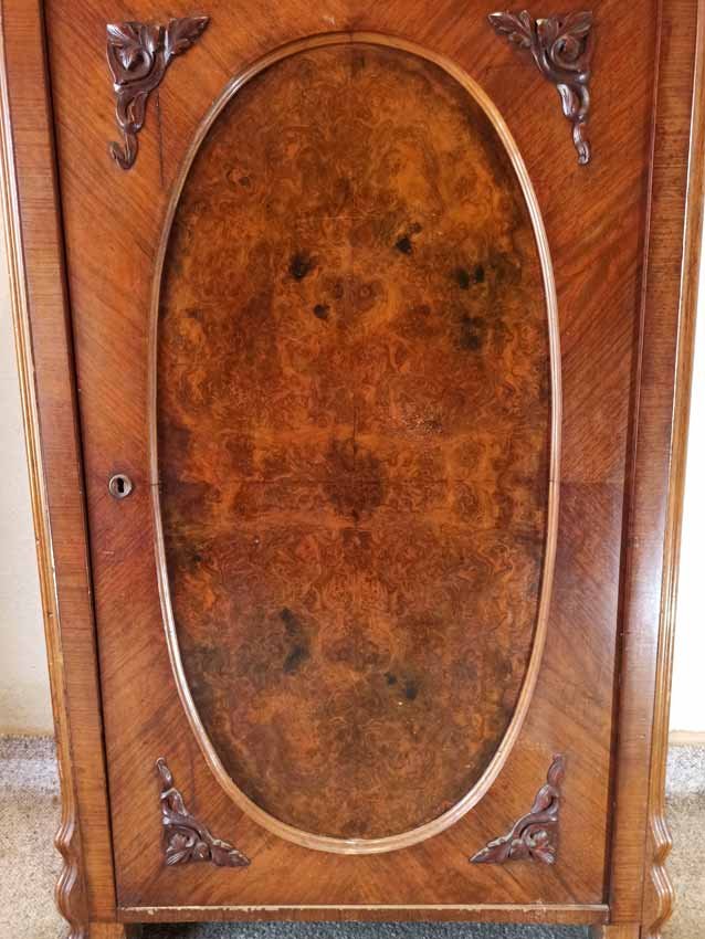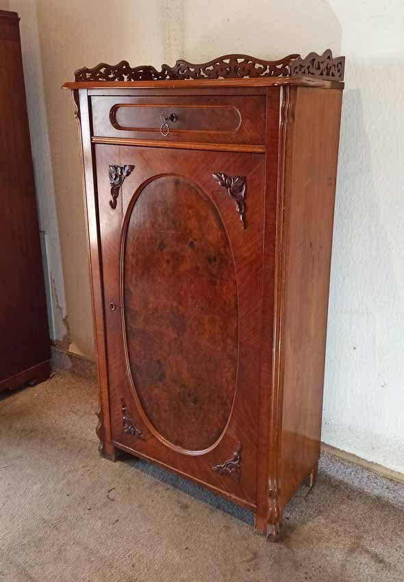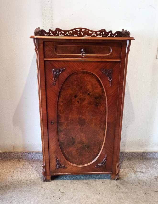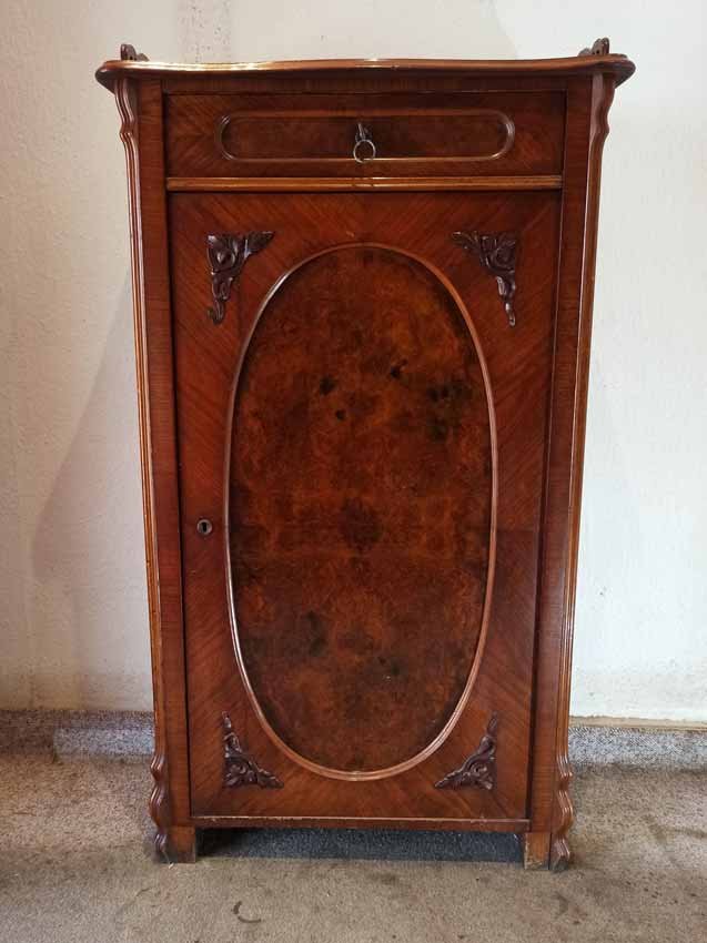 Kleiner Schrank, Vertiko, Spätbiedermeier um 1860, Nuß und Nußwurzelholz. Eintüriger Schrank oben ein Schubkasten. Platte oben seitl. rechts Kante ausgesägt, Fehlteile teilw. vorhanden. Ein Fuß lose. Sonst guter, nutzbarer Zustand. H. 140, B. 80, T. 38 cm.