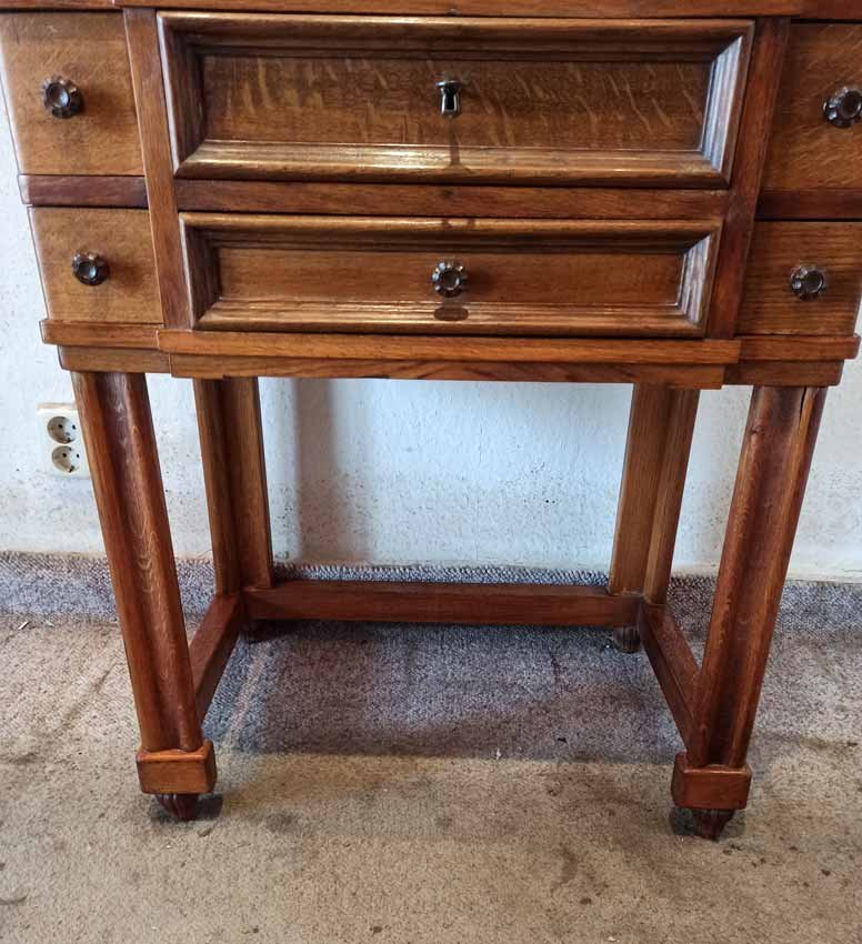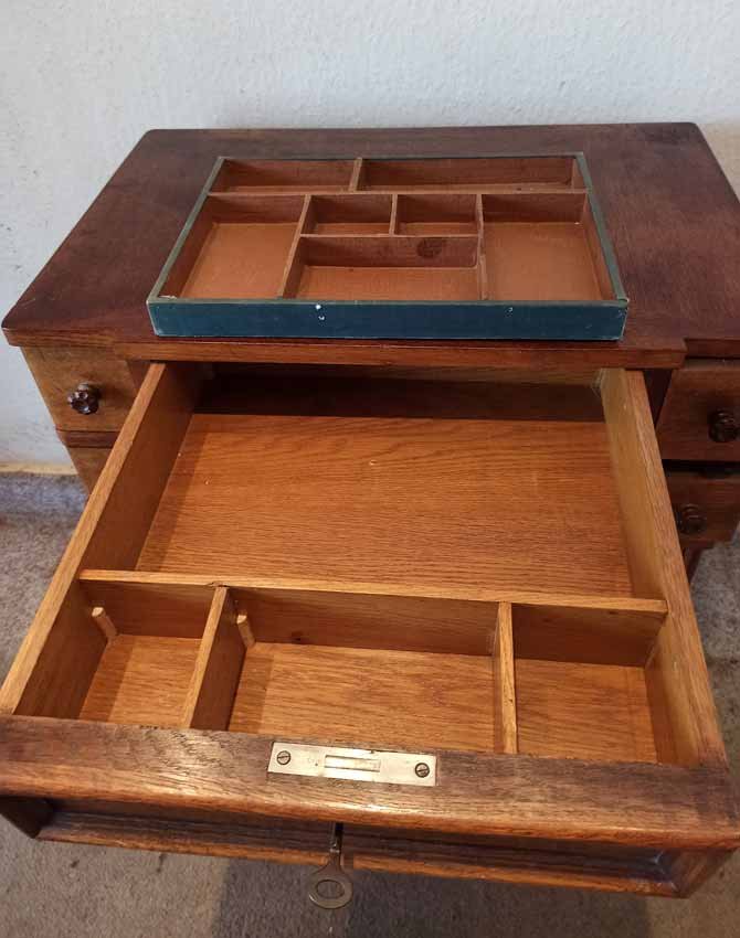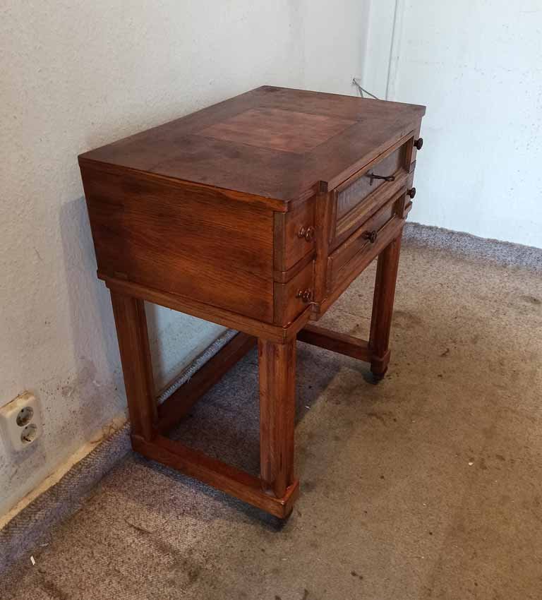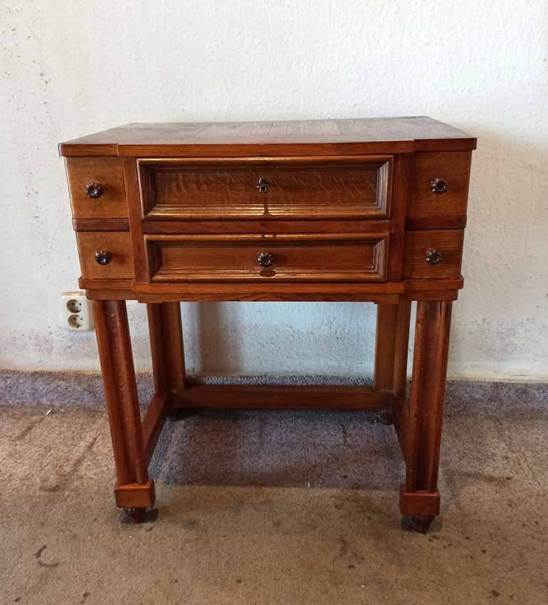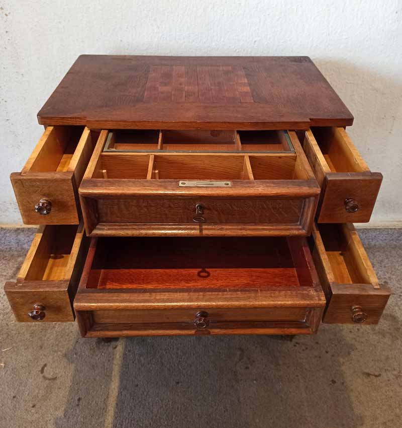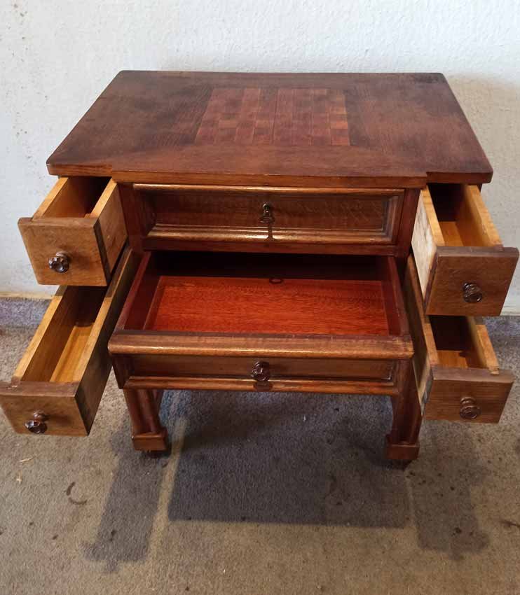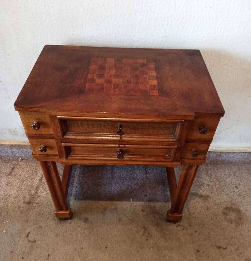 Beistelltisch, Näh- oder Spieltisch. In der Platte eingelegtes Schachbrett. 4x kleine Schubkästen außen, zwei große in der Mitte mit Inneneinteilung. Guter Zustand. H. 74,5 cm, B. 63 cm, T. 42 cm.