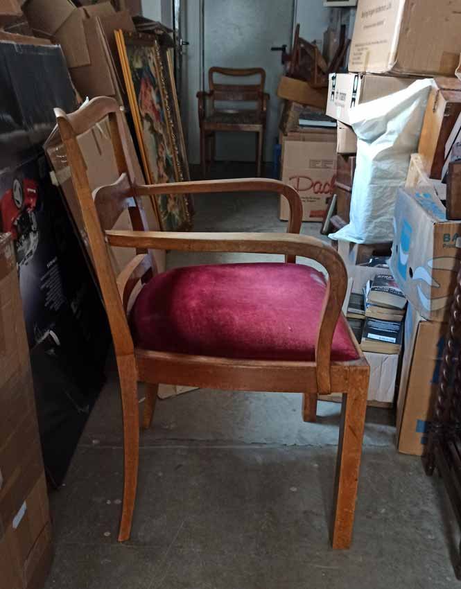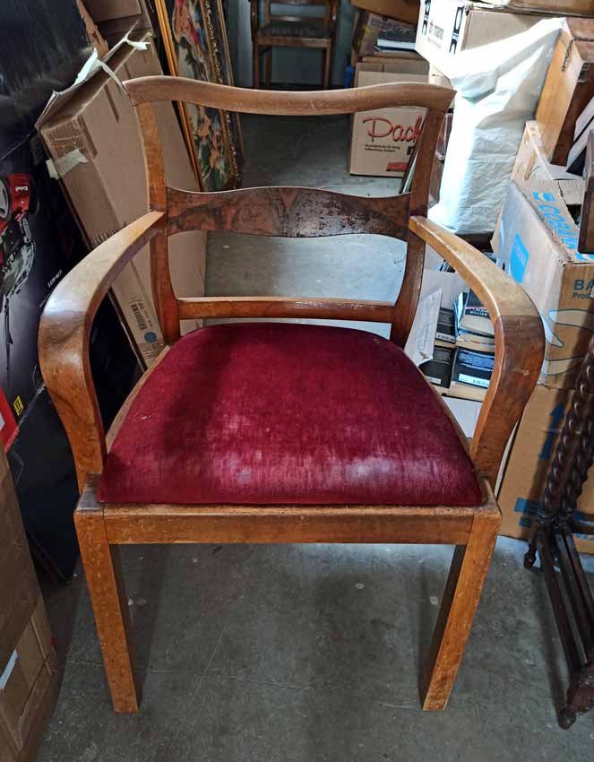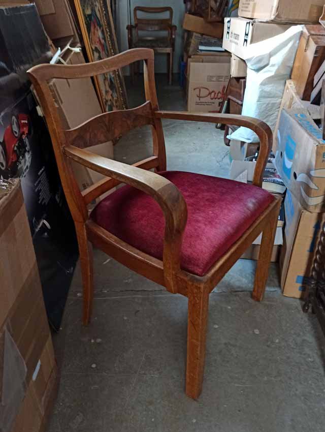 Stuhl mit Armlehnen um 1920-30. Als Paar oder einzeln., 2x vorhanden. Z.T. mit etwas Reparaturbedarf. H. 85/ 48 cm, B. 60 cm, T.47 cm. Preis für 1x.