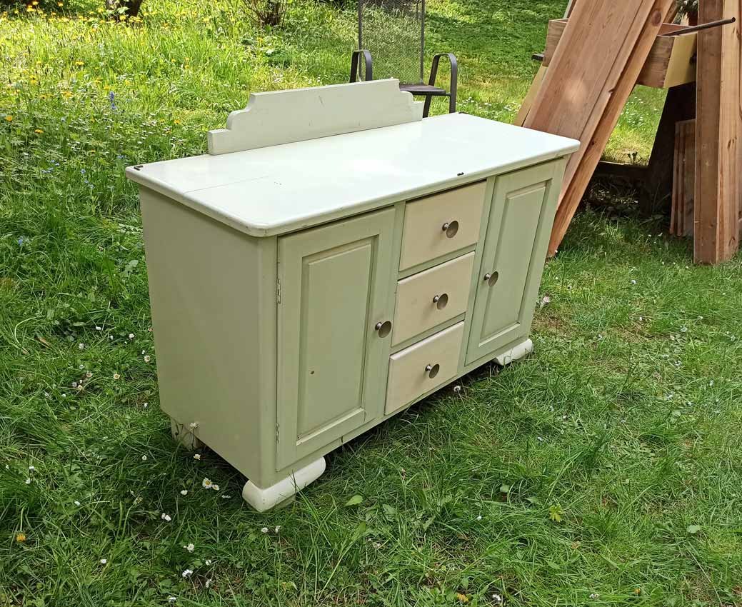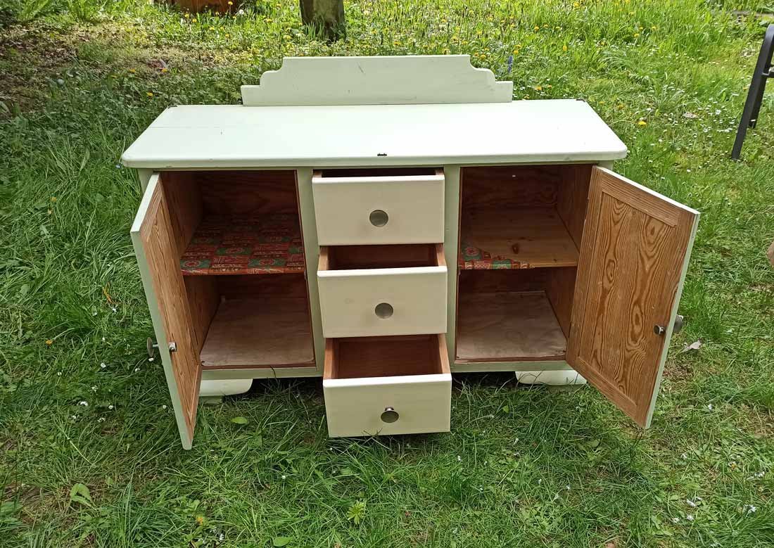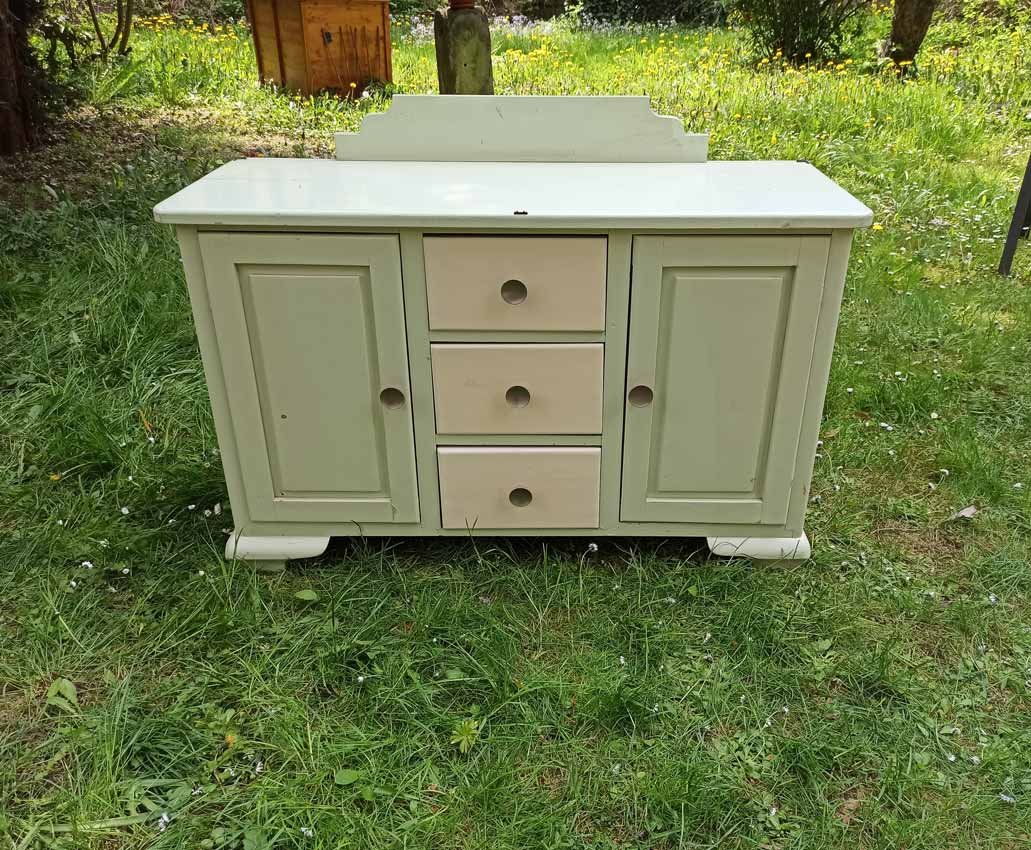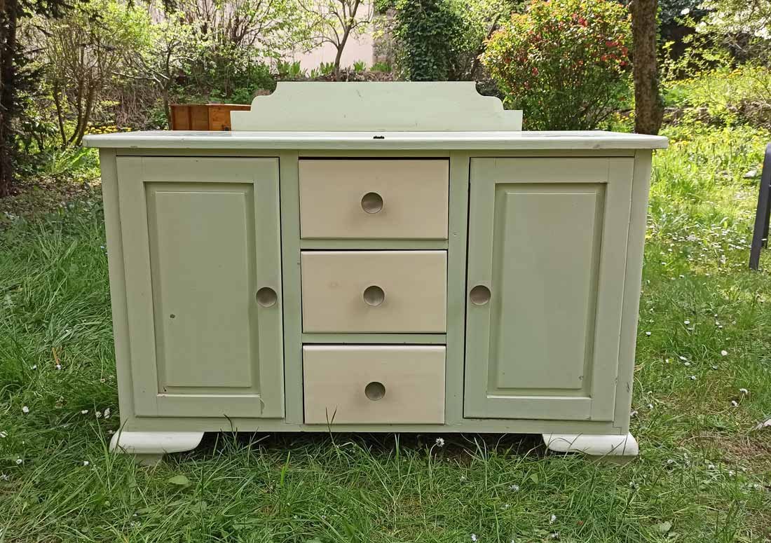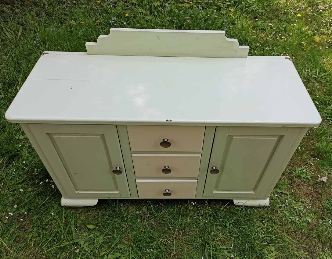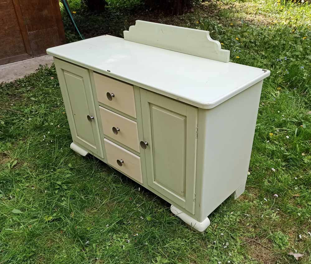 Kommode, Kleinmöbel um 1910, zwischenzeitl. neu "gefasst". Geringer Reparaturbedarf, prinzipiell sofort nutzbar. H. 70/83 cm, B. 113 cm, T. 43 cm.