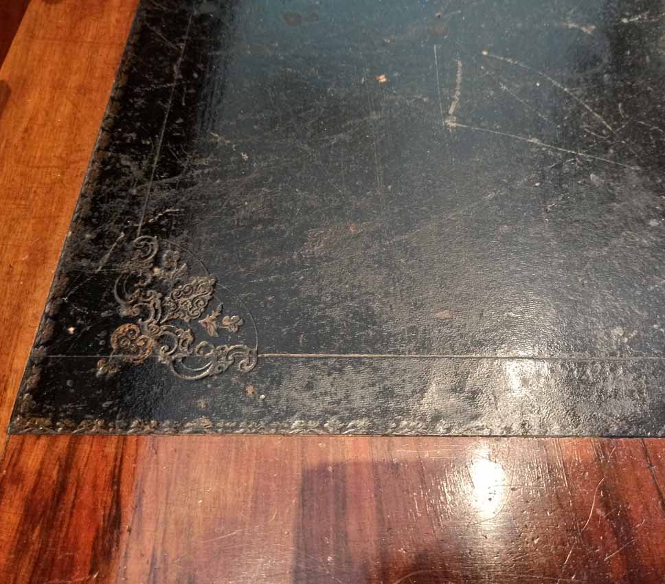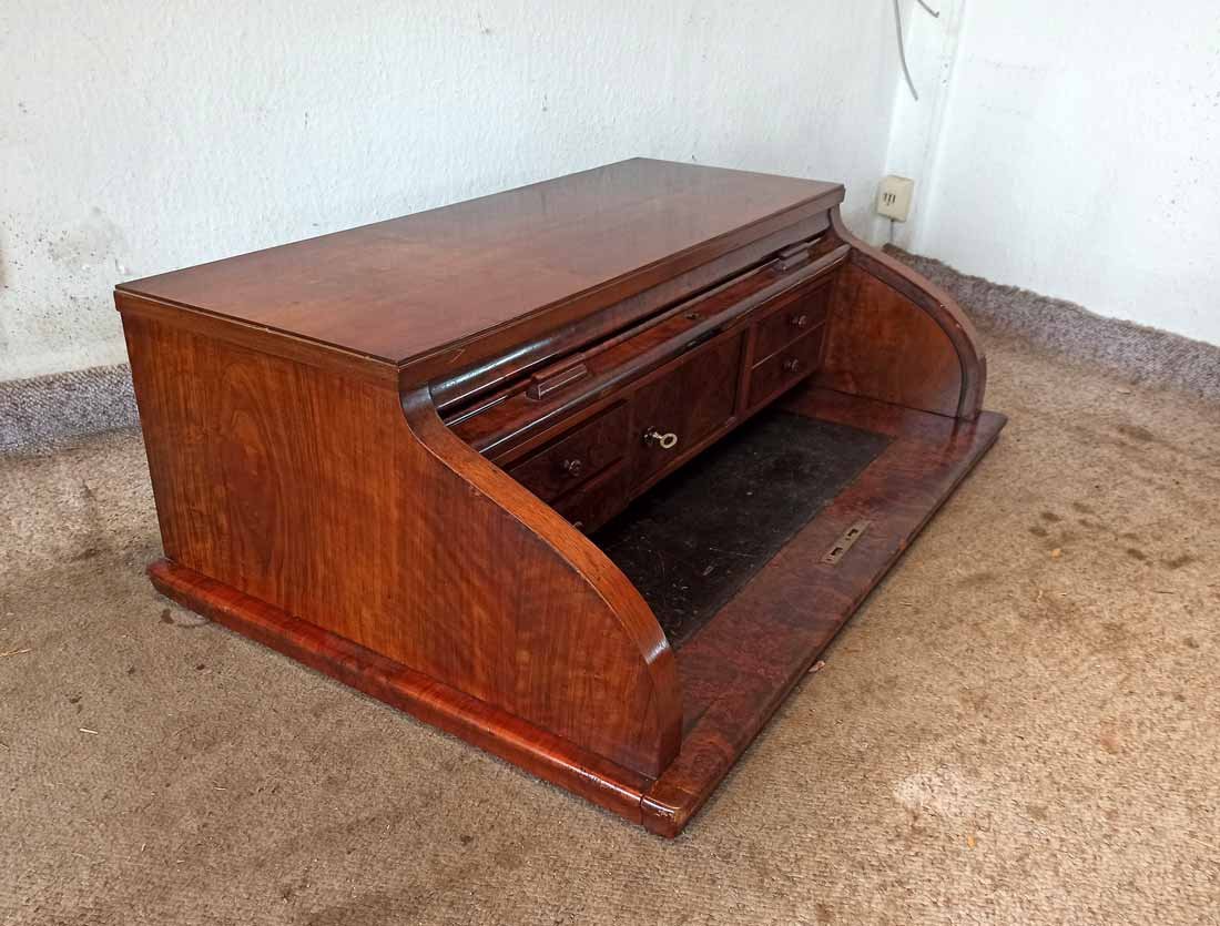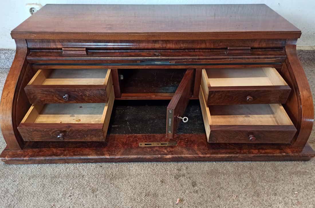 Roll-Laden Aufsatz eines Biedermeier Sekretärs ca 1850. Nussbaum, hinter dem Rollladen Verschluss 4x Schubkästen und ein verschließbares Fach. Schreibplatte ausziehbar mit geprägtem Leder. Sehr guter Zustand, Rollade läuft einwandfrei. B. 97 cm, T. 62/86 cm, H.33 cm.