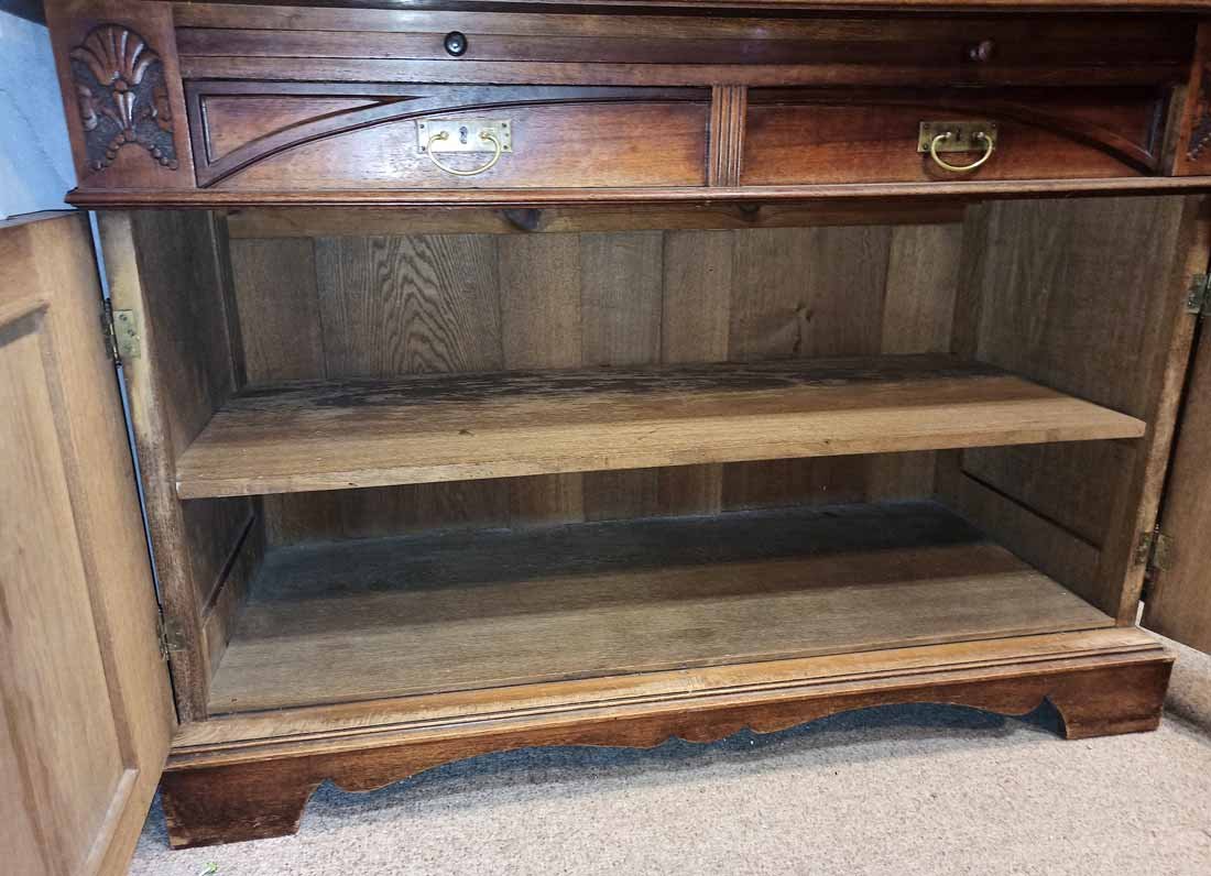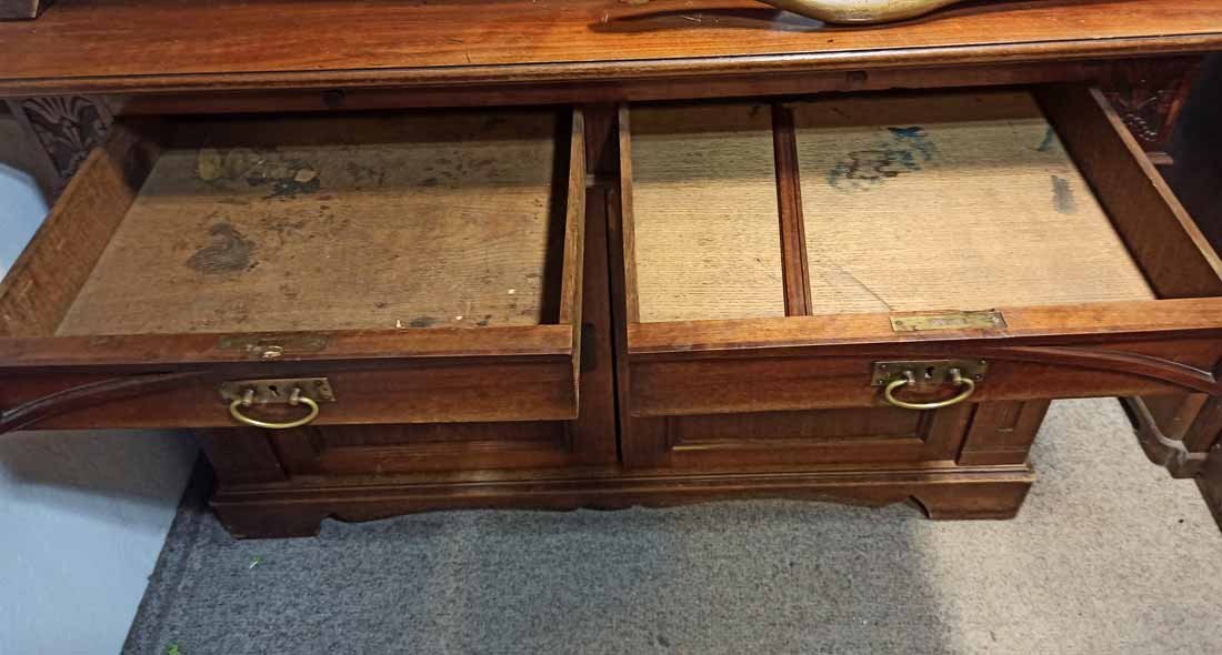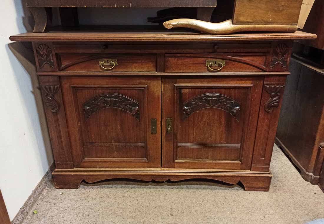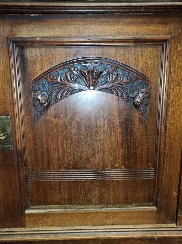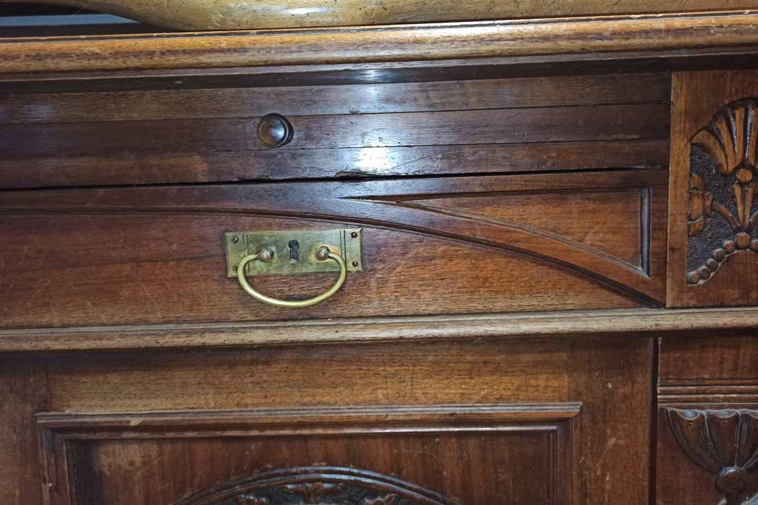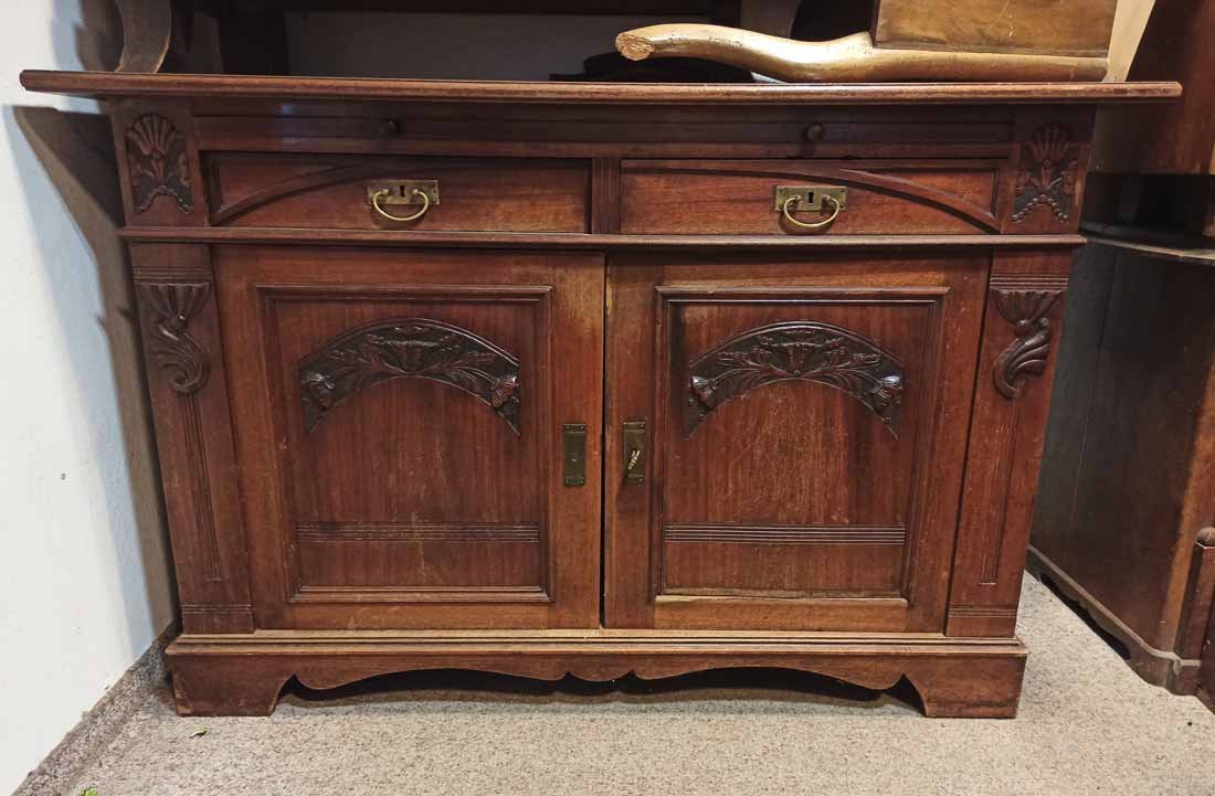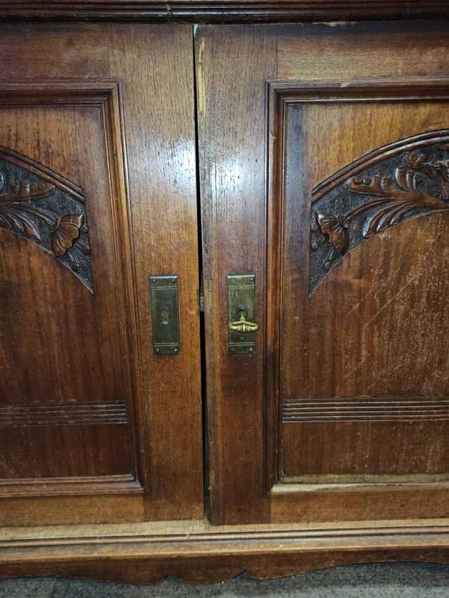 Jugendstil Anrichte, Sideboard um 1900. Zustand siehe Fotos mit Gebrauchsspuren und Mängeln aber durchaus sofort nutzbar. Fehlteile, Leiste zum teil vorhanden.