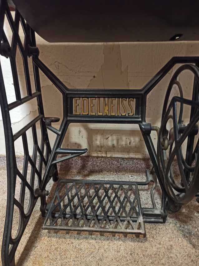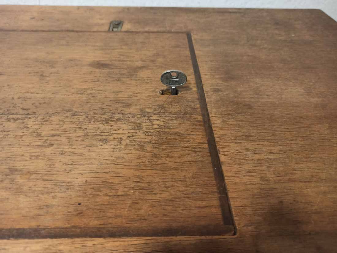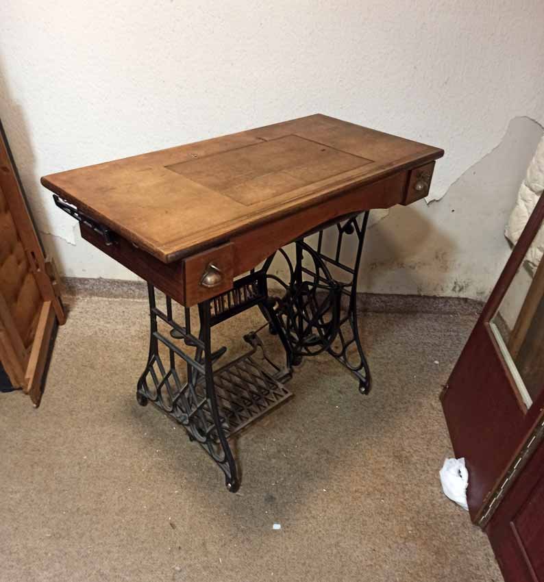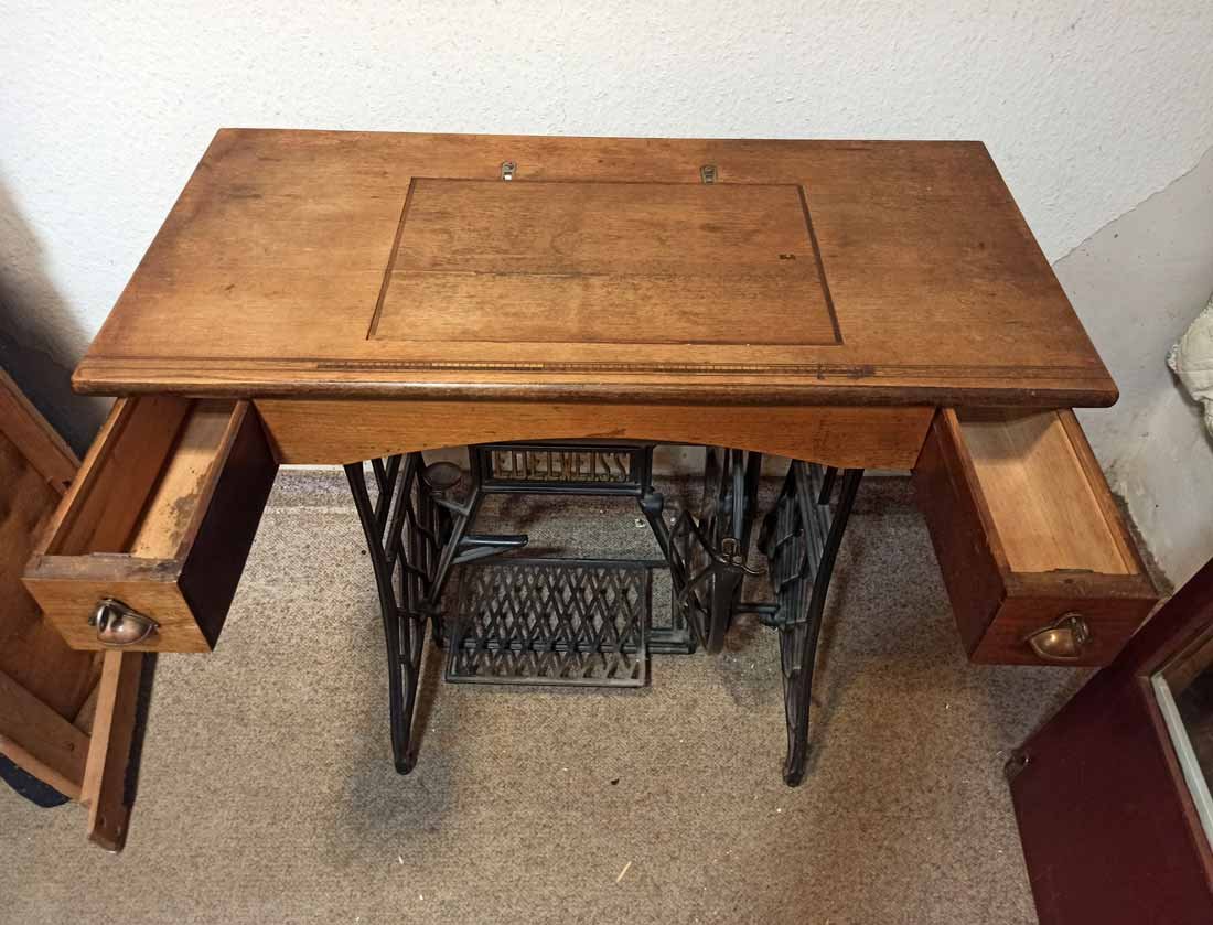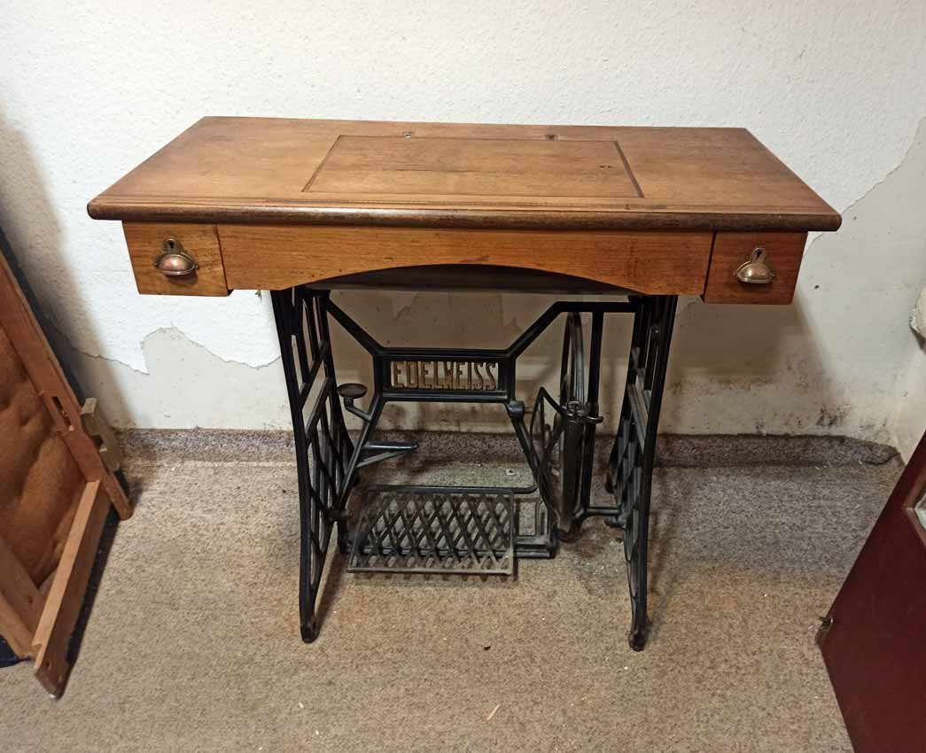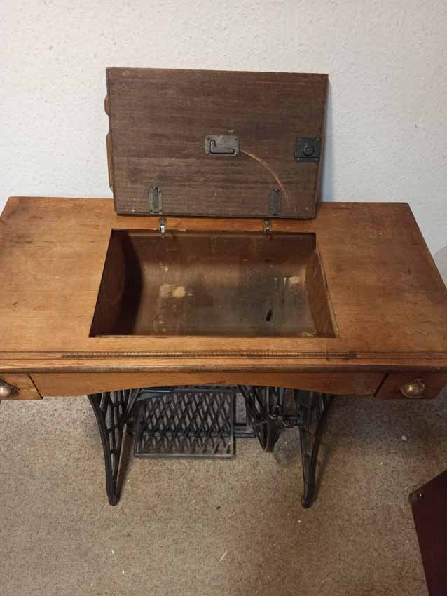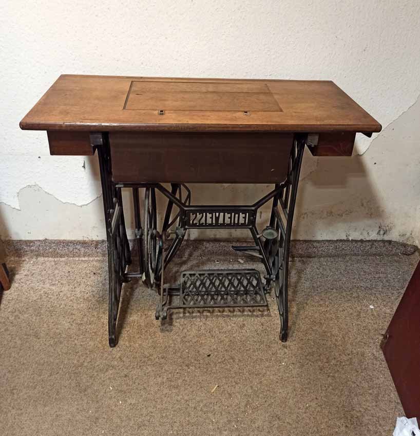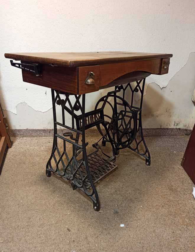 Nähmaschinengestell mit Platte als Tisch oder Schreibtisch. Rechts und Links je ein kleiner Schubkasten. Unter der Platte ein Fach. Alle Fächer abschließbar.