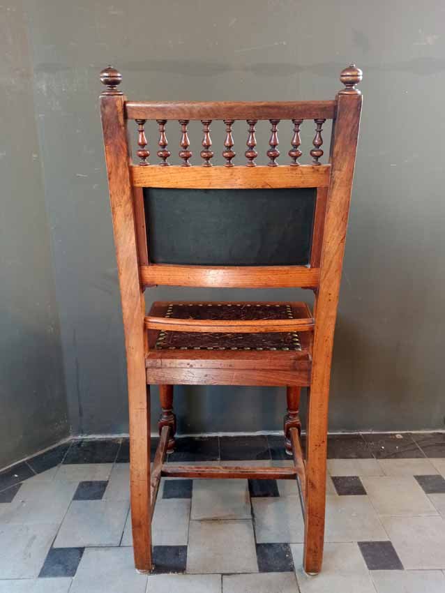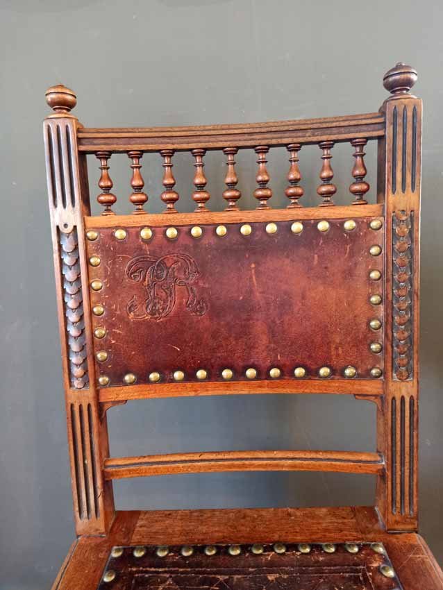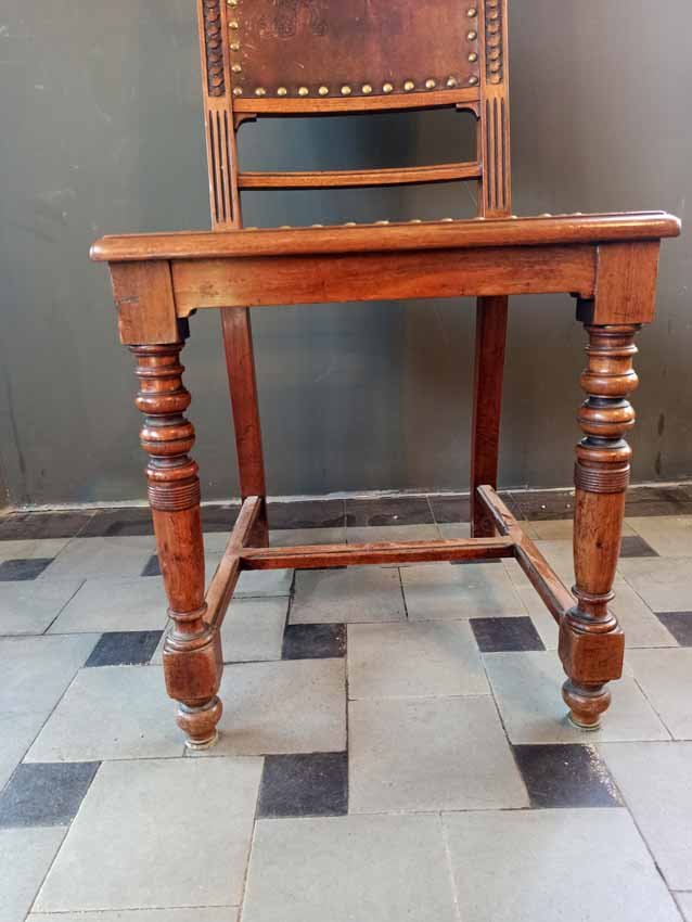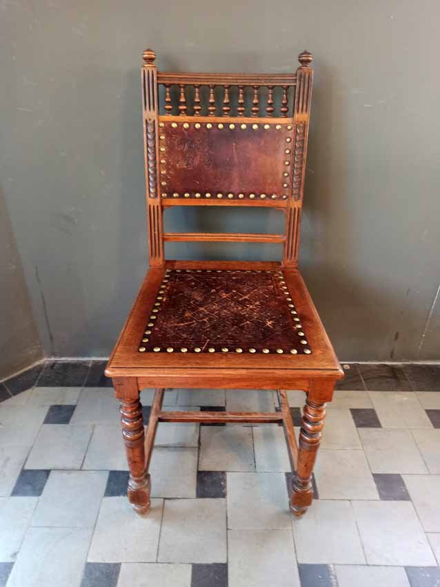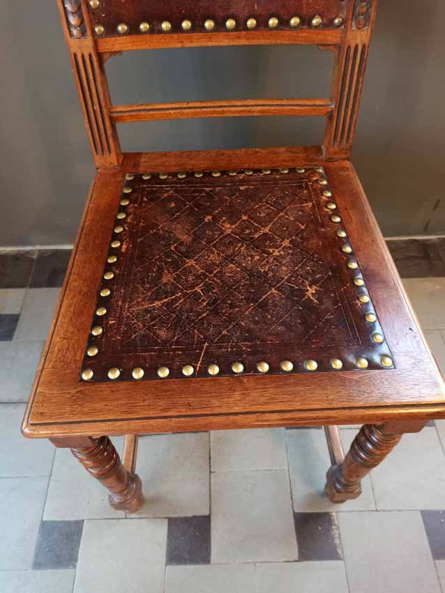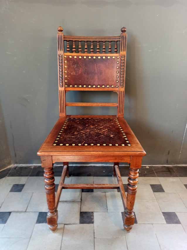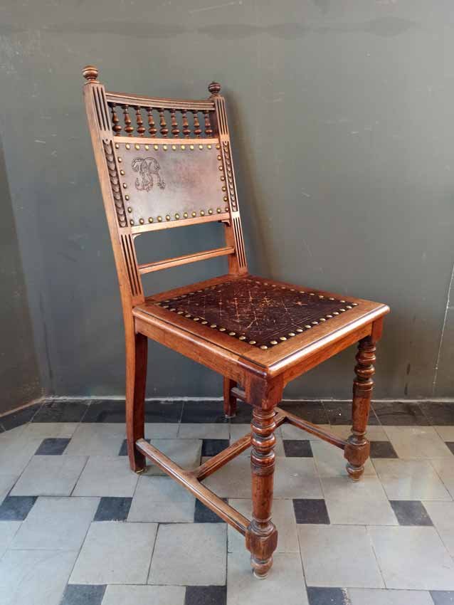 Stuhl um 1880 mit Lederbezug, geprägt. Guter Zustand mit normalen Gebrauchsspuren. Guter Zustand, nutzbar.